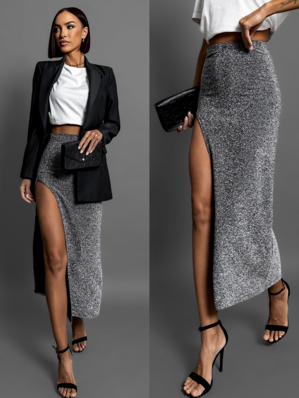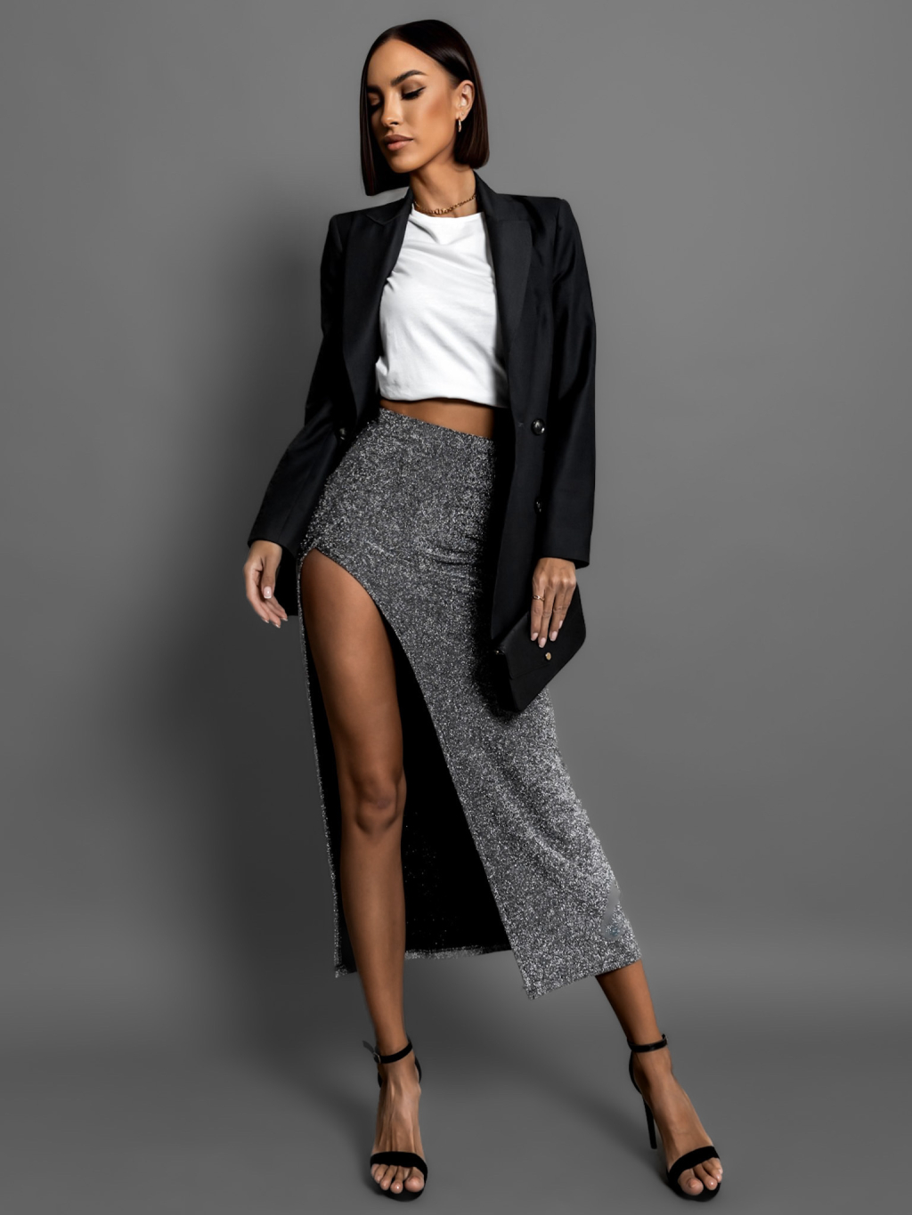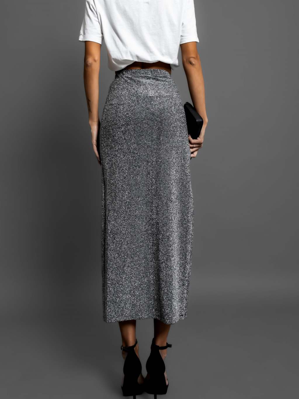 Stříbrná třpytivá sukně KAYSERI s rozparkem