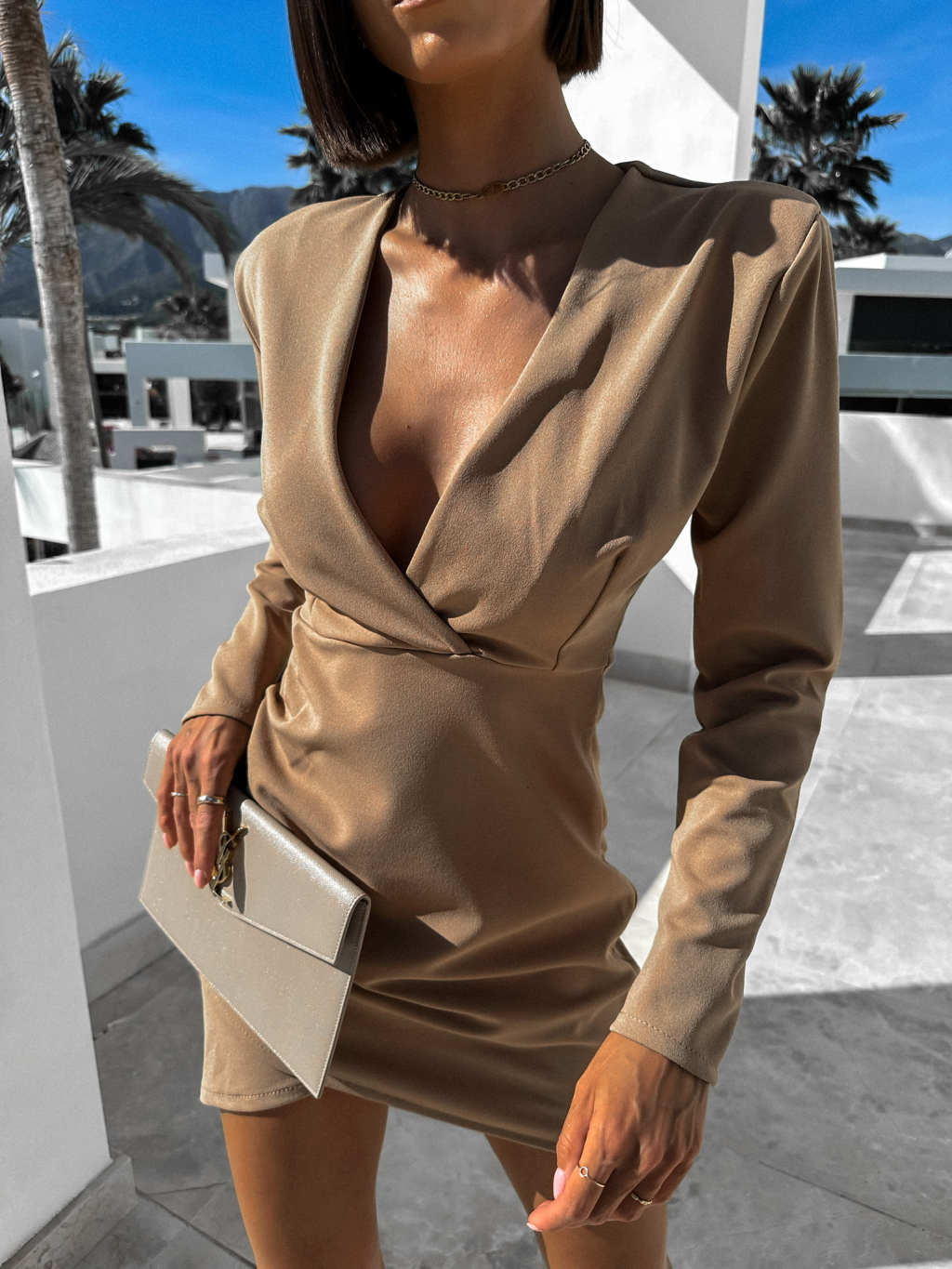 Světle hnědé elegantní šaty VERBENA s výstřihem do V