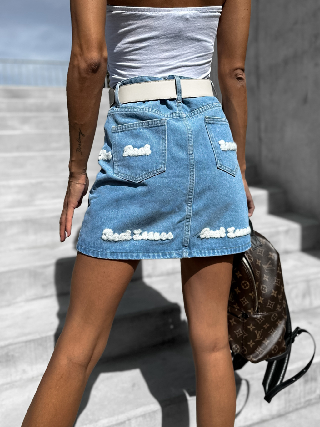 Světle modrá denim sukně BLASTI s potiskem
