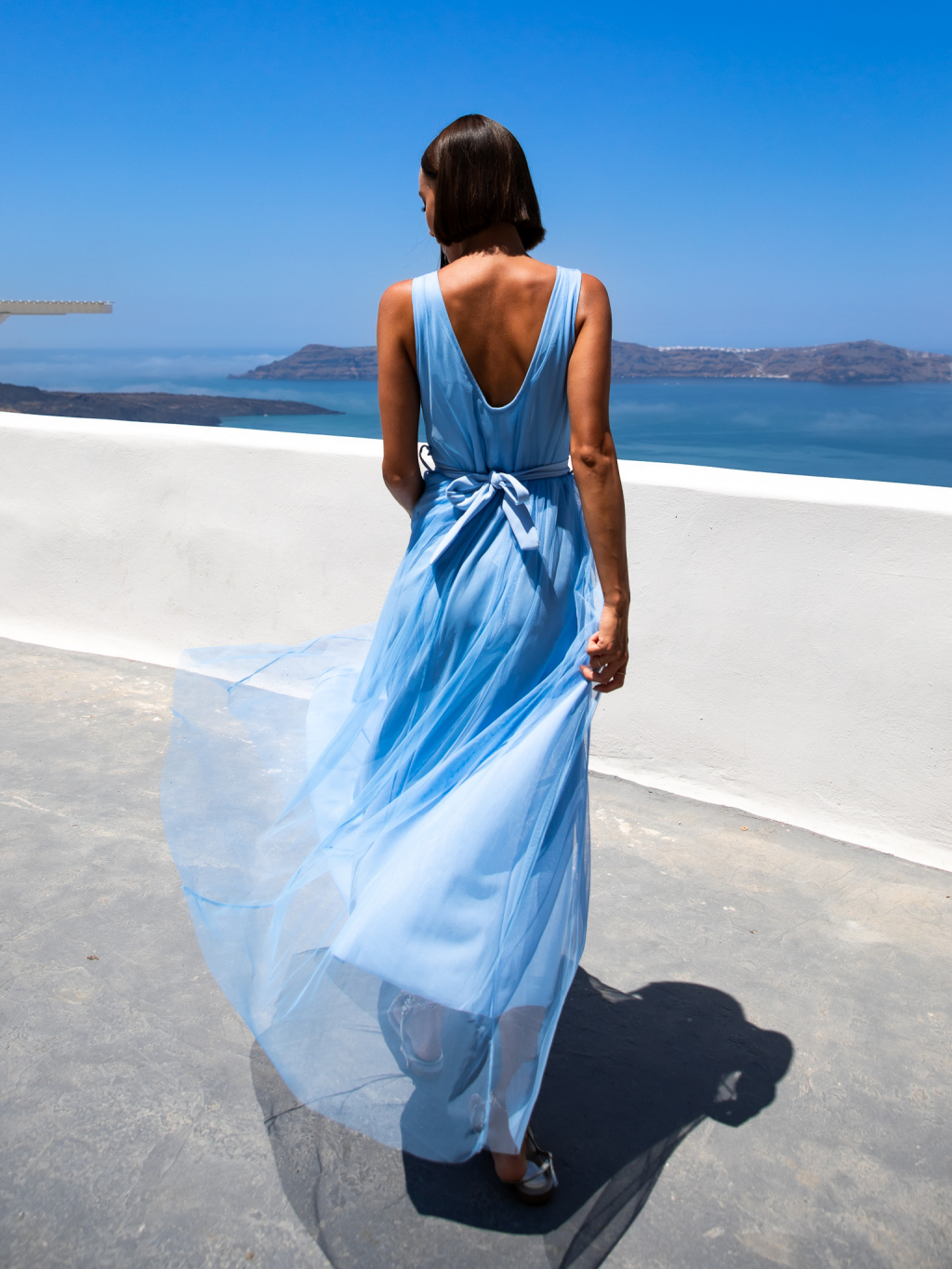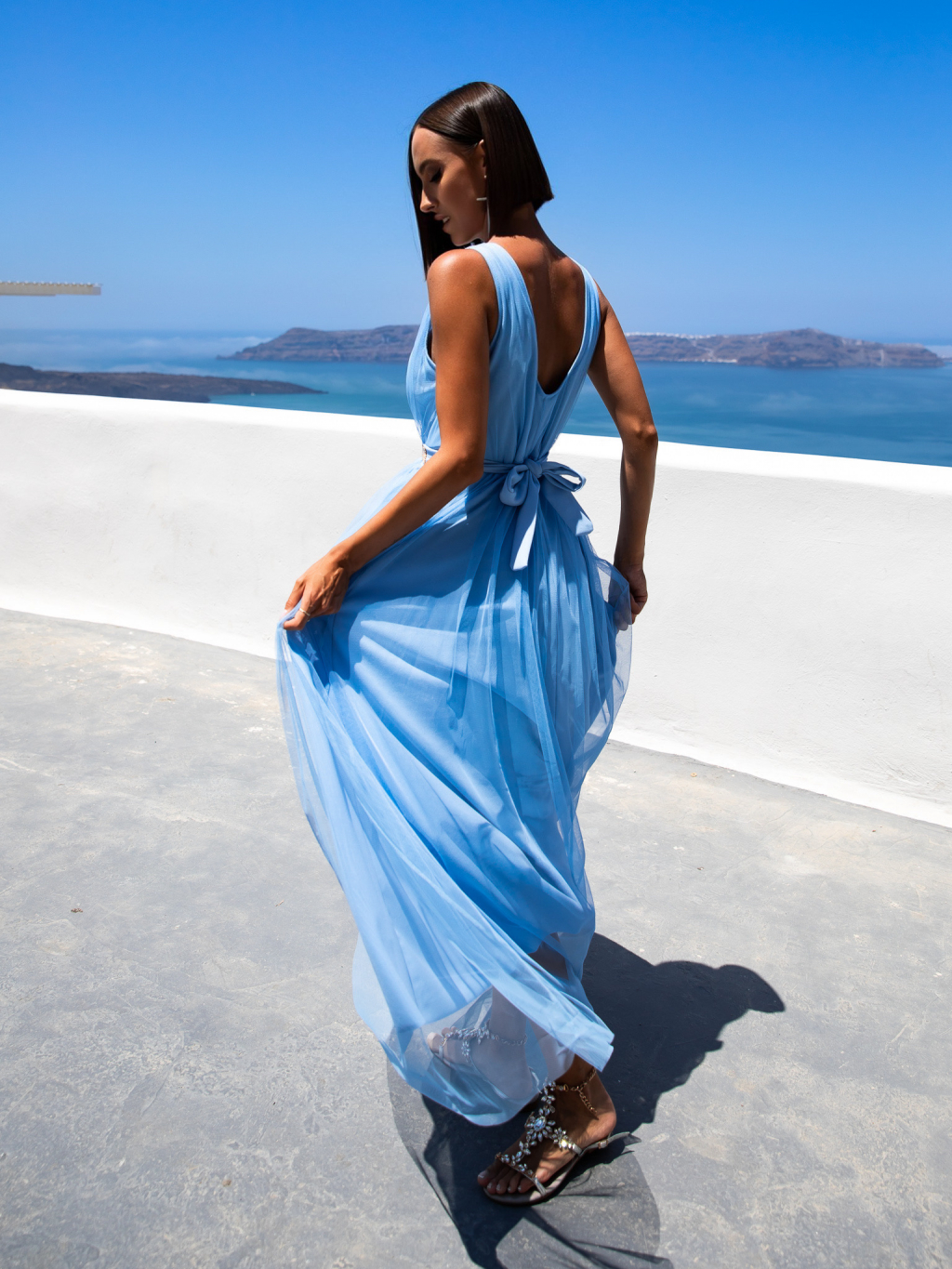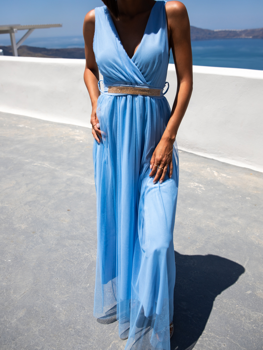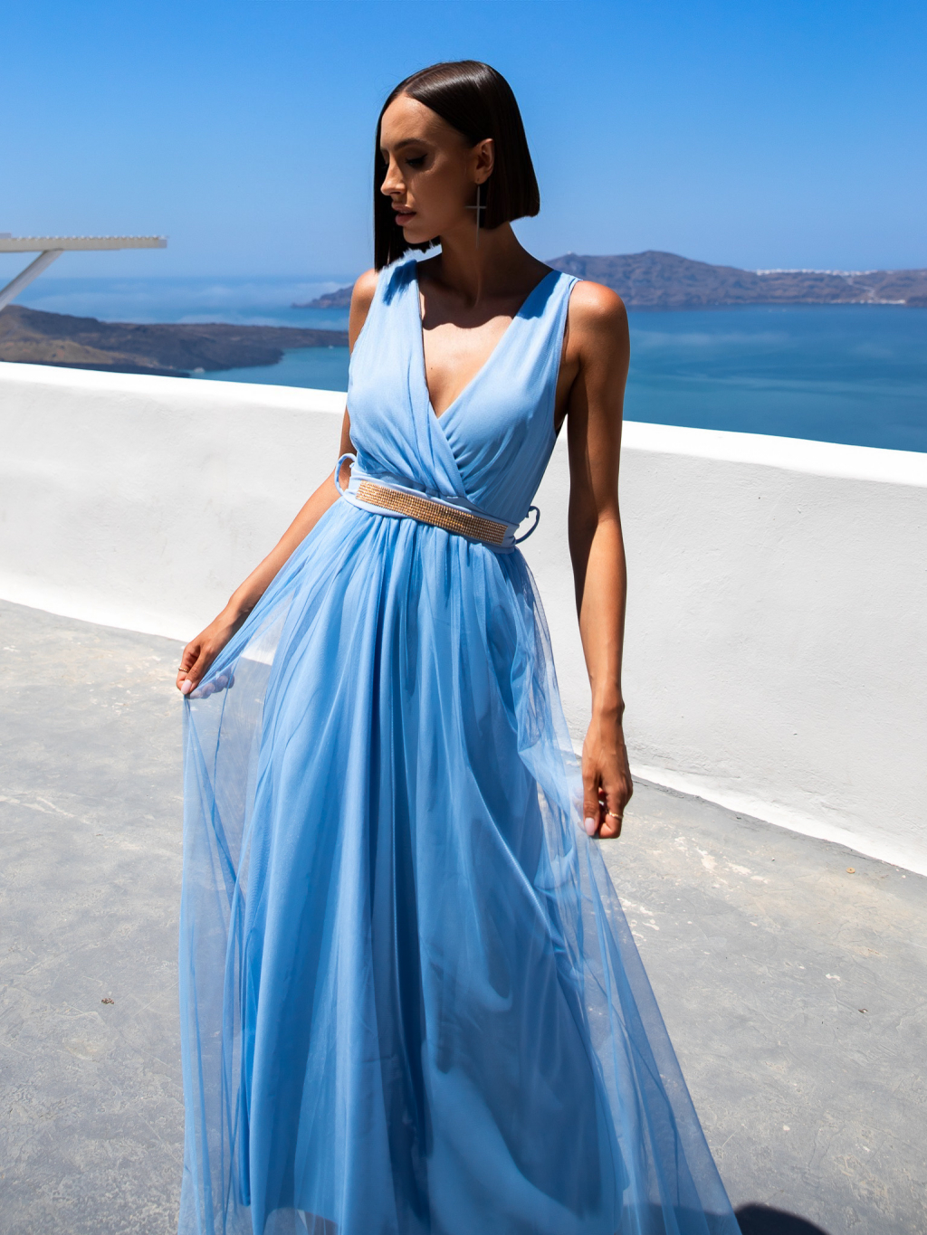 Světle modré dlouhé elegantní šaty WEEP se štrasovým opaskem