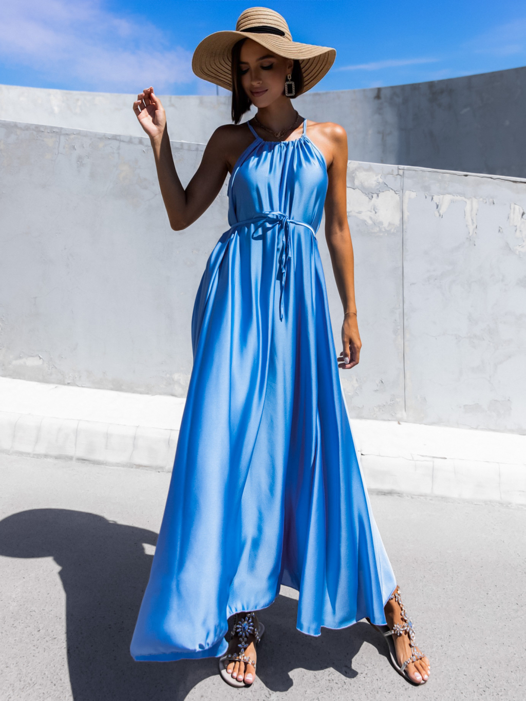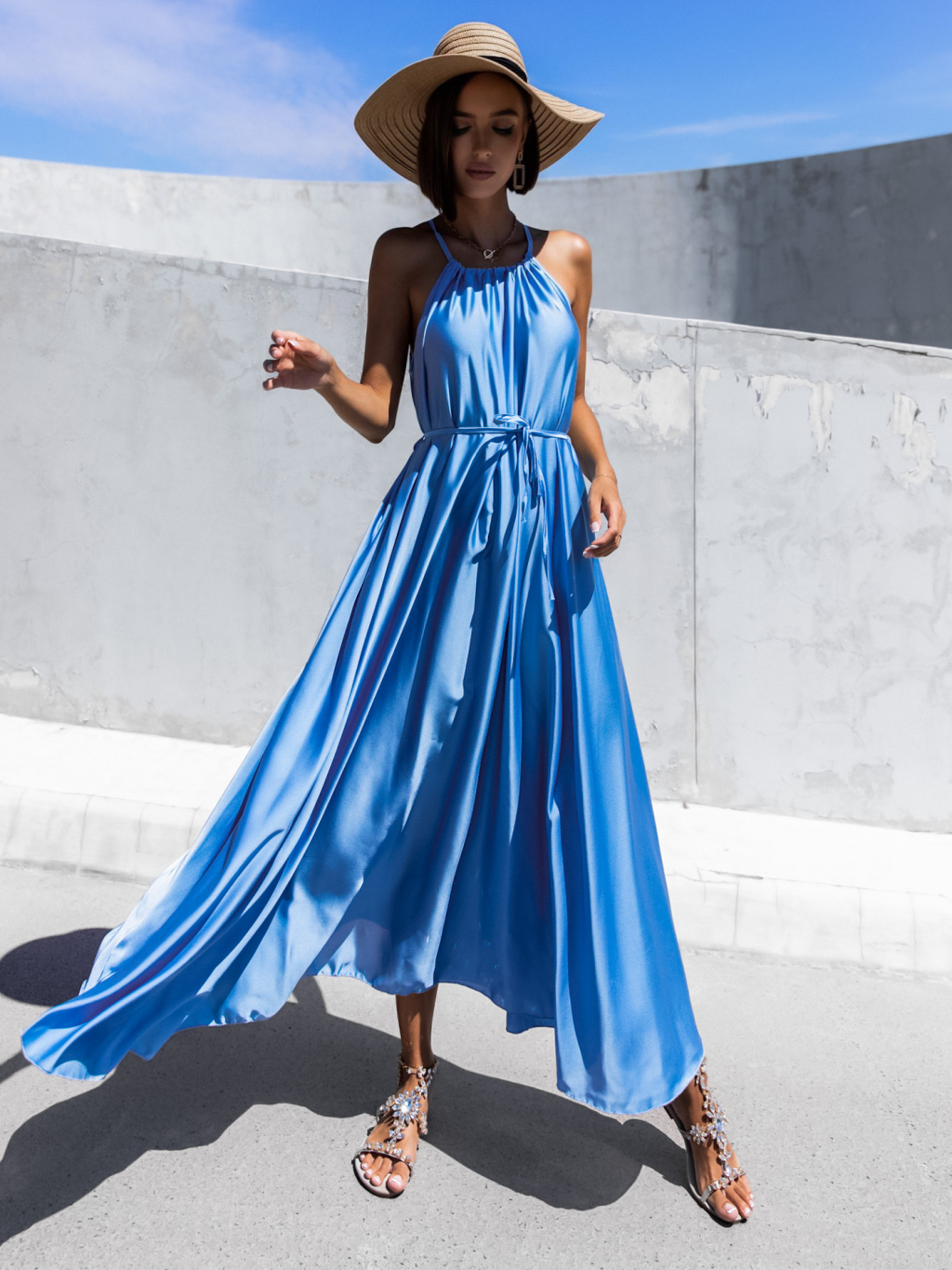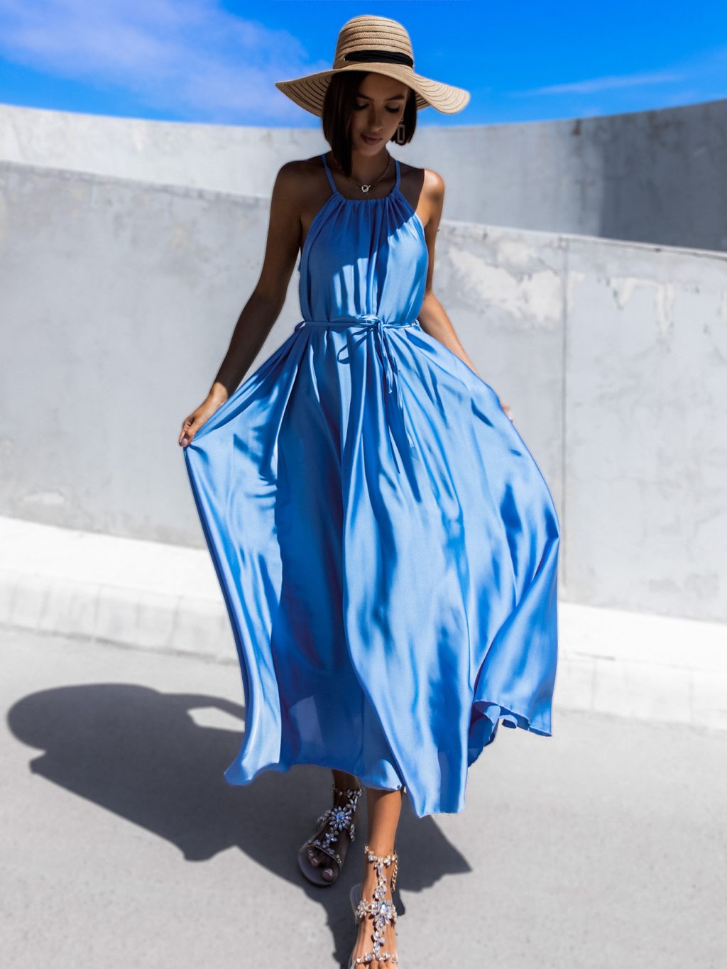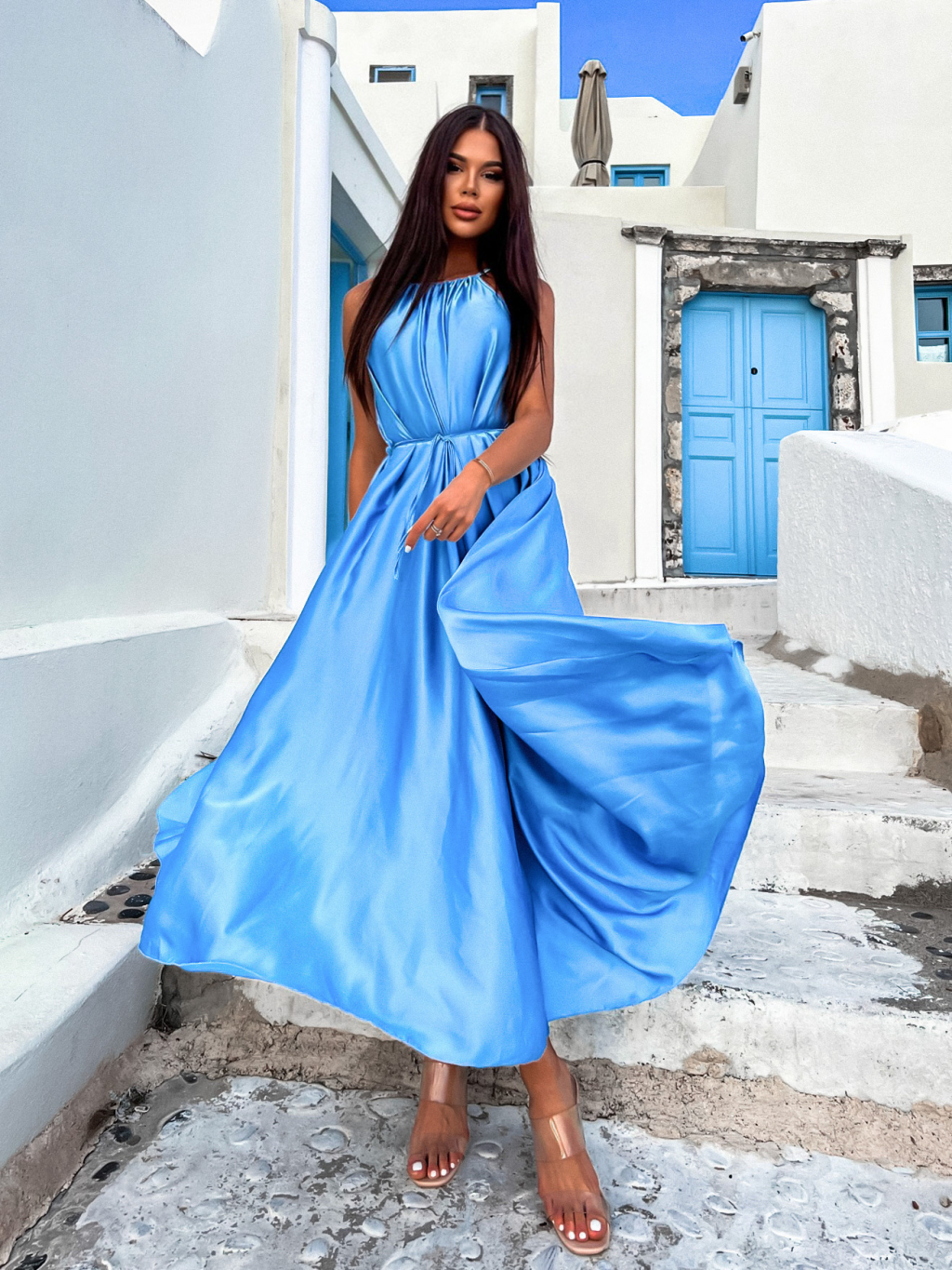 Světle modré dlouhé lesklé elegantní šaty MADES se zavazováním