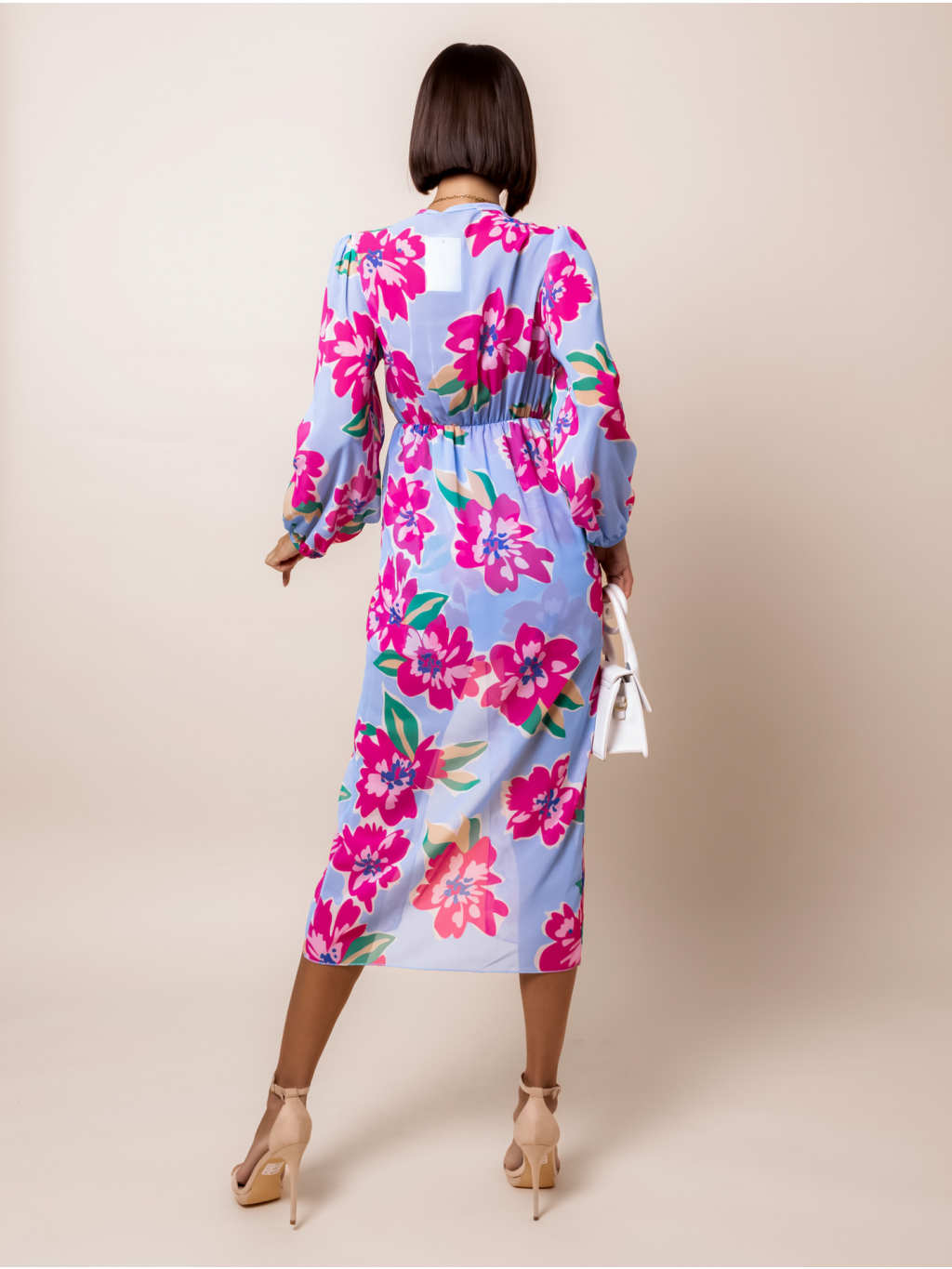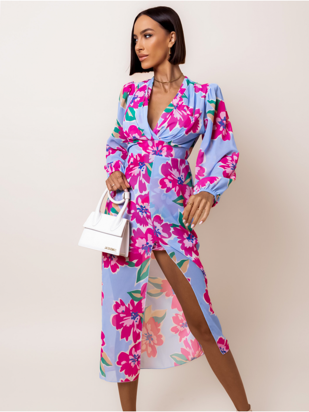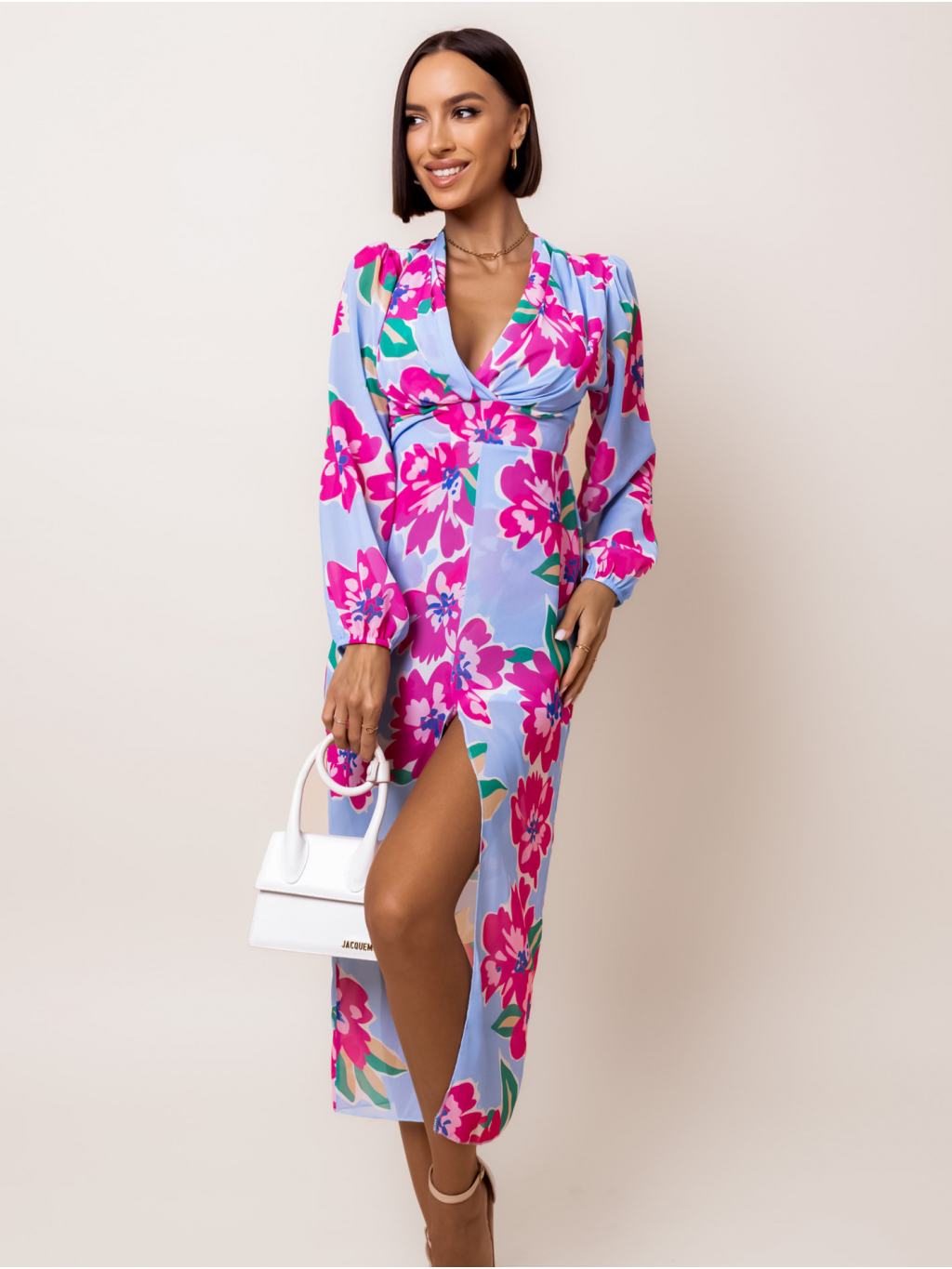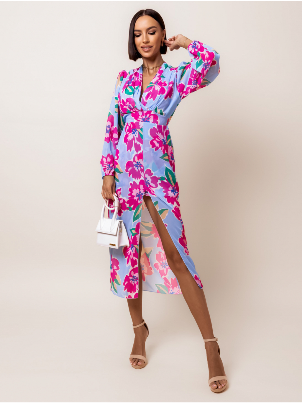 Světle modré květinové elegantní šaty DALIS s výstřihem do V