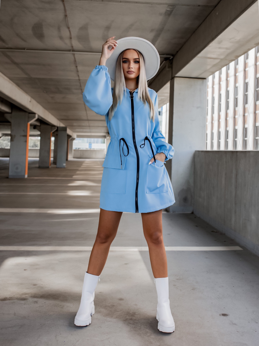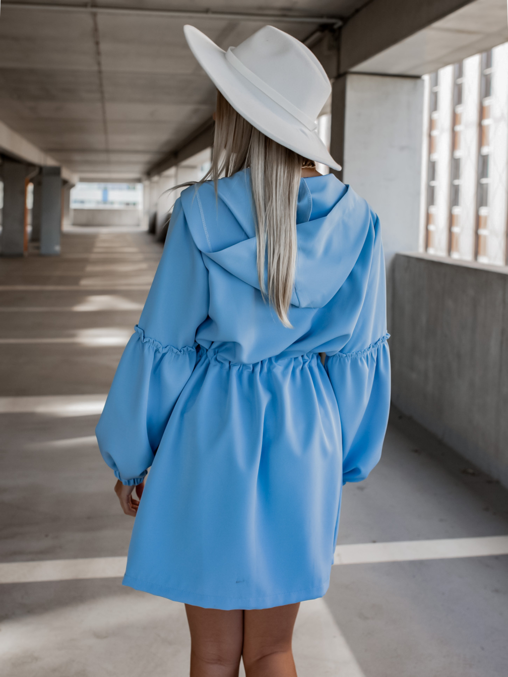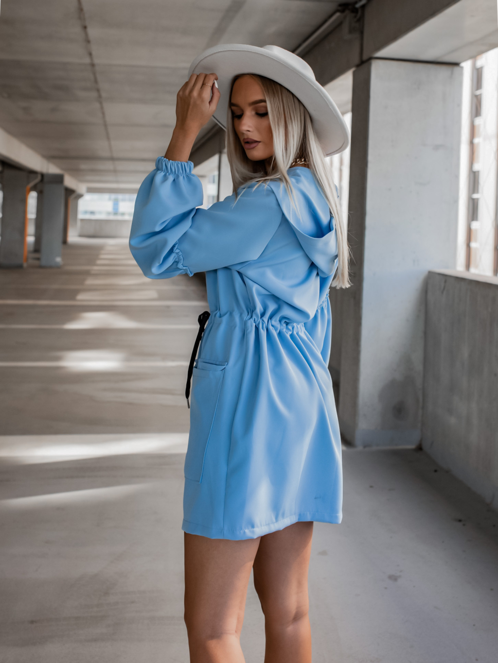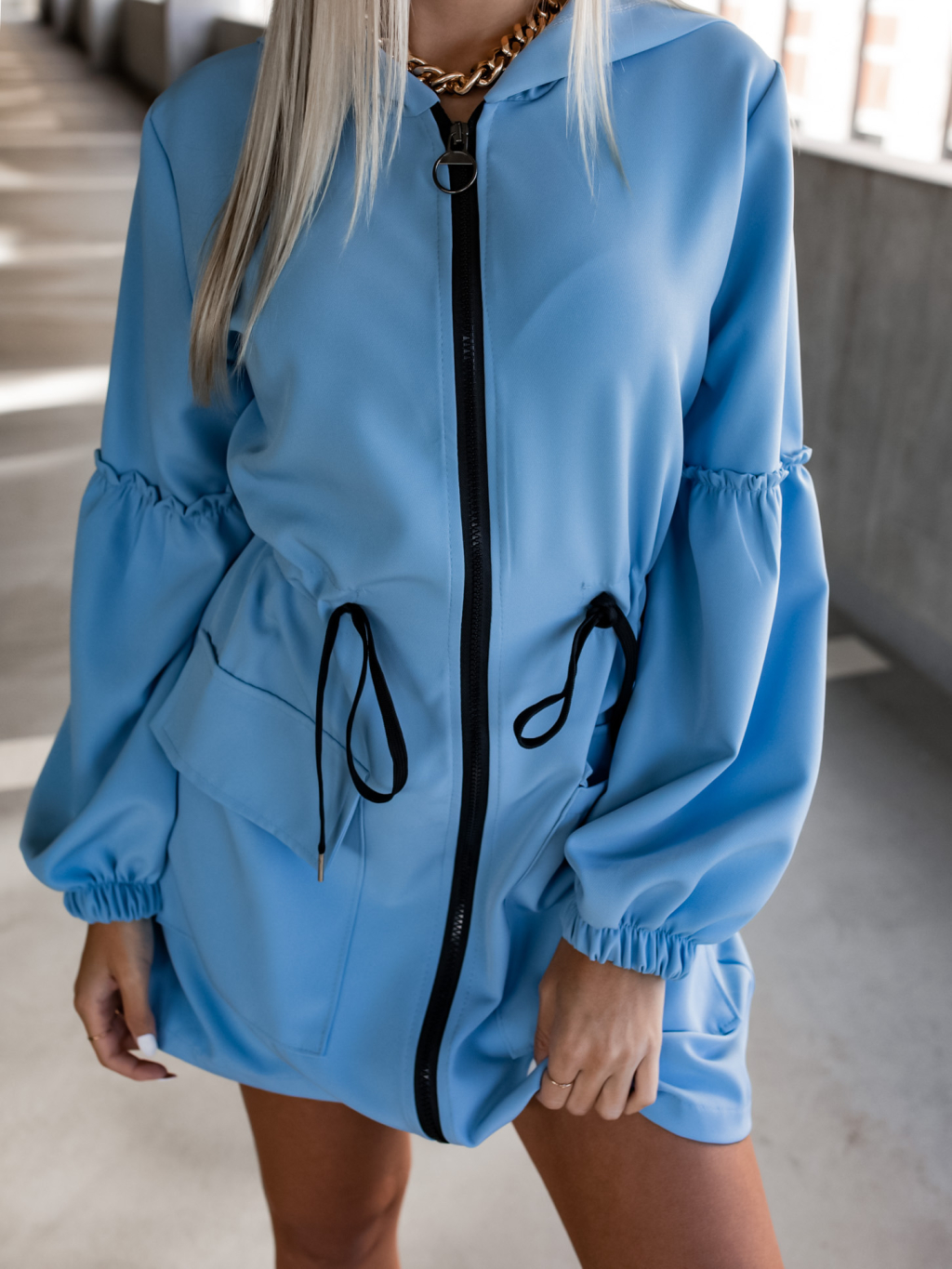 Světle modré šaty na zip SAMANTHA s nabíranými rukávy a kapucí