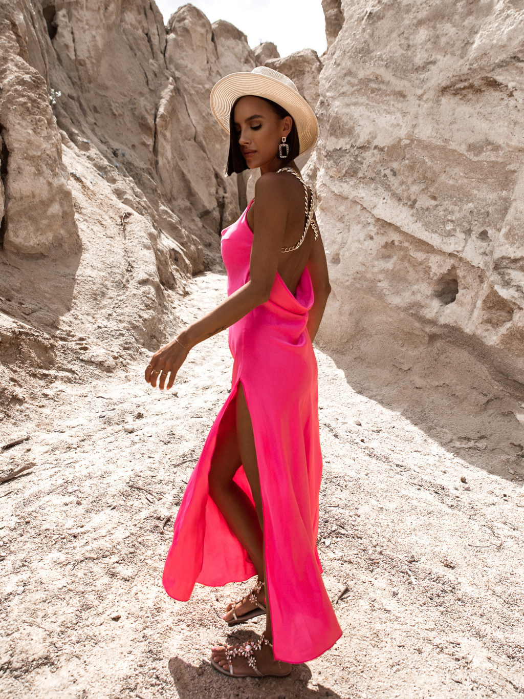 Světle růžové lesklé elegantní šaty MENLEYS se zlatými ramínky
