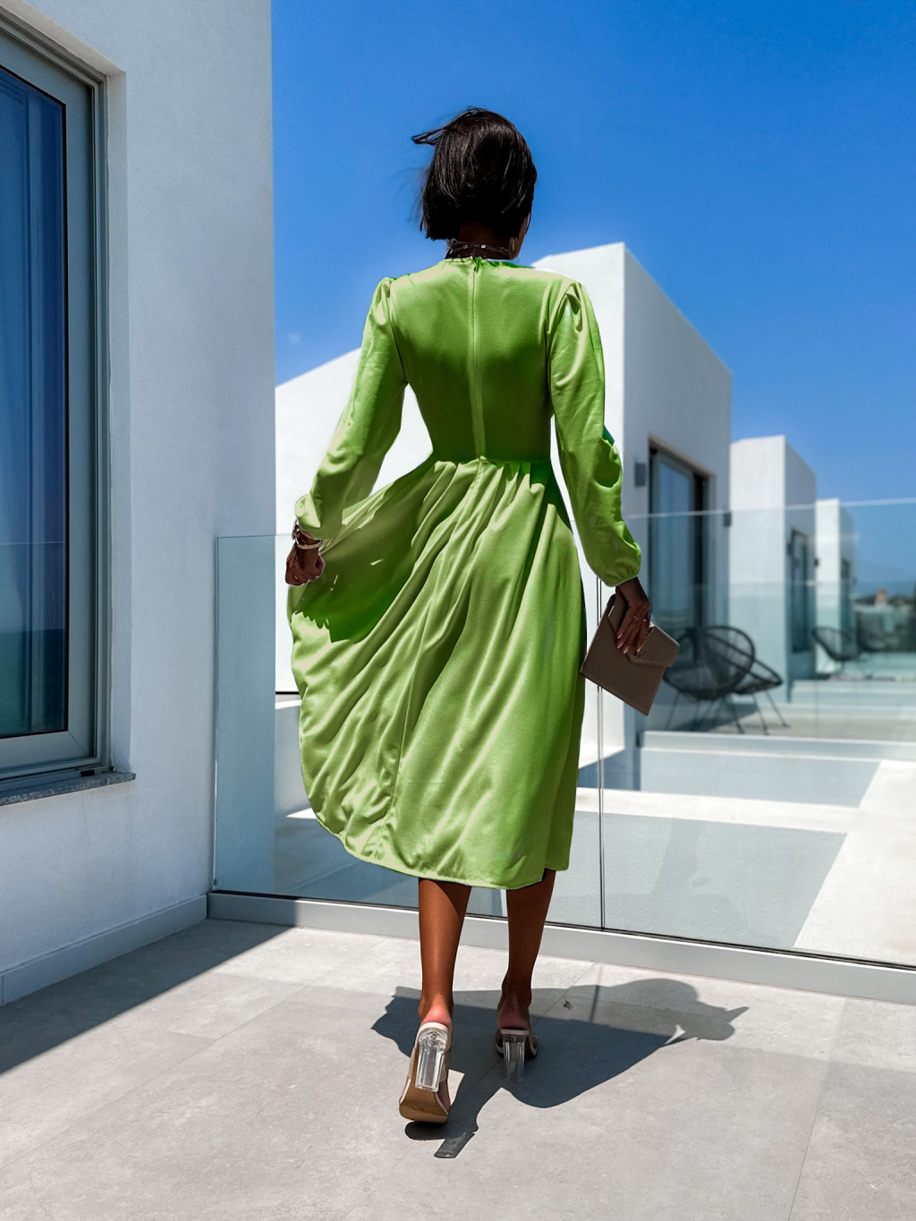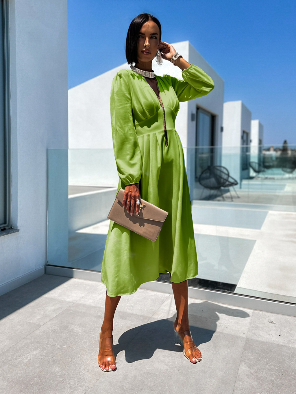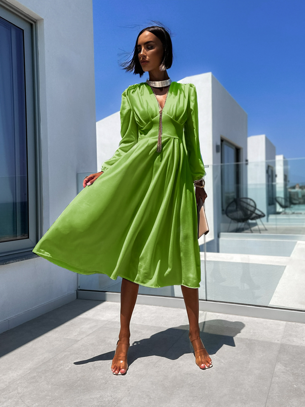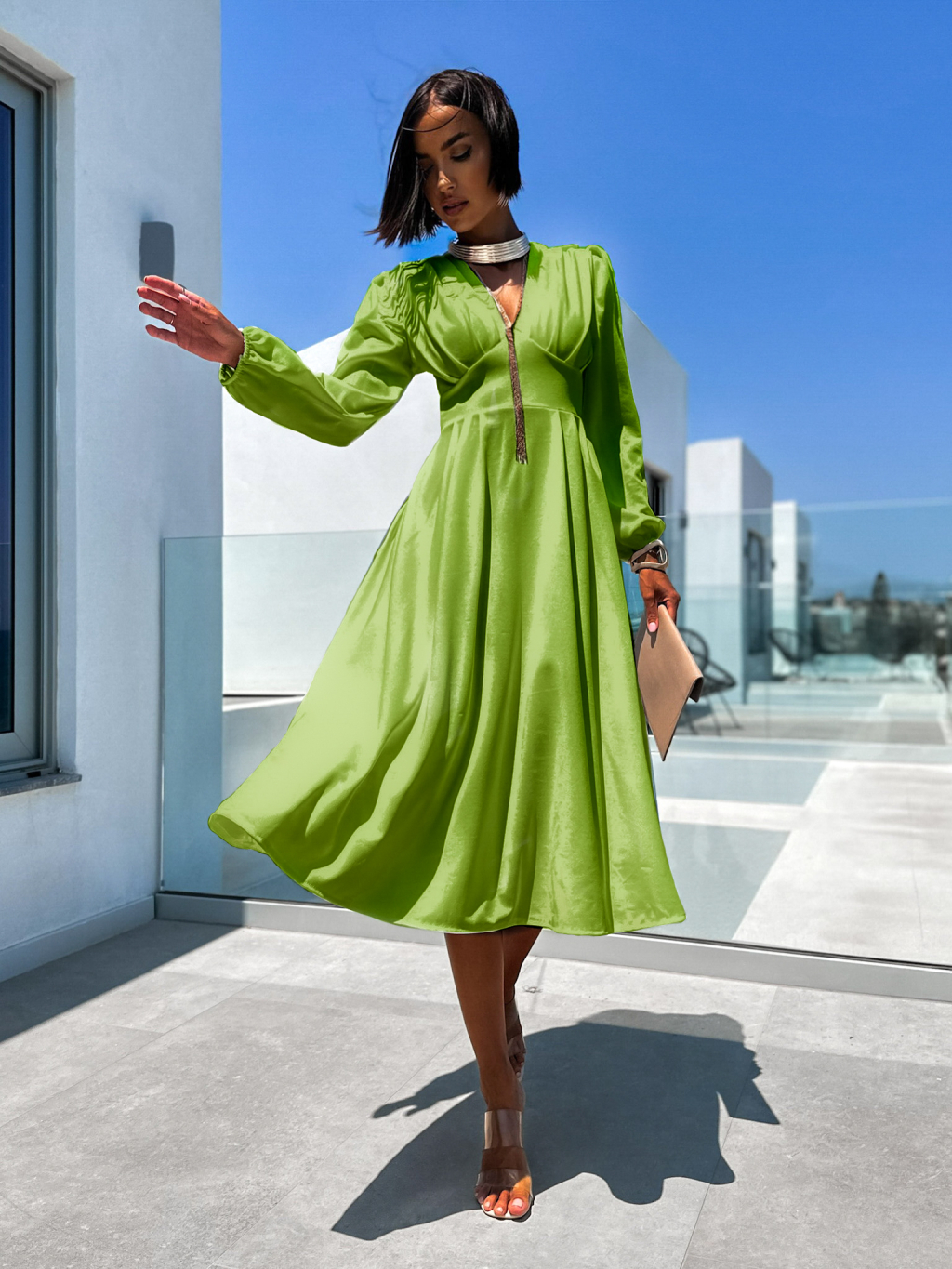 Světle zelené elegantní šaty PHINANEY s dlouhým rukávem