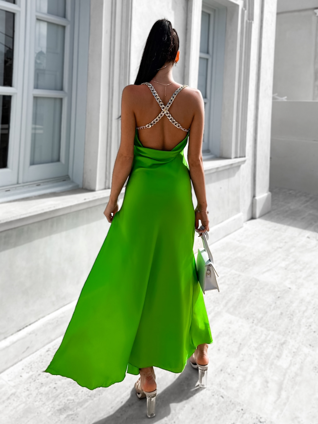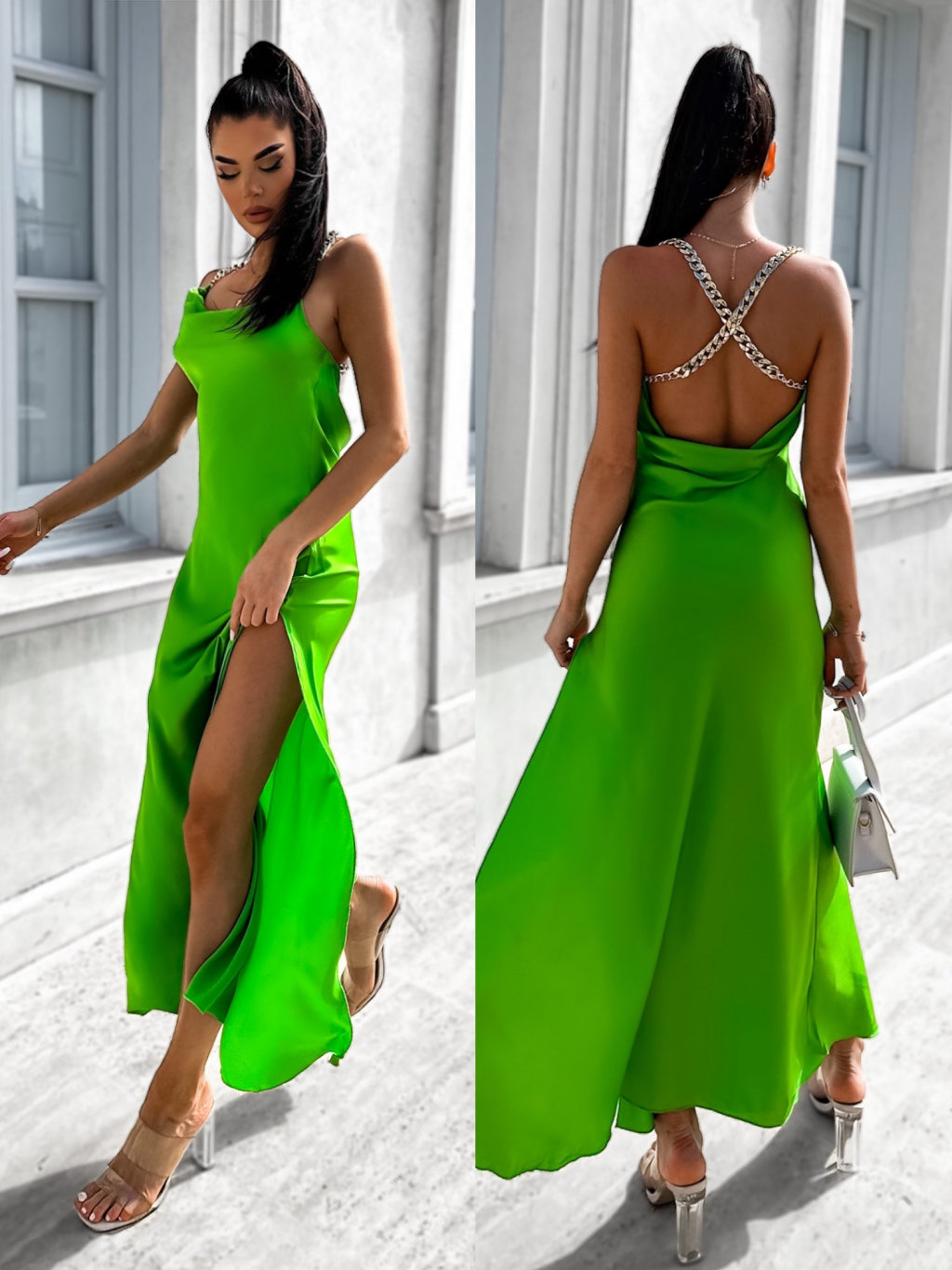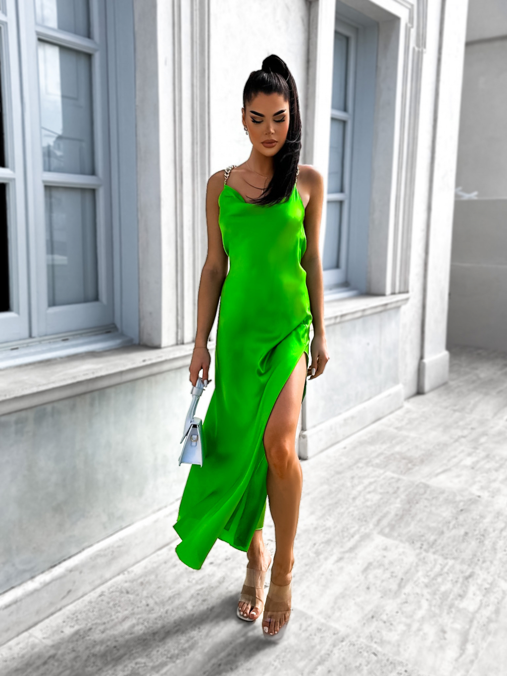 Světle zelené lesklé elegantní šaty MENLEYS se zlatými ramínky