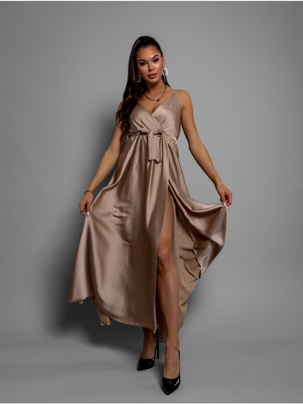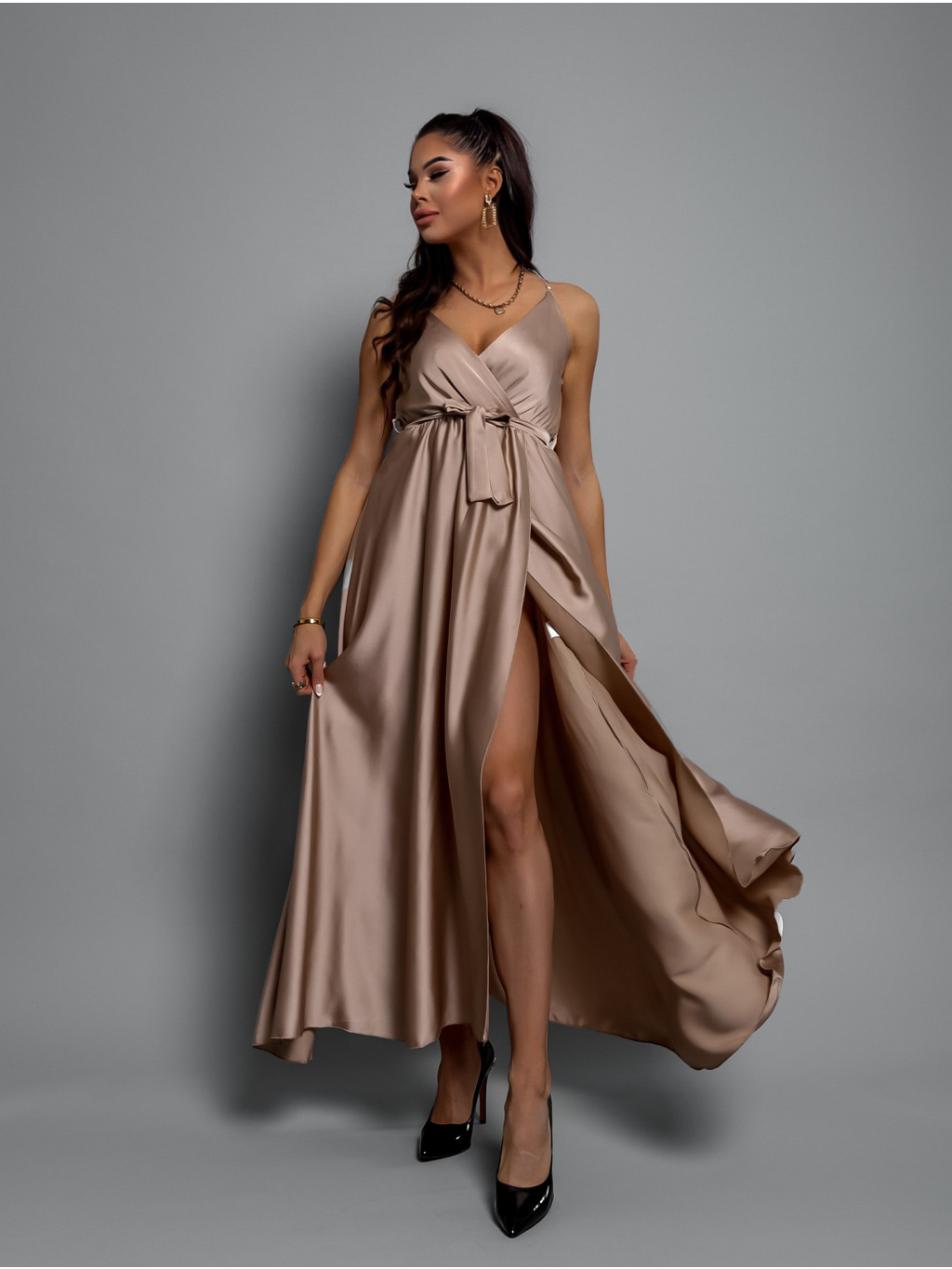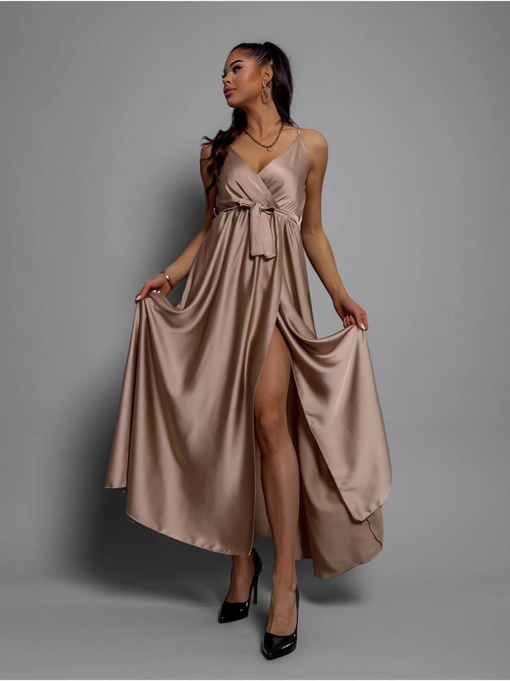 Tmavě béžové lesklé dlouhé plesové šaty PRIMROSE