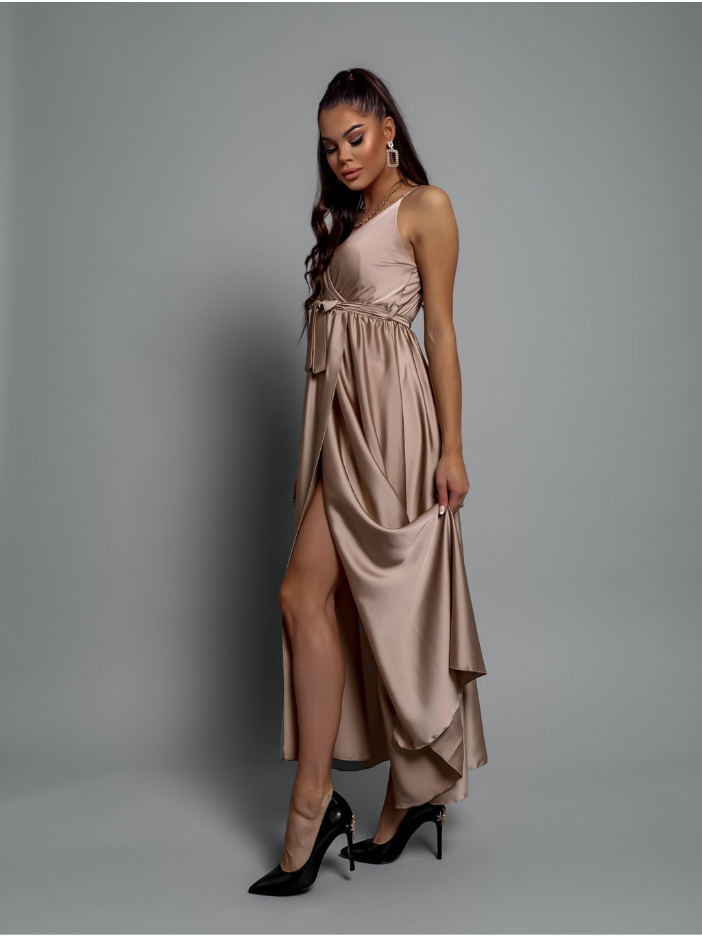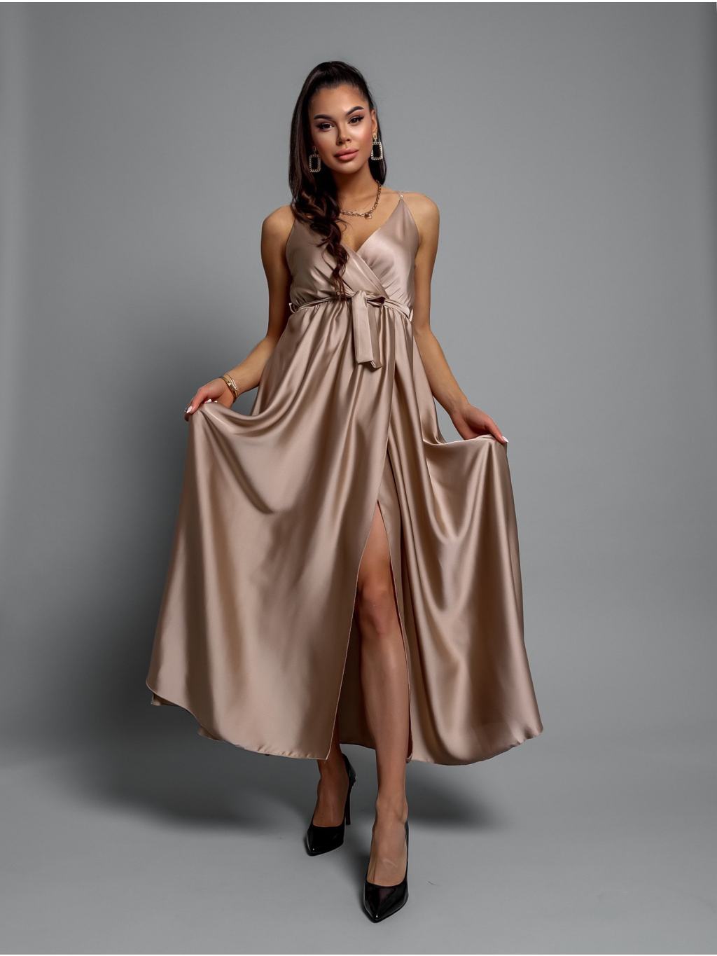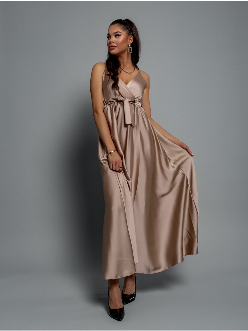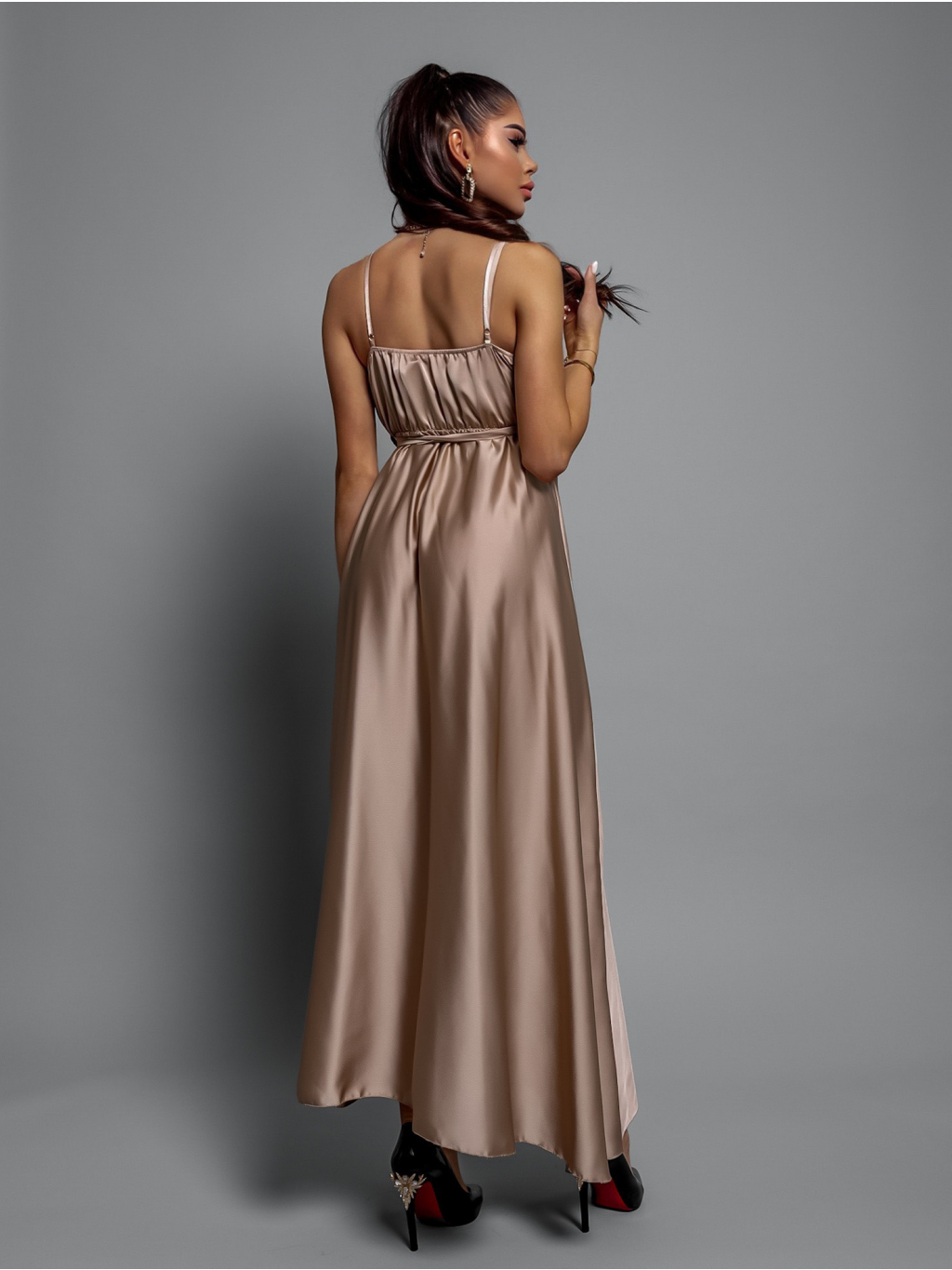 Tmavě béžové lesklé dlouhé plesové šaty PRIMROSE