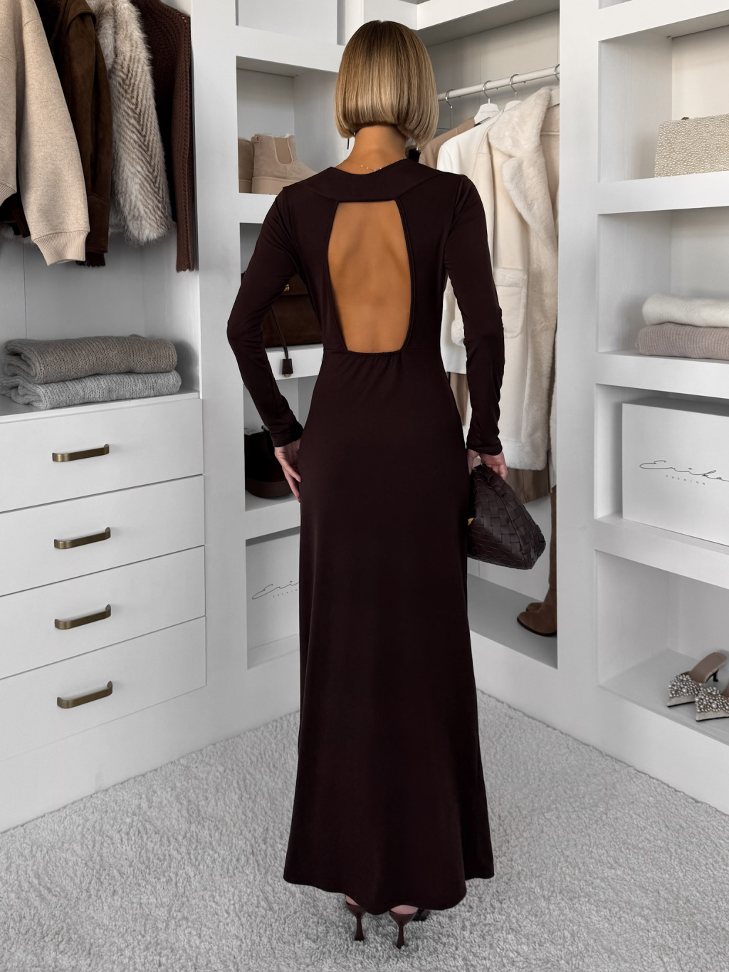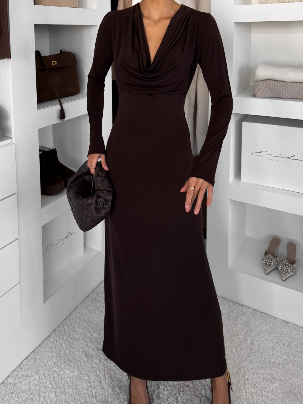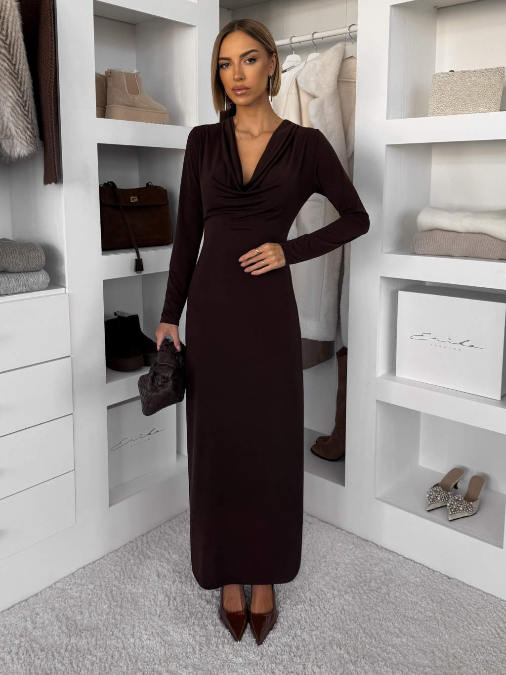 Tmavě hnědé společenské dlouhé šaty OLIVINE