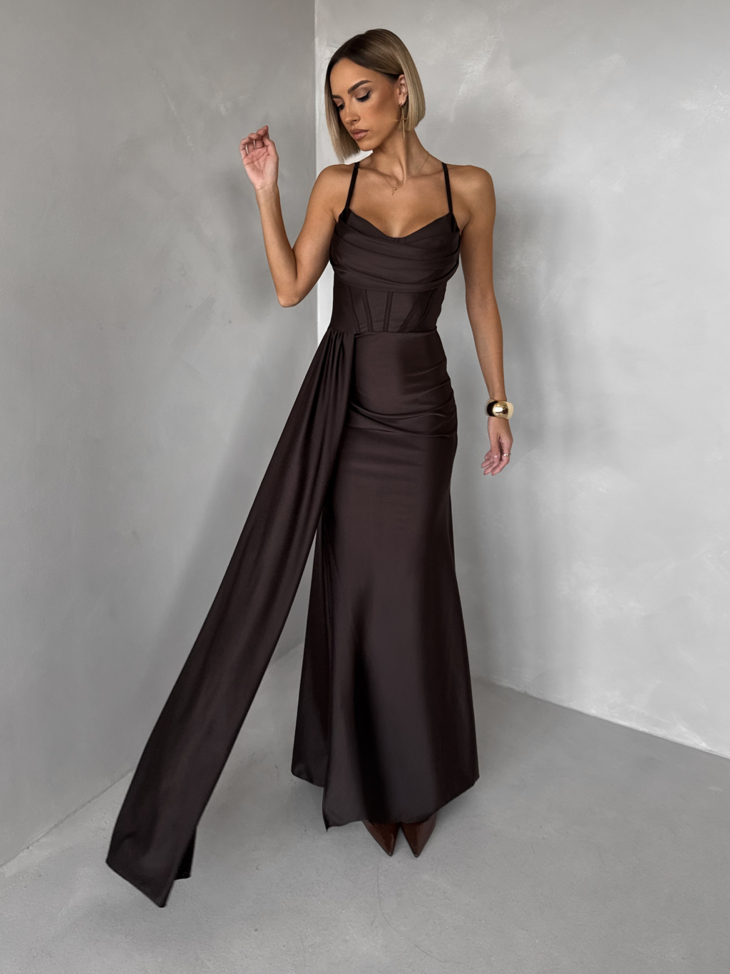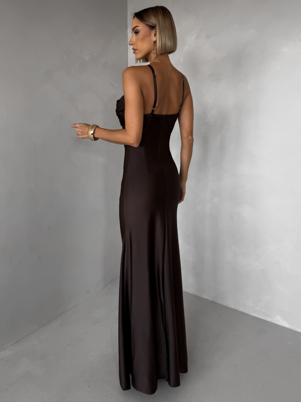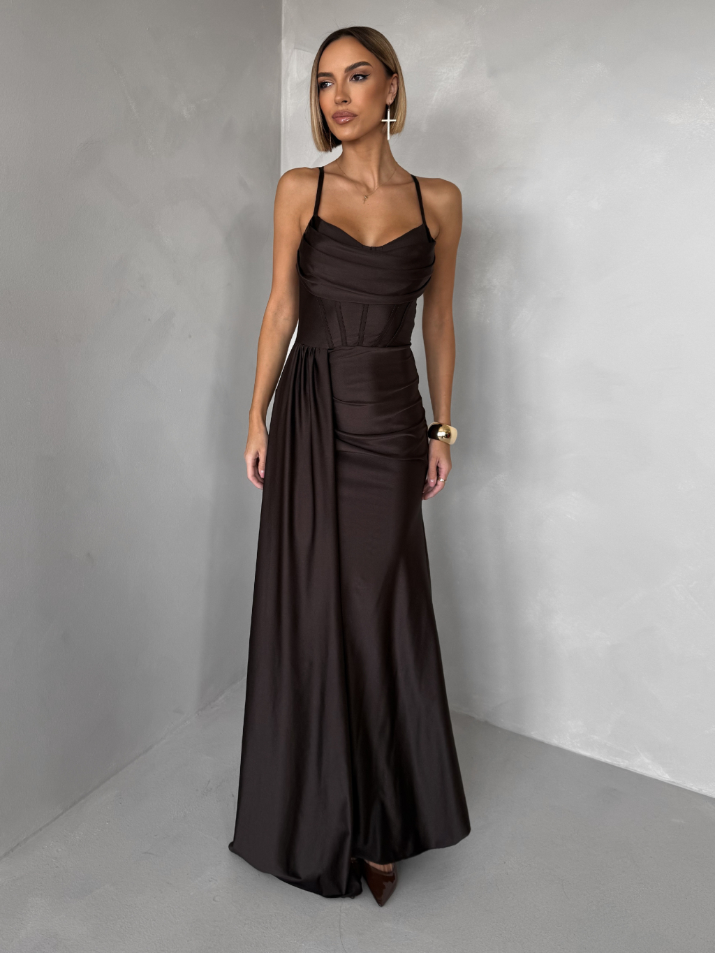 Tmavě hnědé společenské dlouhé šaty SATIN