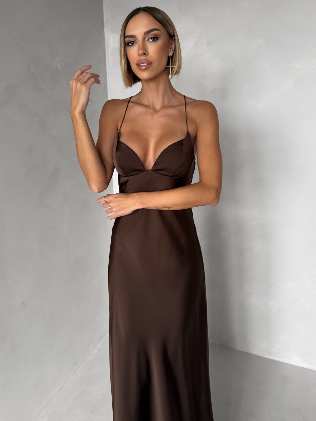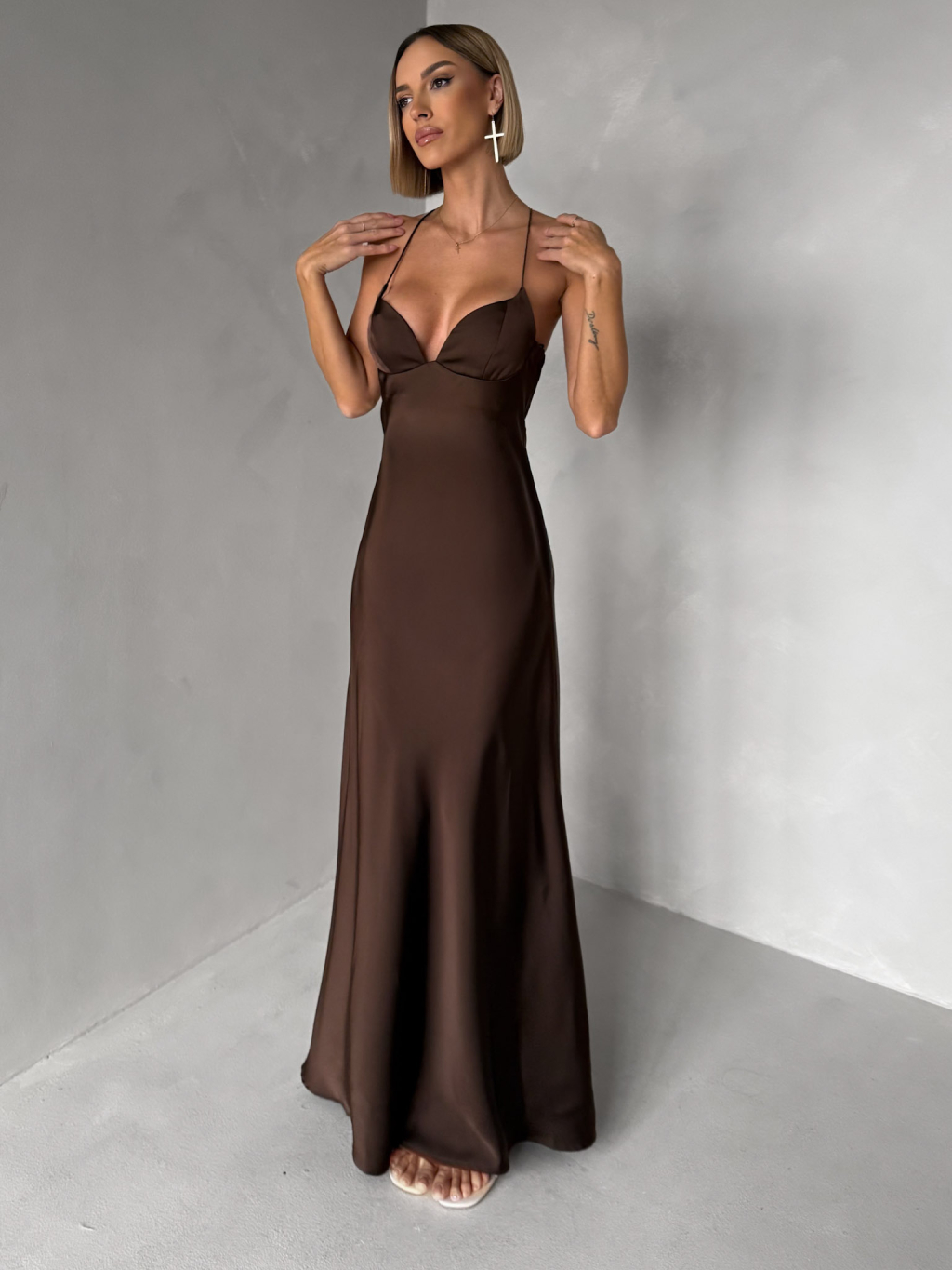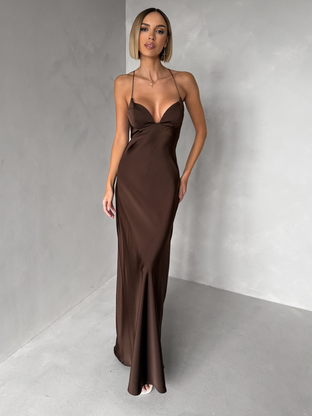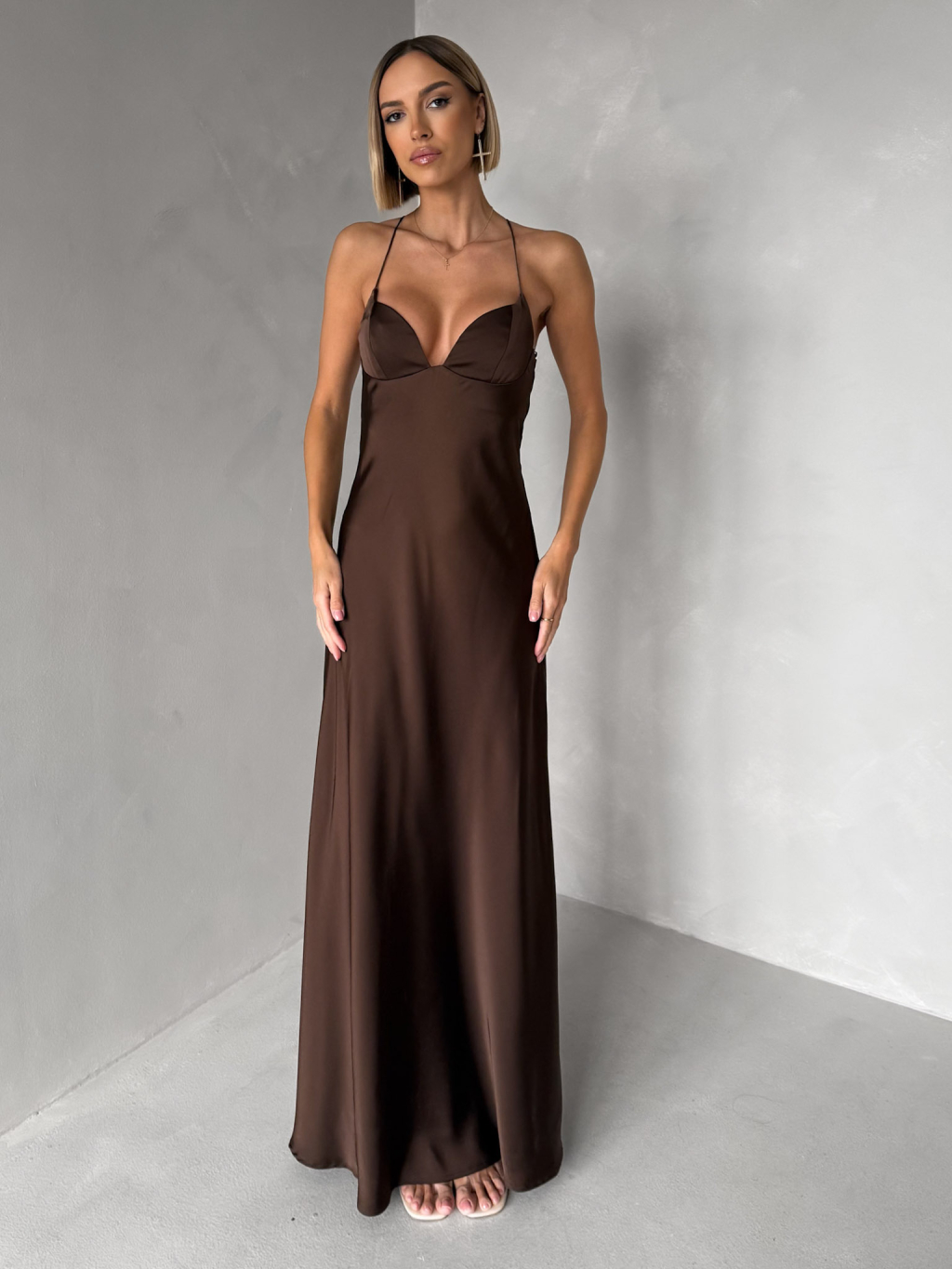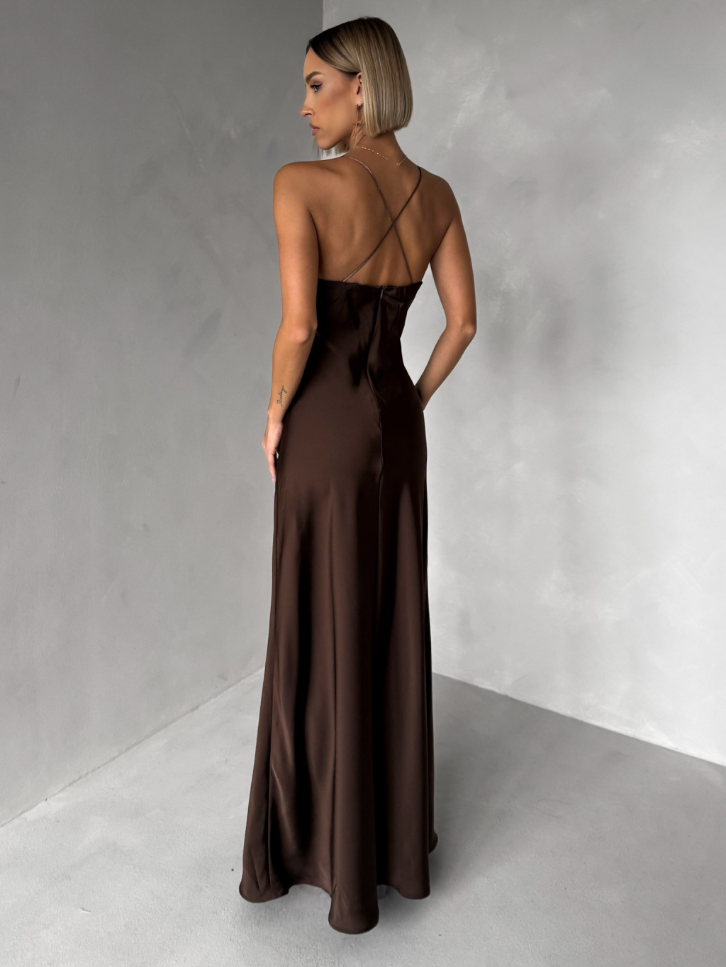 Tmavě hnědé společenské saténové dlouhé šaty ZUNDARA