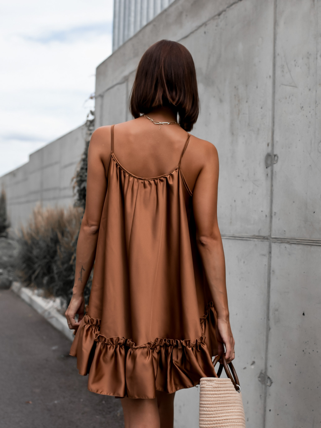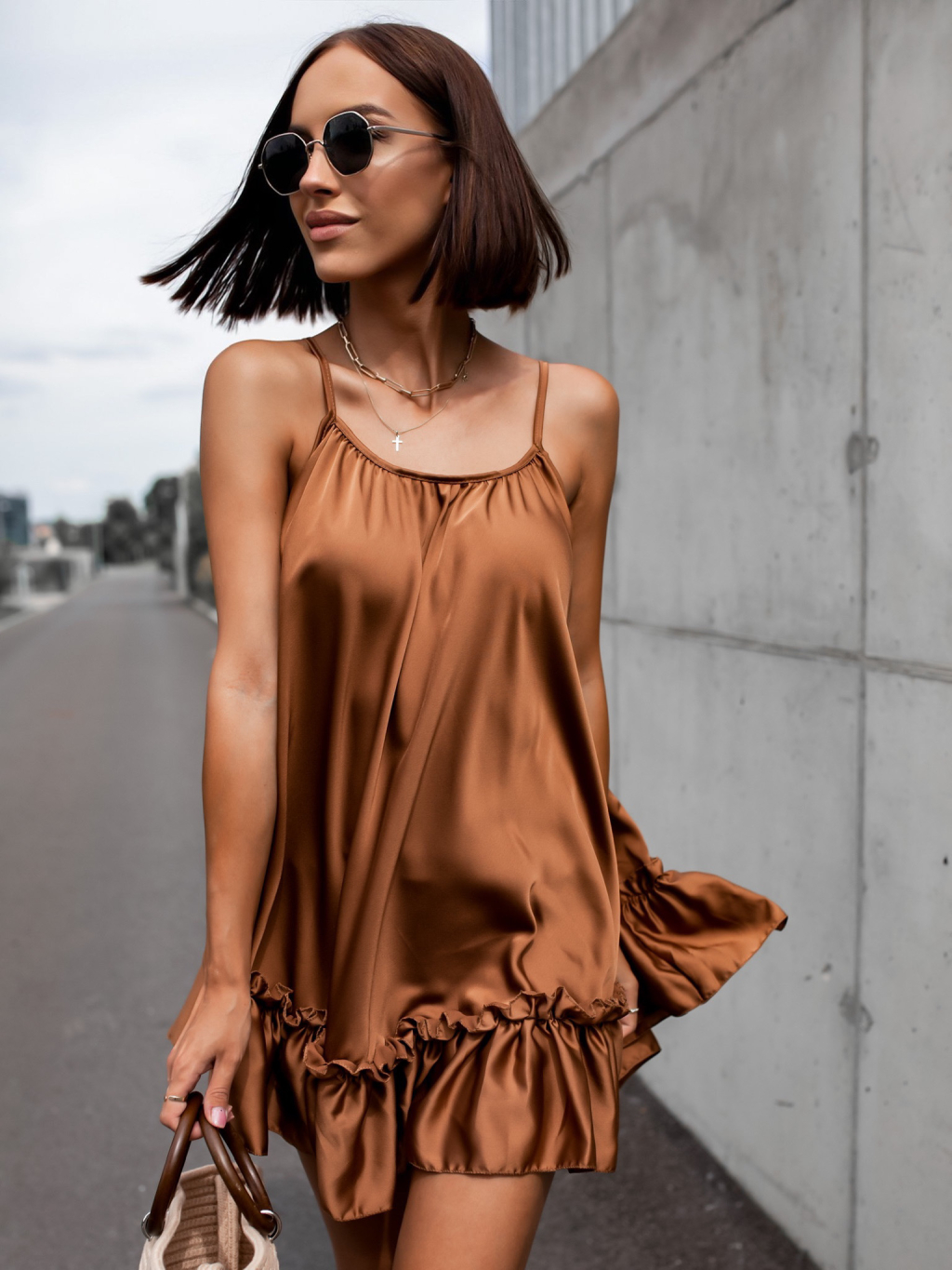 Tmavě hnědé volánkové šaty GLASSY volného střihu