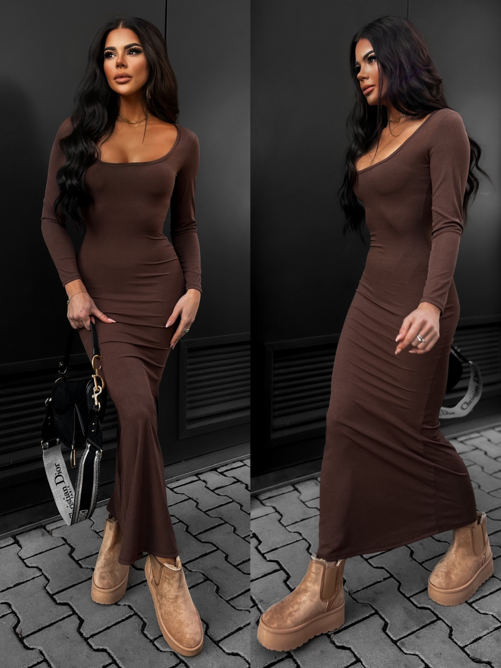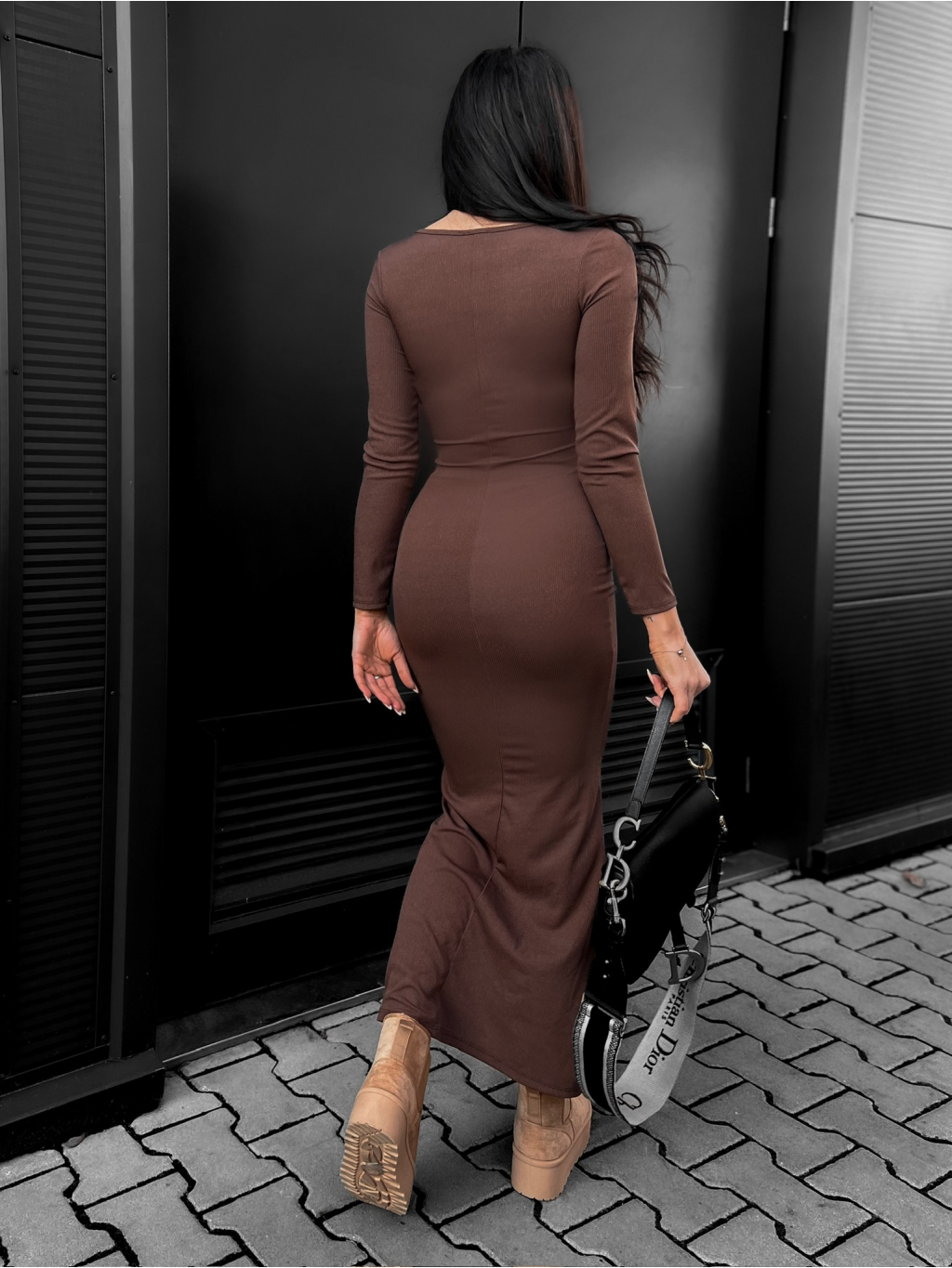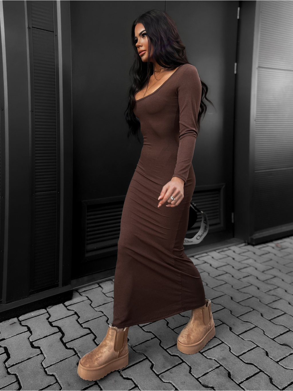 Tmavě hnědé žebrované šaty GIRESUN s dlouhým rukávem