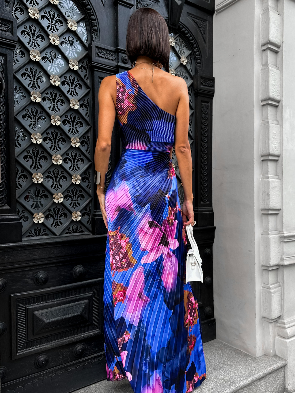 Šaty Suntils jsou dlouhé plisované šaty s lesklým povrchem, navržené pro pohodlné nošení. Elegantní střih na jedno rameno a půvabný průstřih dodávají šatům sexy vzhled. Ideální volba na ples, svatbu, nebo pro družičky, které chtějí zazářit.