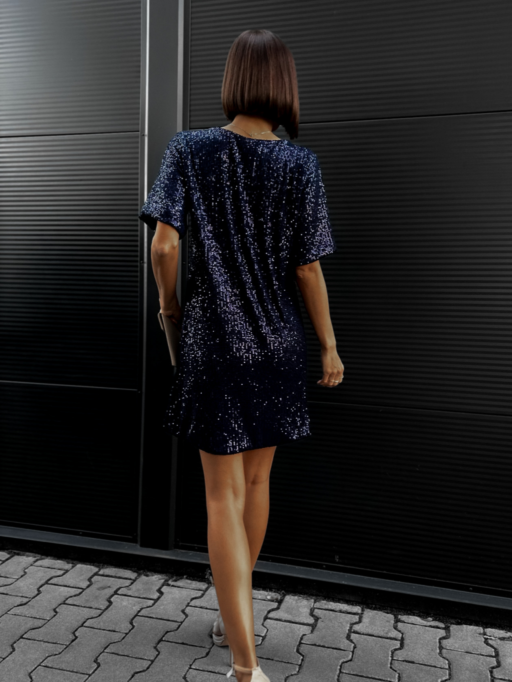 Tmavě modré flitrované šaty NINONE s krátkým rukávem