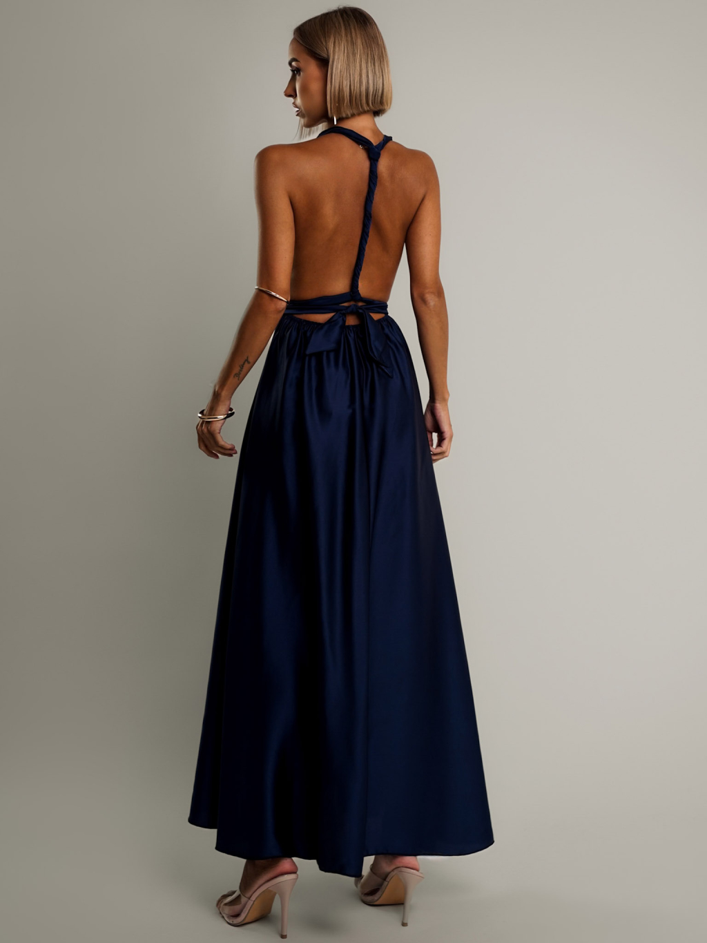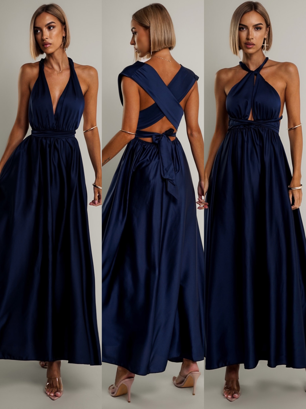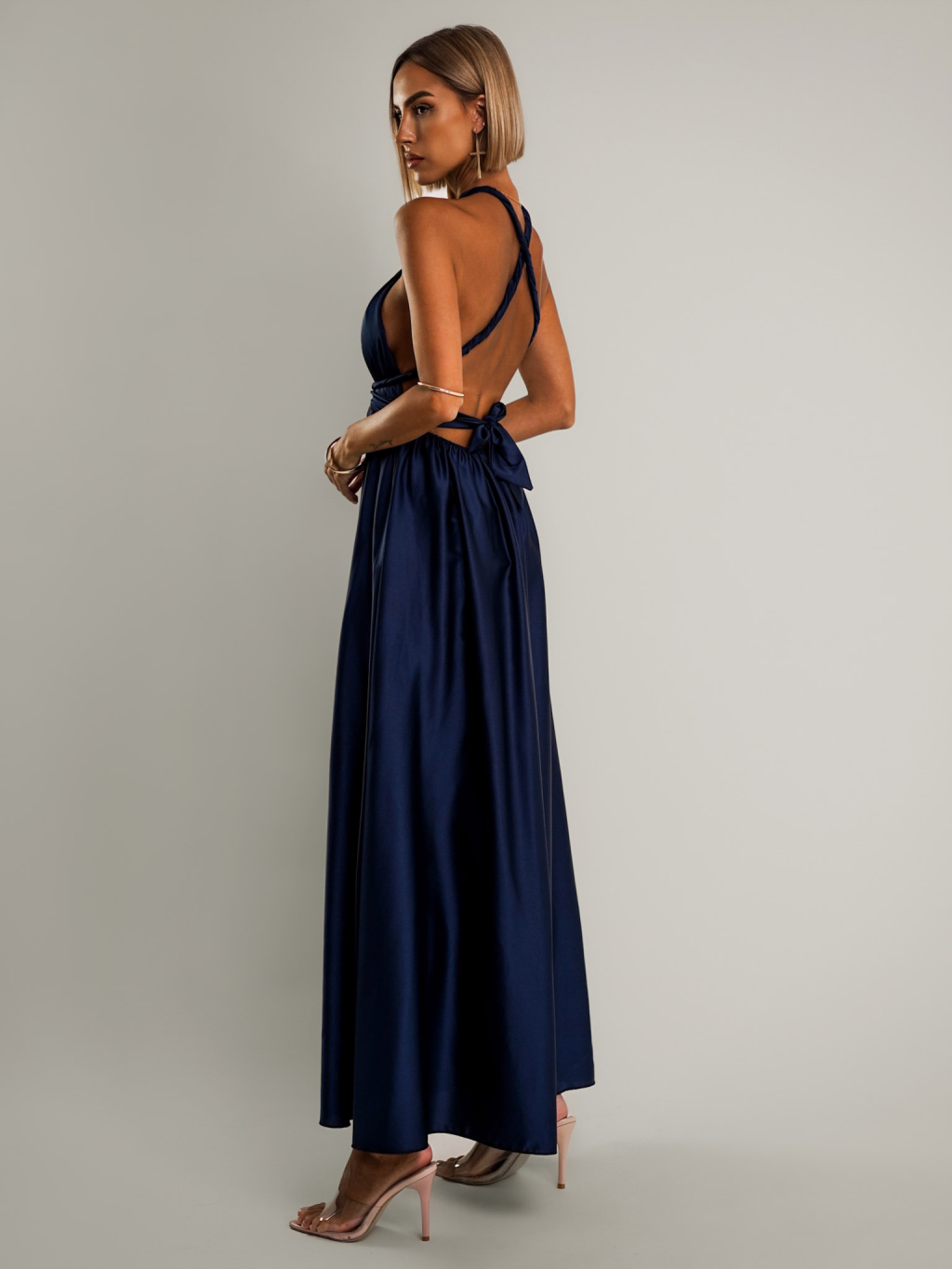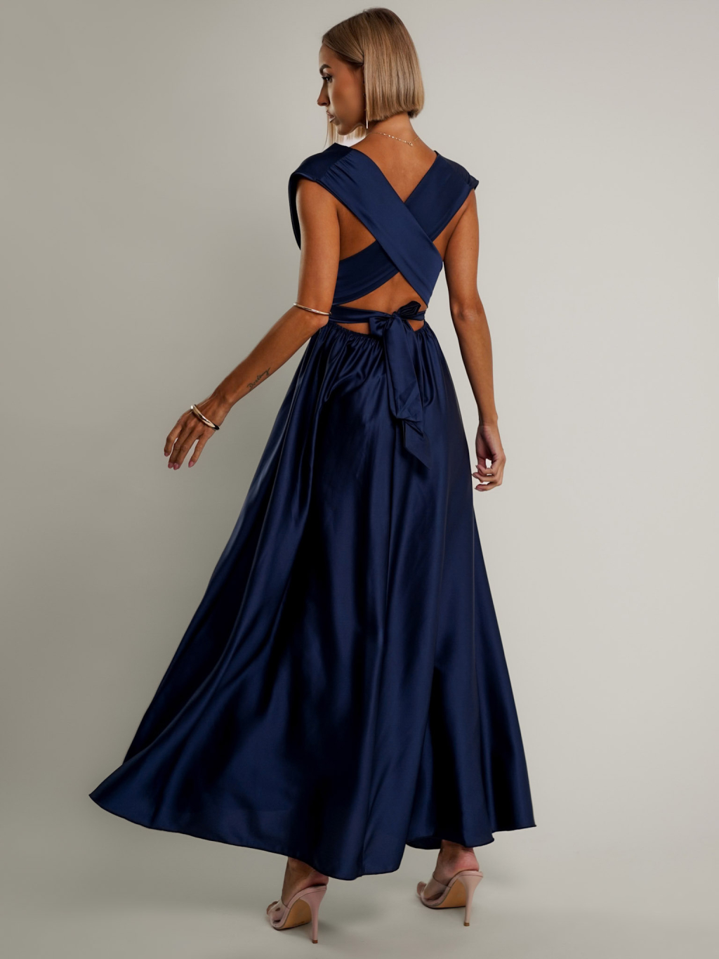 Tmavě modré saténové šaty VALERDY s variabilním vázáním / bez rozparku