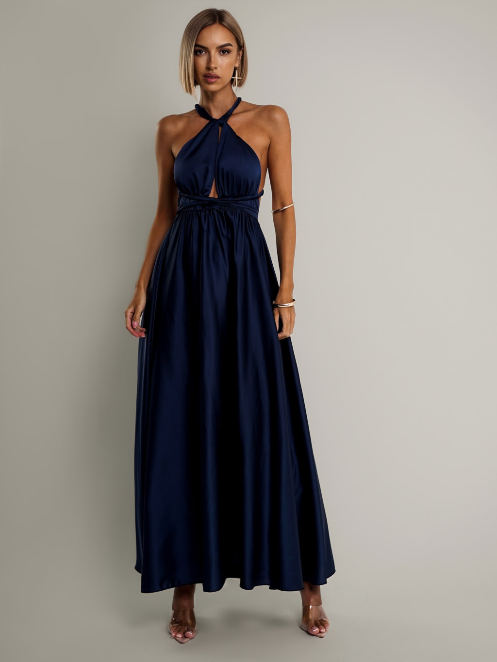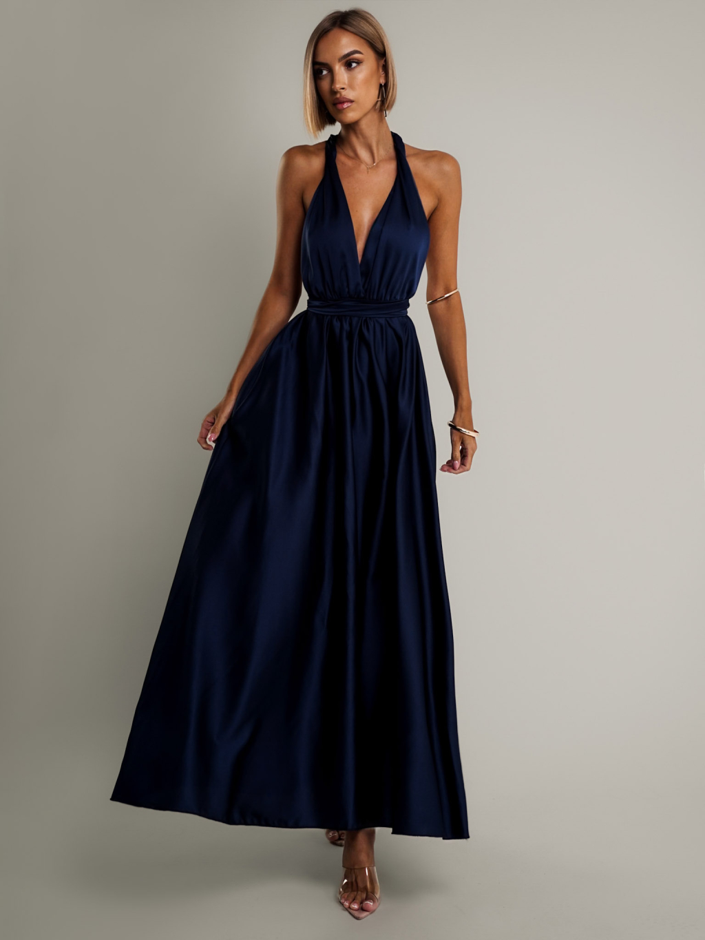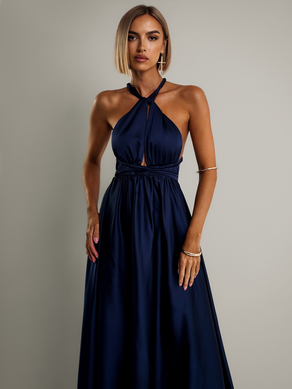Tmavě modré saténové šaty VALERDY s variabilním vázáním / bez rozparku