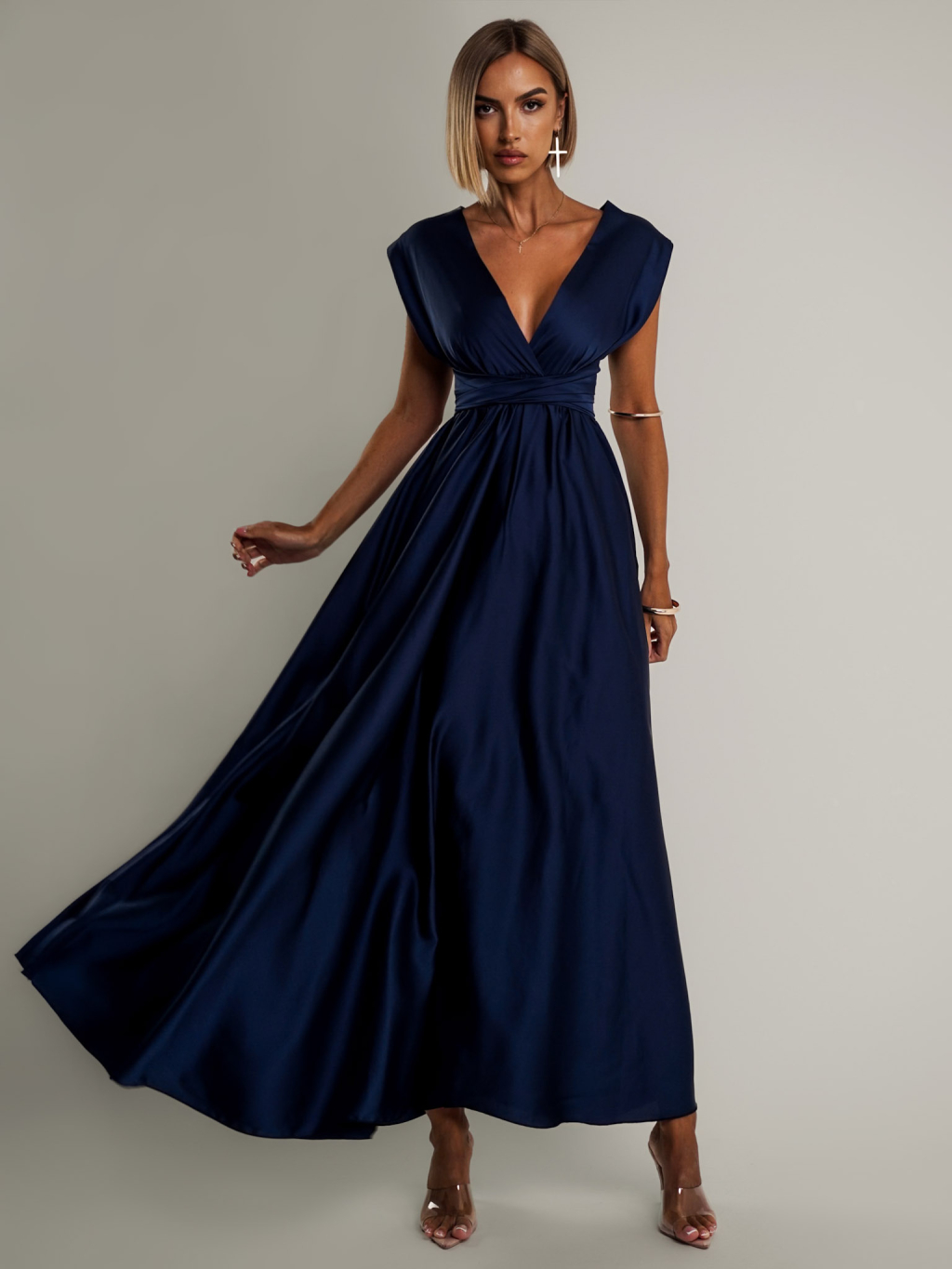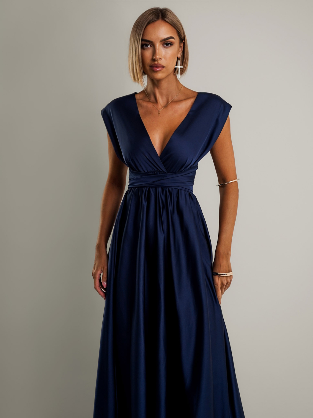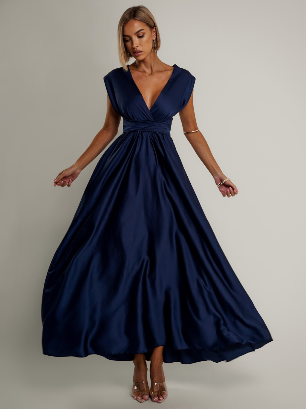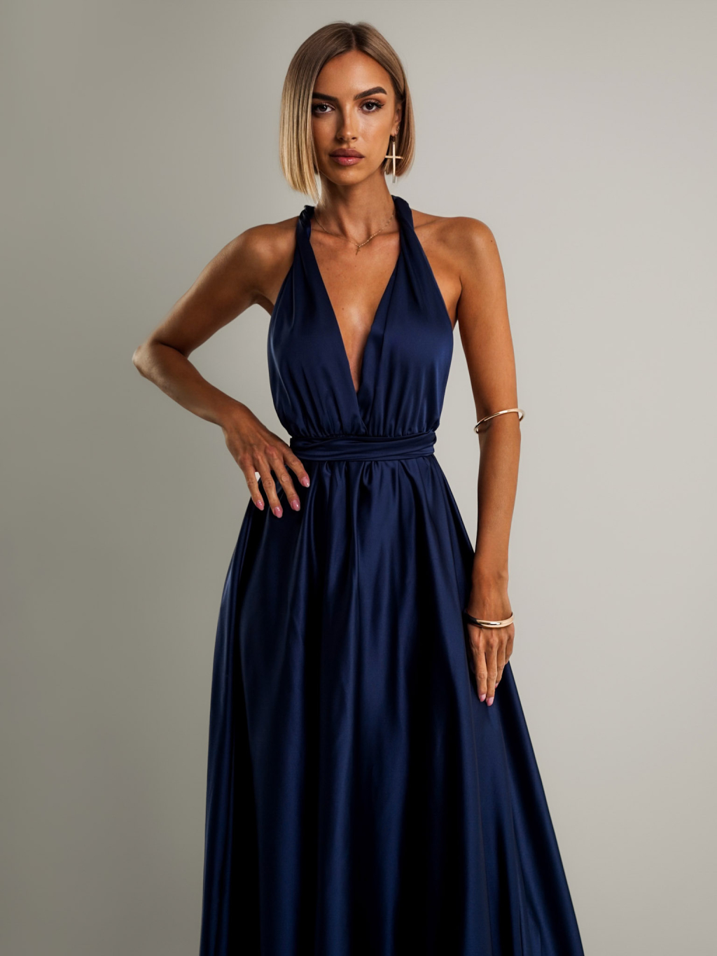 Tmavě modré saténové šaty VALERDY s variabilním vázáním / bez rozparku