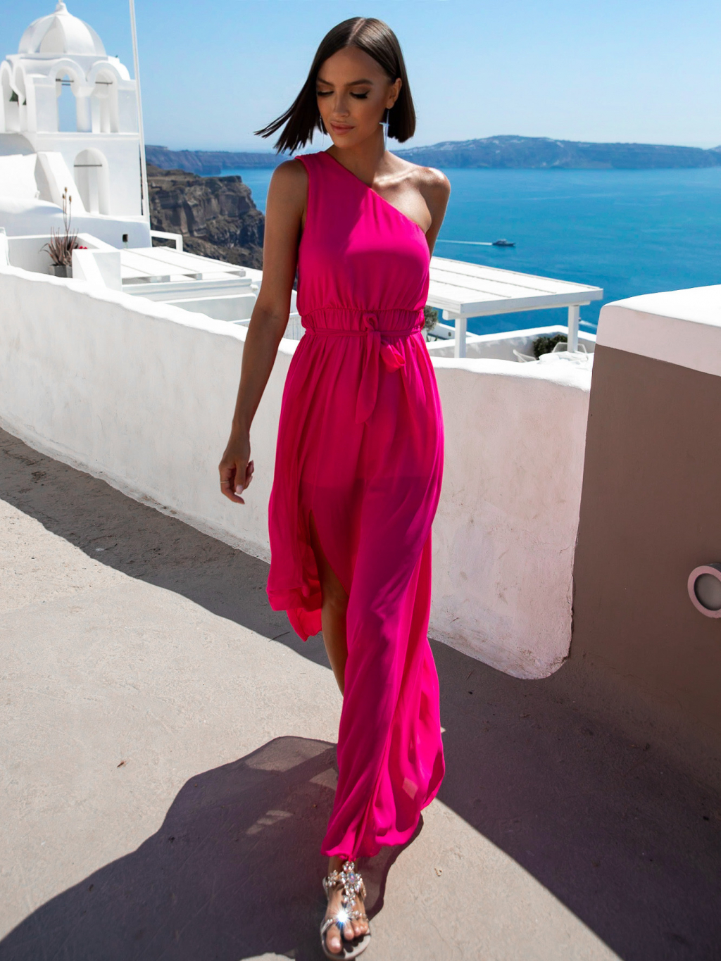 Tmavě růžové lehké dlouhé šaty LORRI na jedno rameno