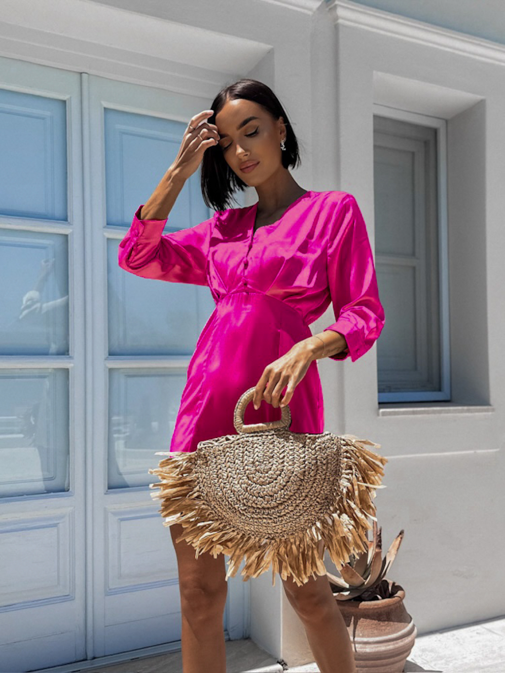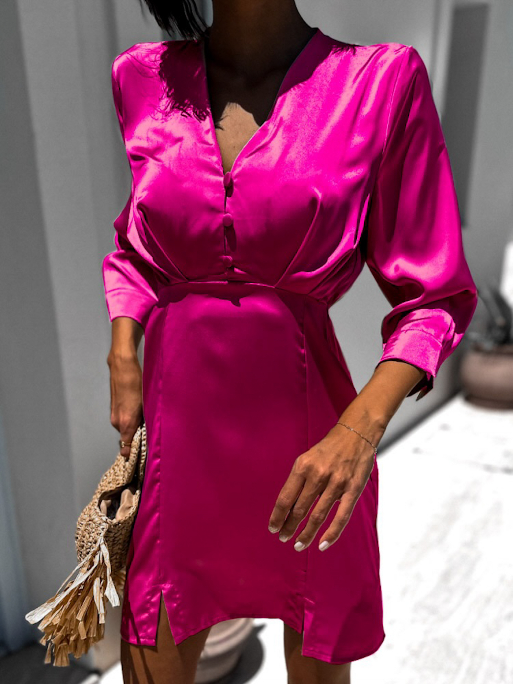 Tmavě růžové lesklé elegantní šaty DUOTE s knoflíky