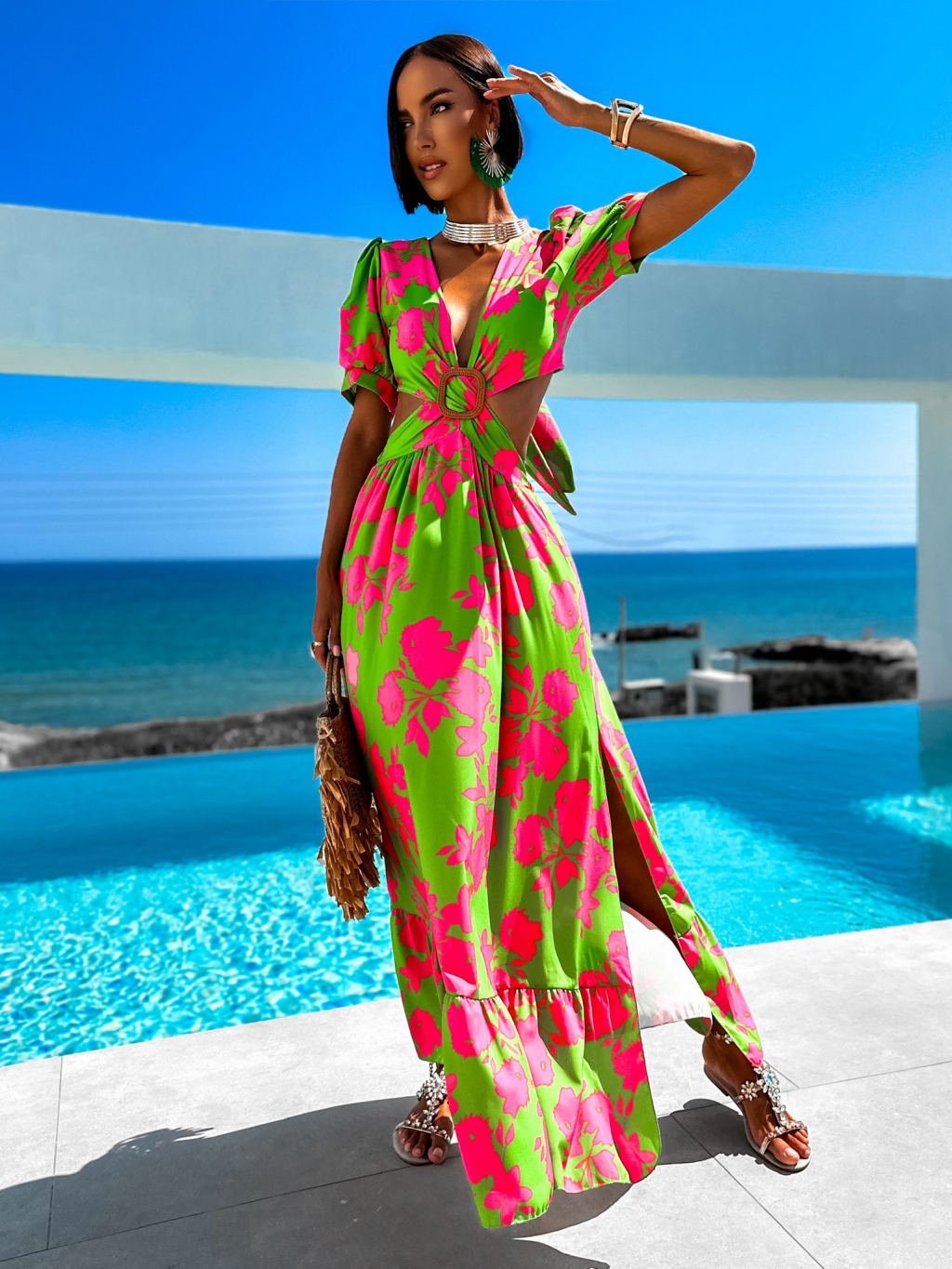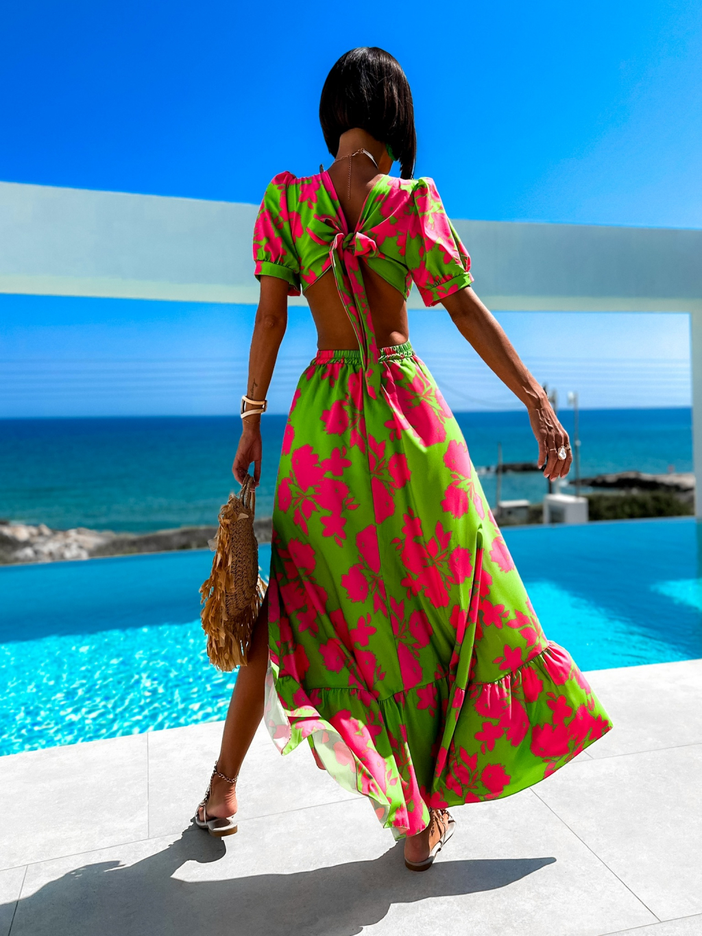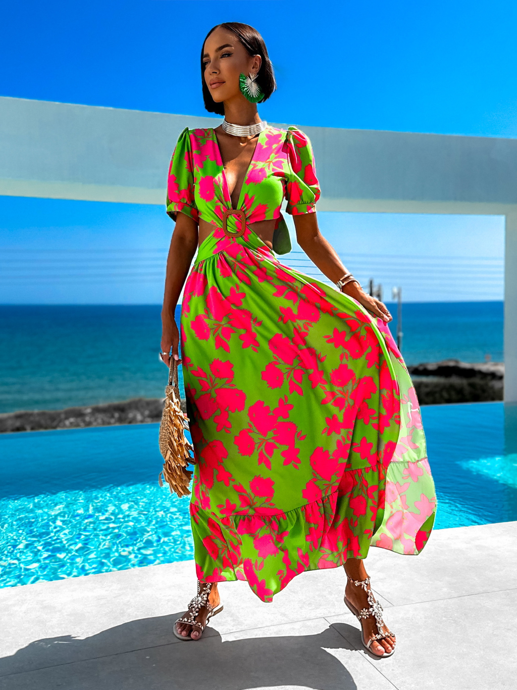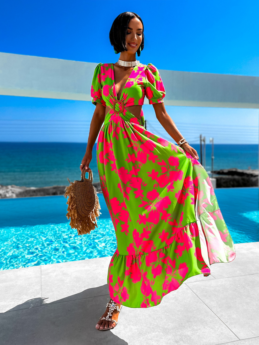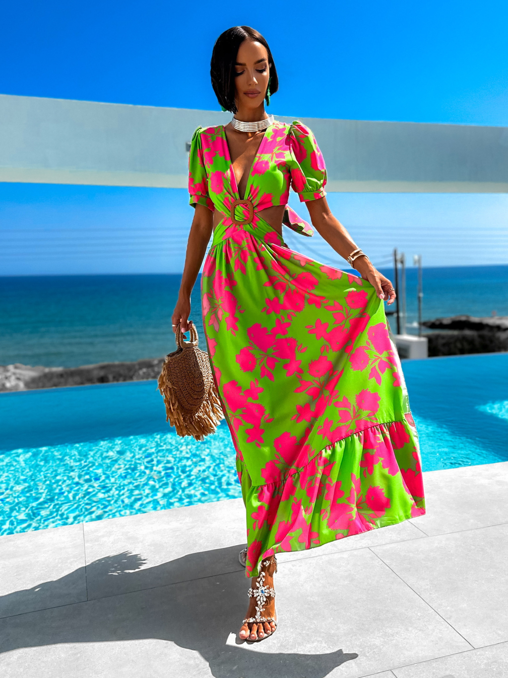 Zeleno růžové elegantní šaty CYPREY se vzory