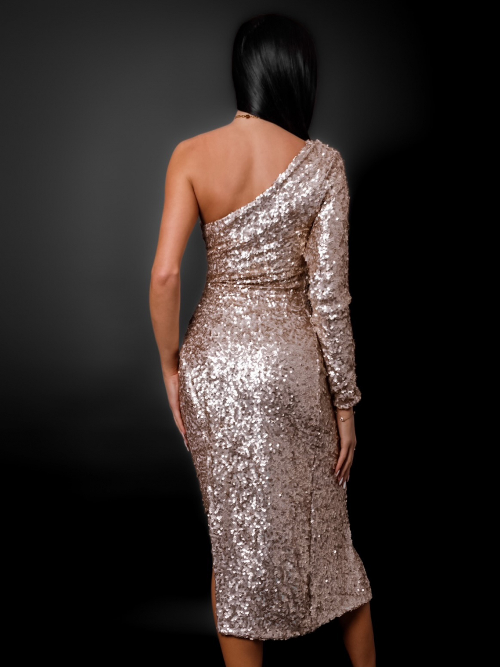 Zlaté elegantní šaty REXANI s jedním rukávem