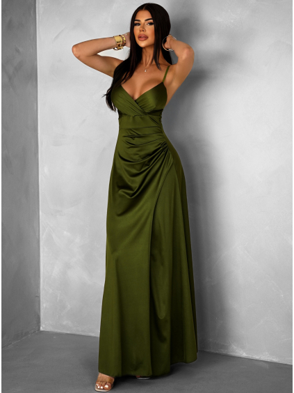 Olivové dlouhé společenské šaty LIMONA s rozparkem