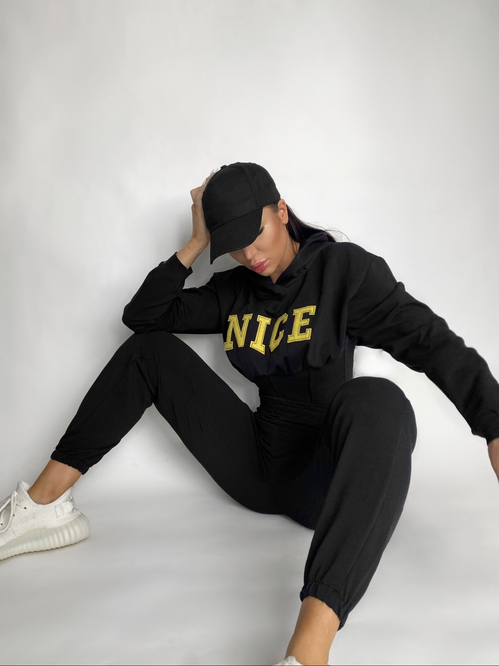 Černá tepláková souprava MALIA s kapucí a potiskem