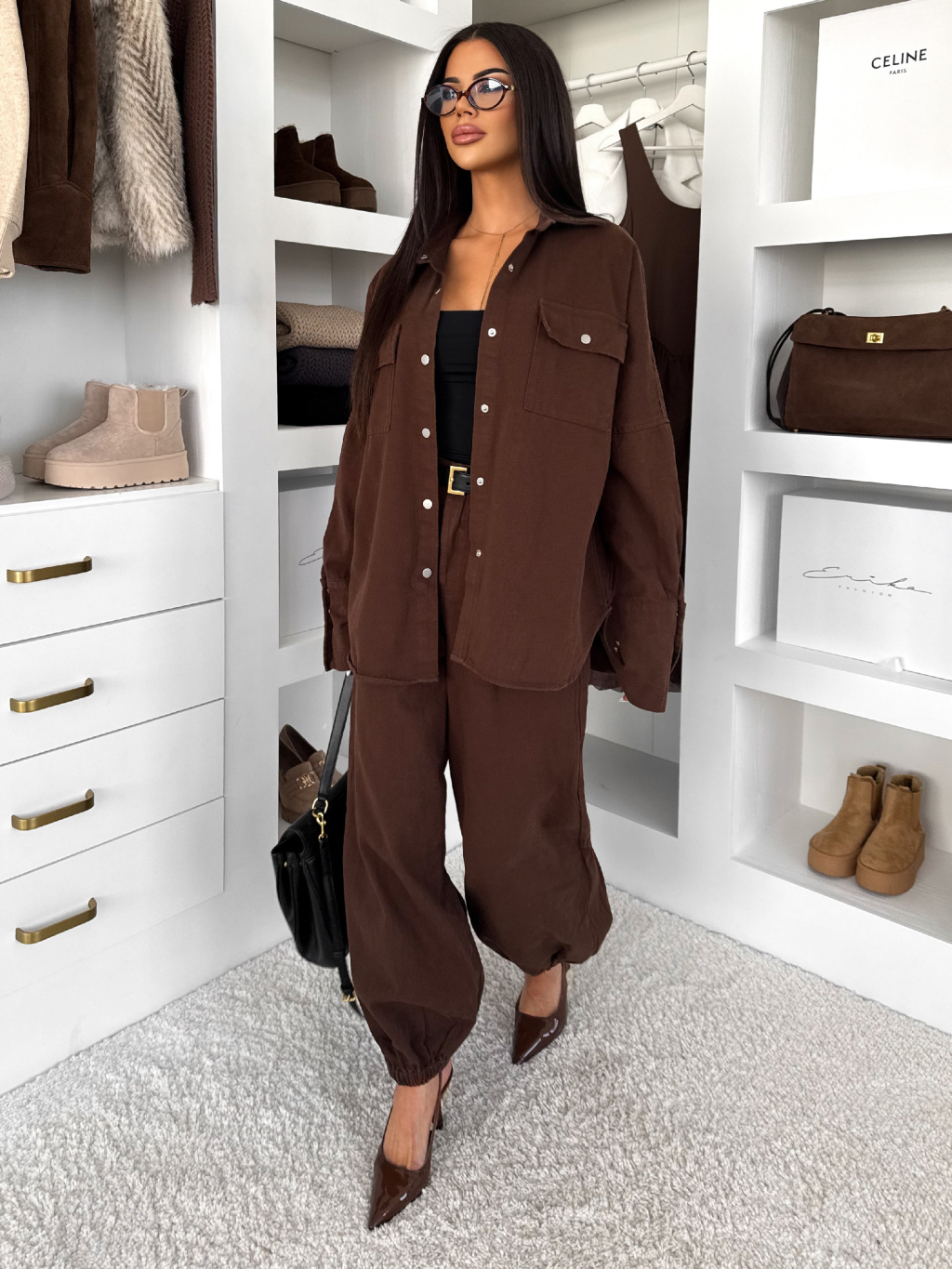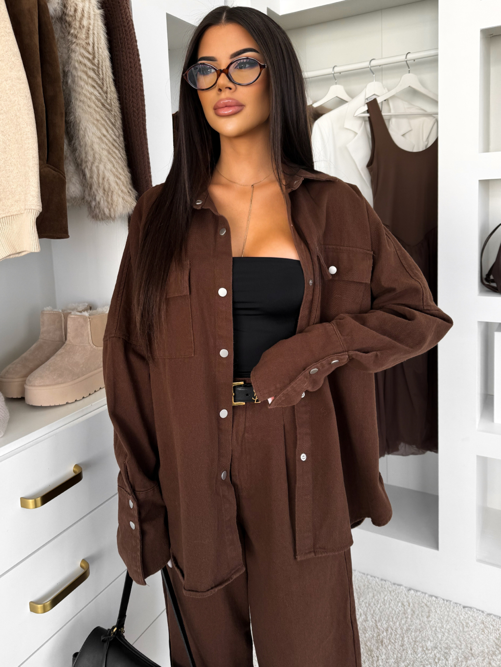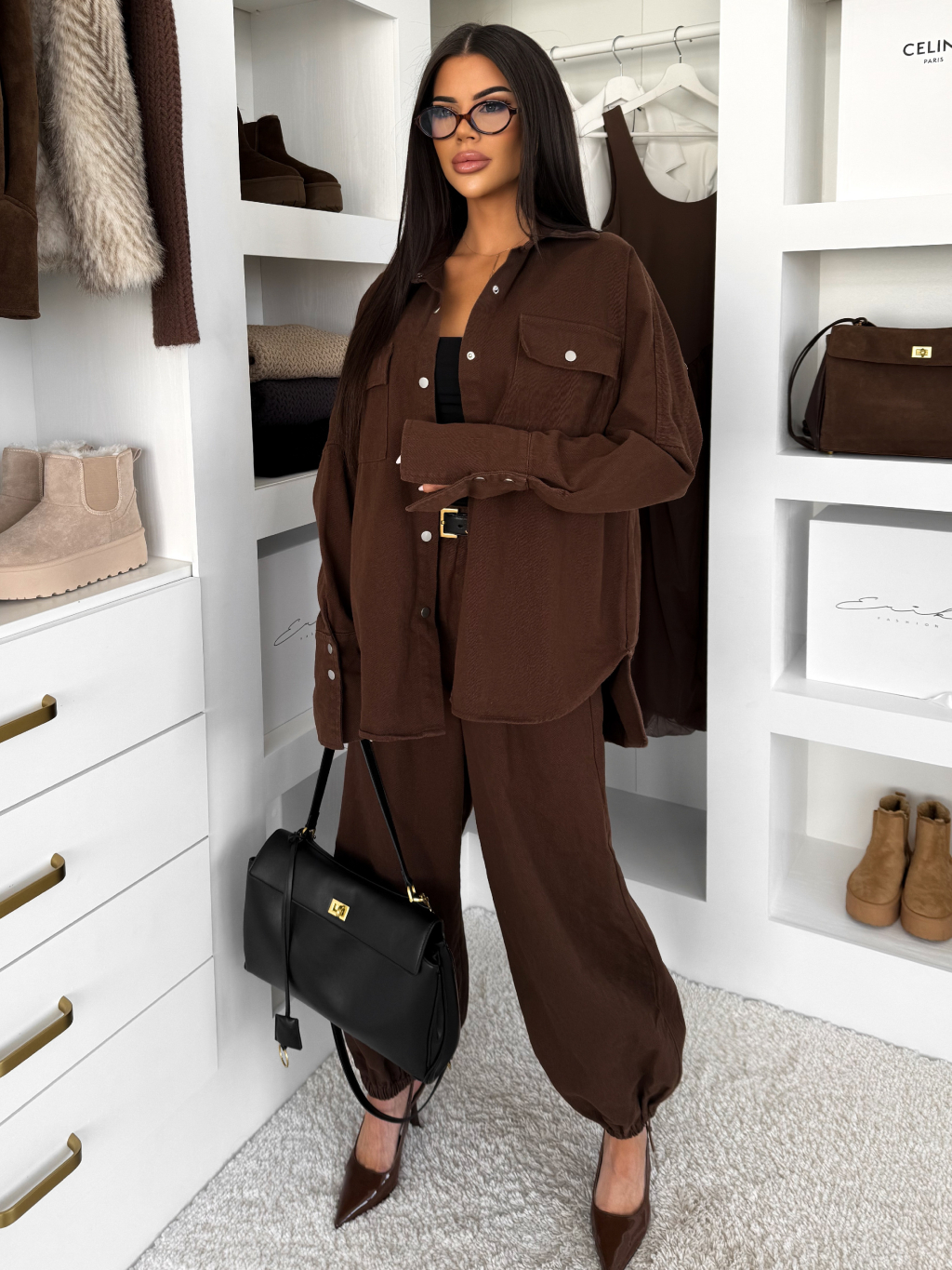Hnědý džínový dlouhý komplet BRELUM s košilí