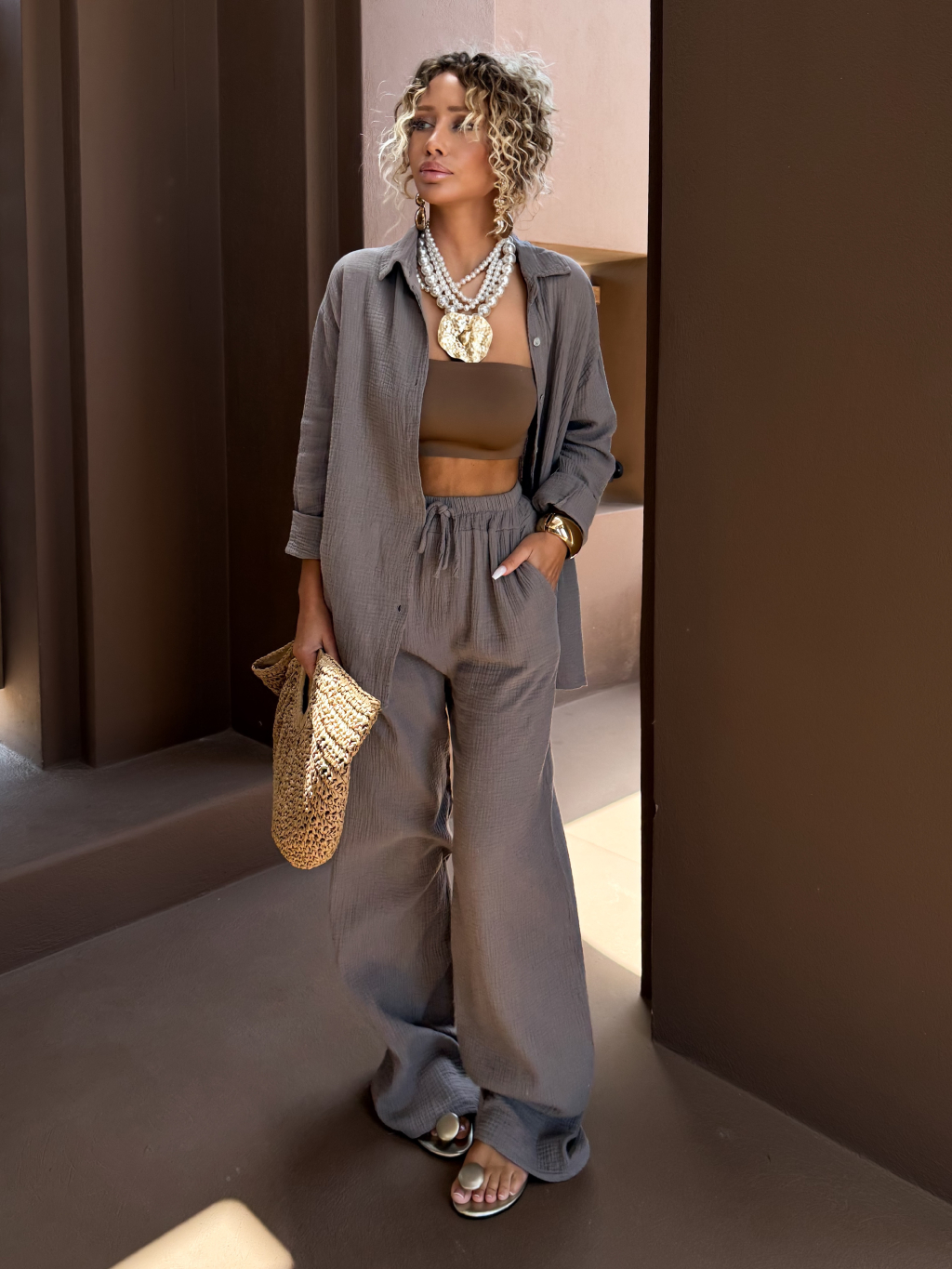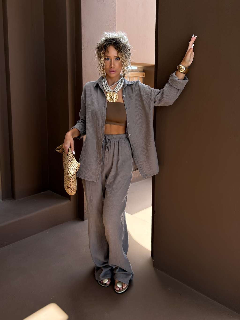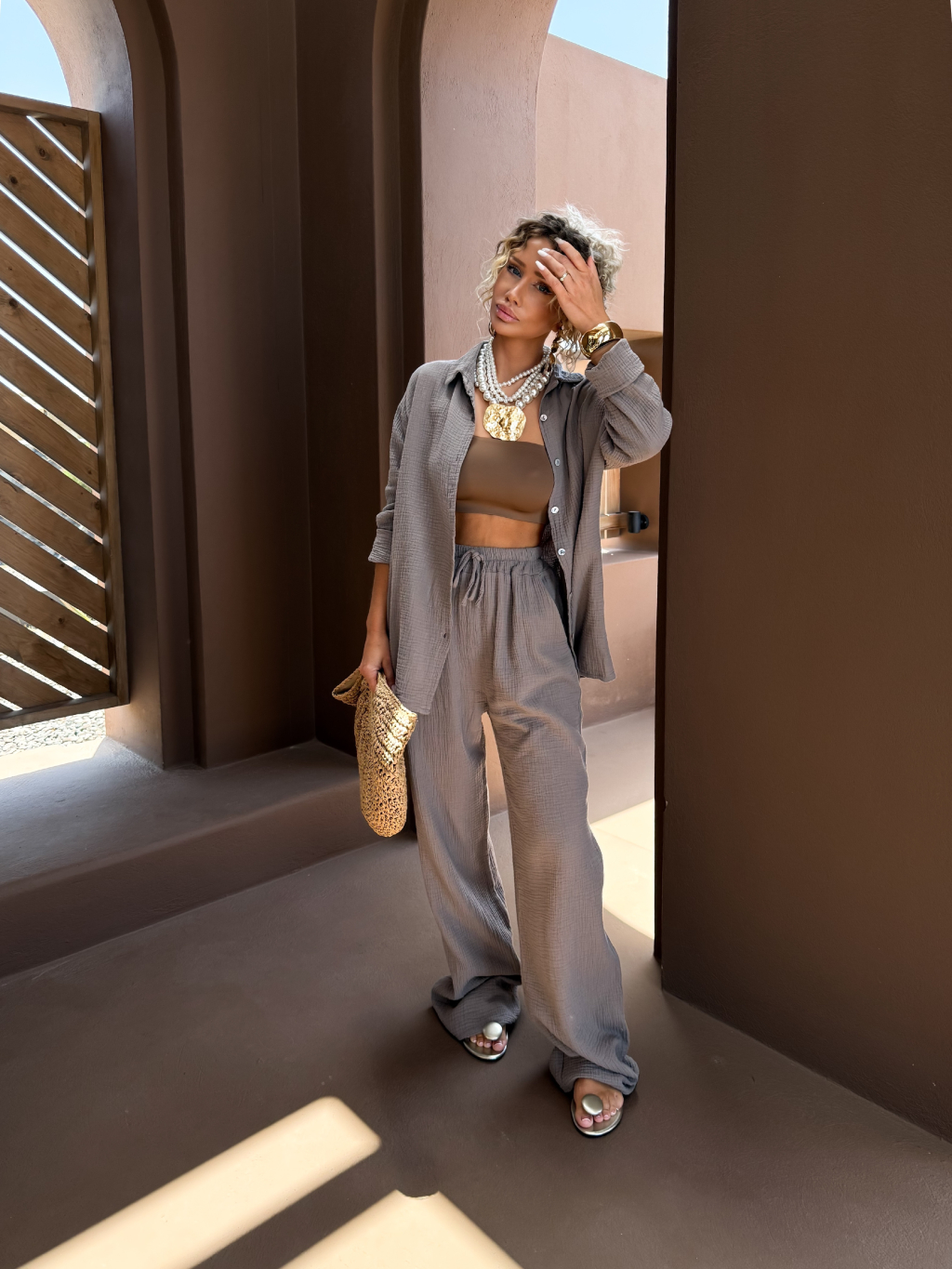Hnědý mušelínový kalhotový komplet THEIA s košilí