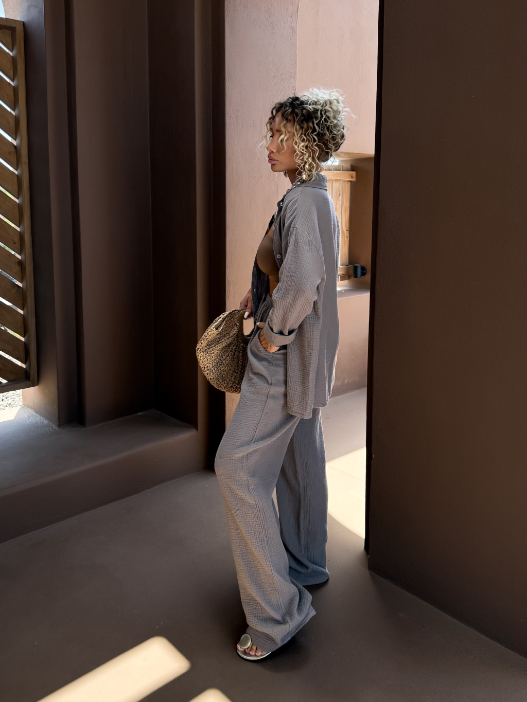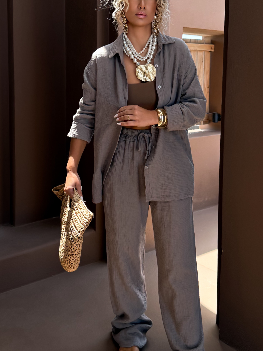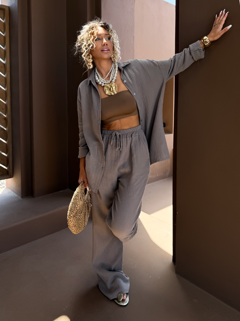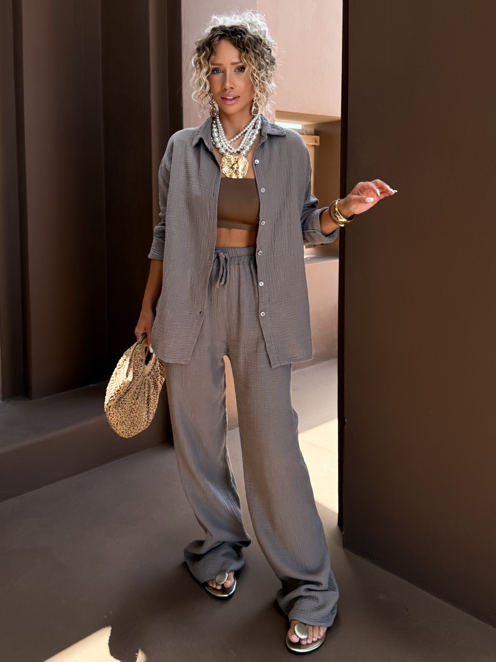Hnědý mušelínový kalhotový komplet THEIA s košilí
