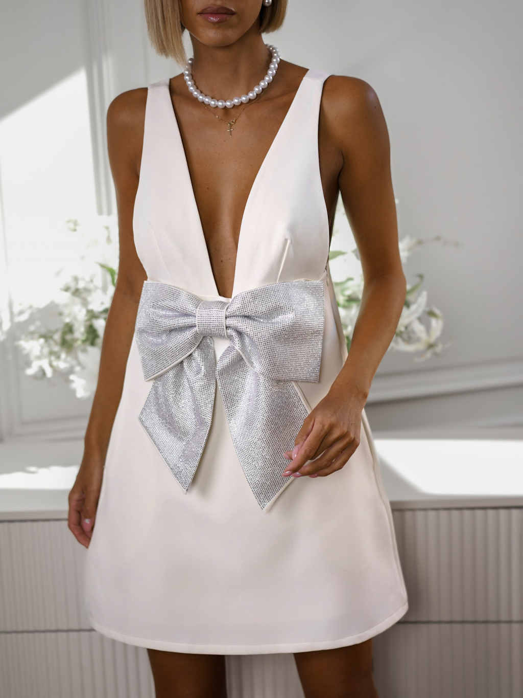 Bílé elegantní koktejlové šaty LUITAL s mašlí