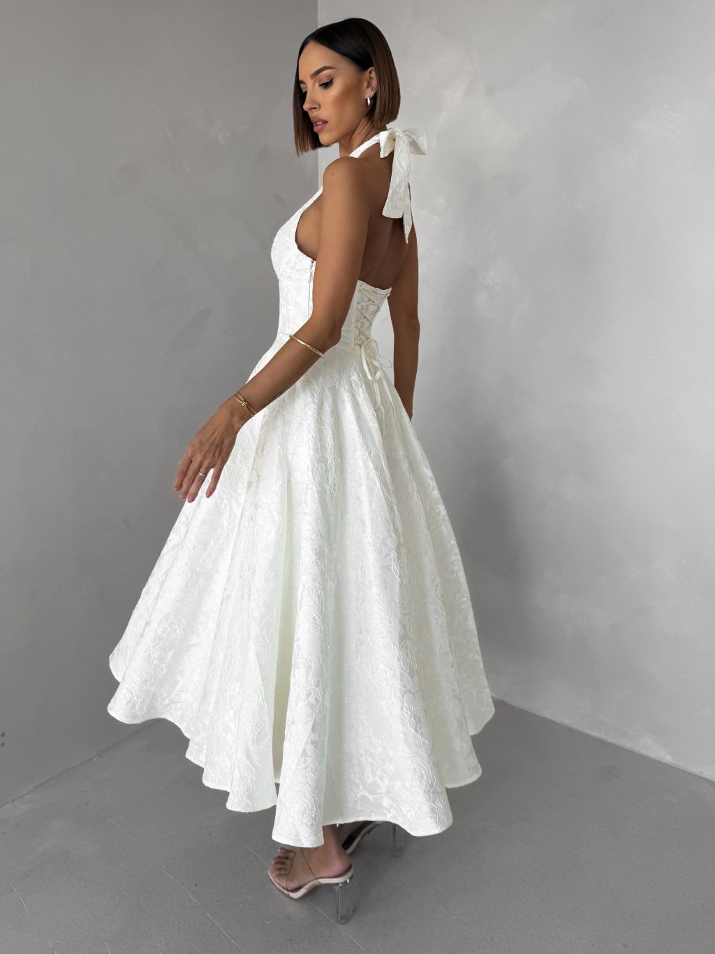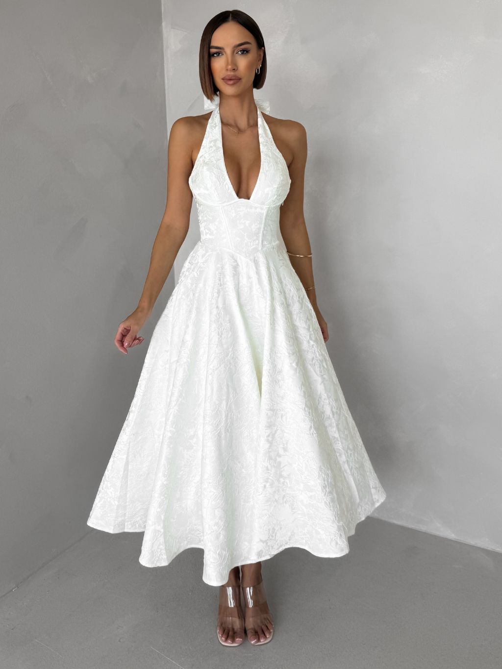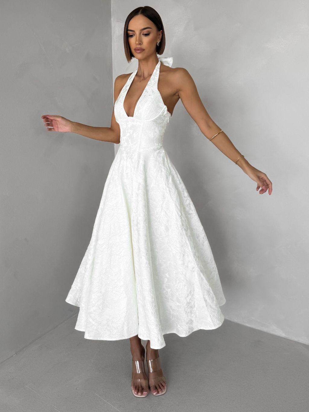 Bílé společenské vypasované áčkové midi šaty NYXORA