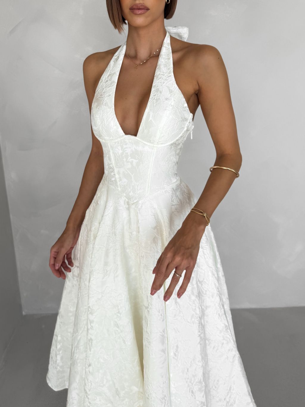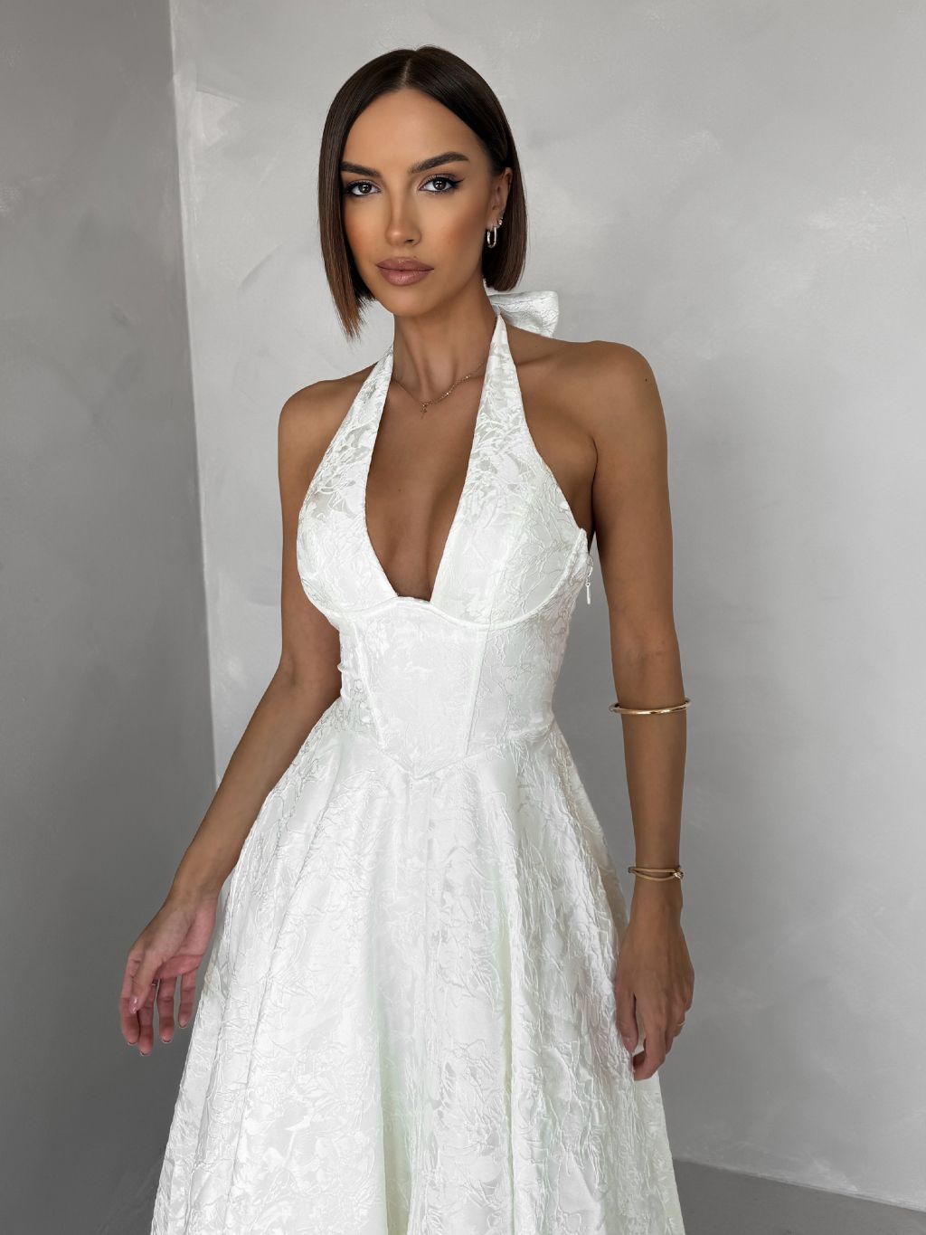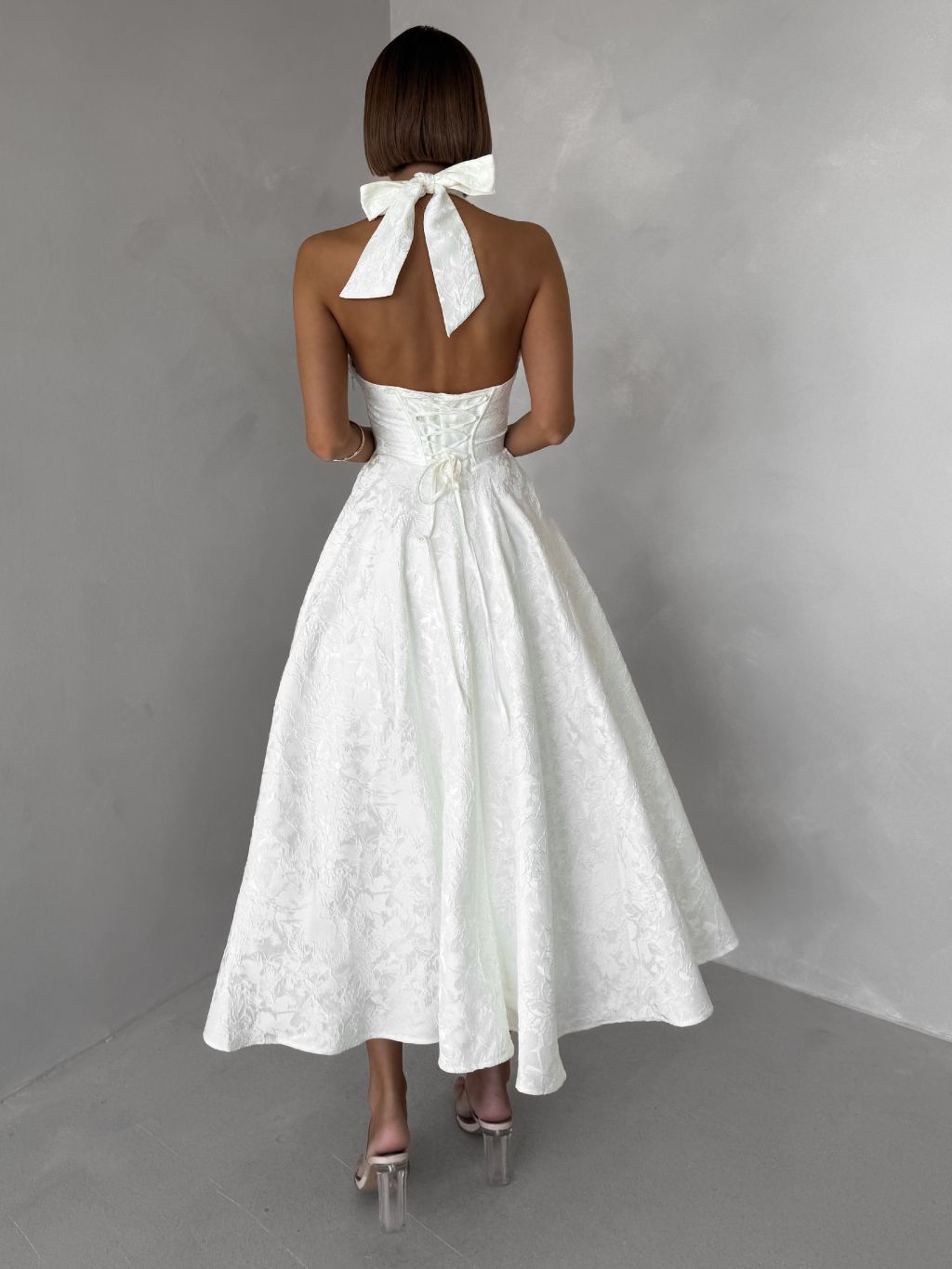 Bílé společenské vypasované áčkové midi šaty NYXORA