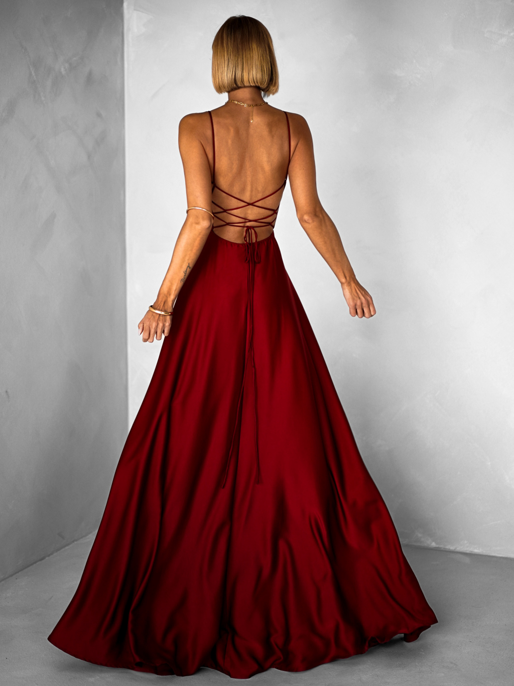Bordó dlouhé plesové šaty CELLINES se šněrováním a rozparkem