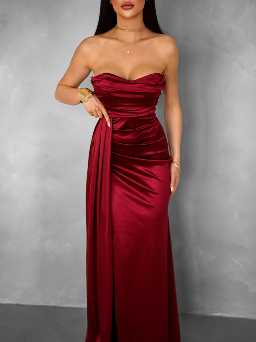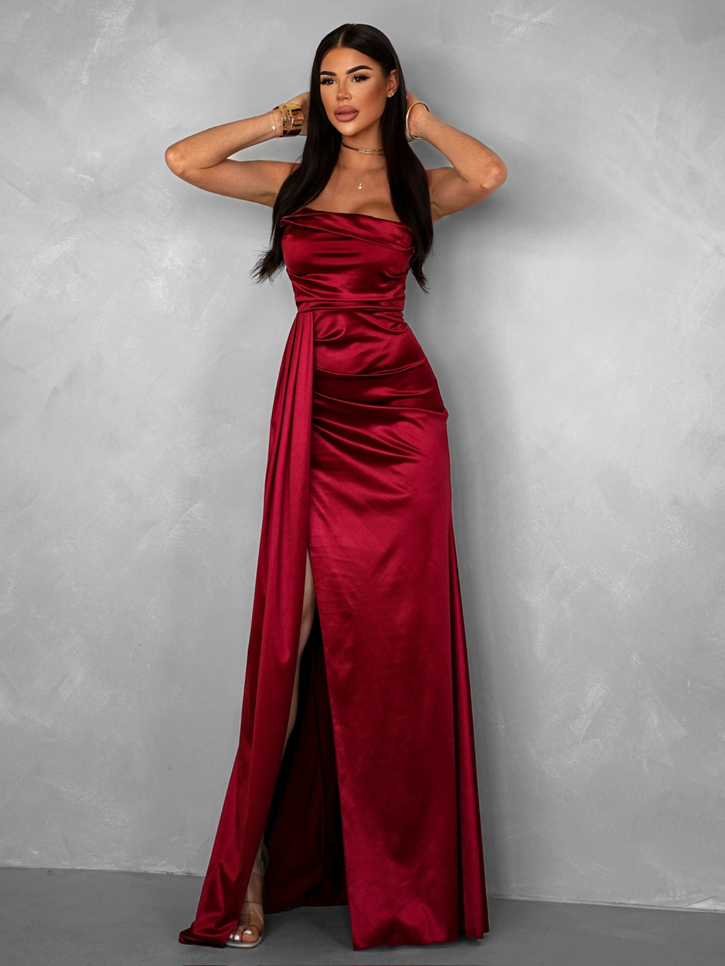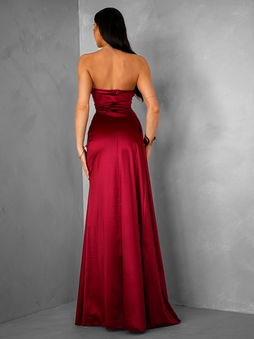 Bordó dlouhé saténové šaty ALITAN s korzetem