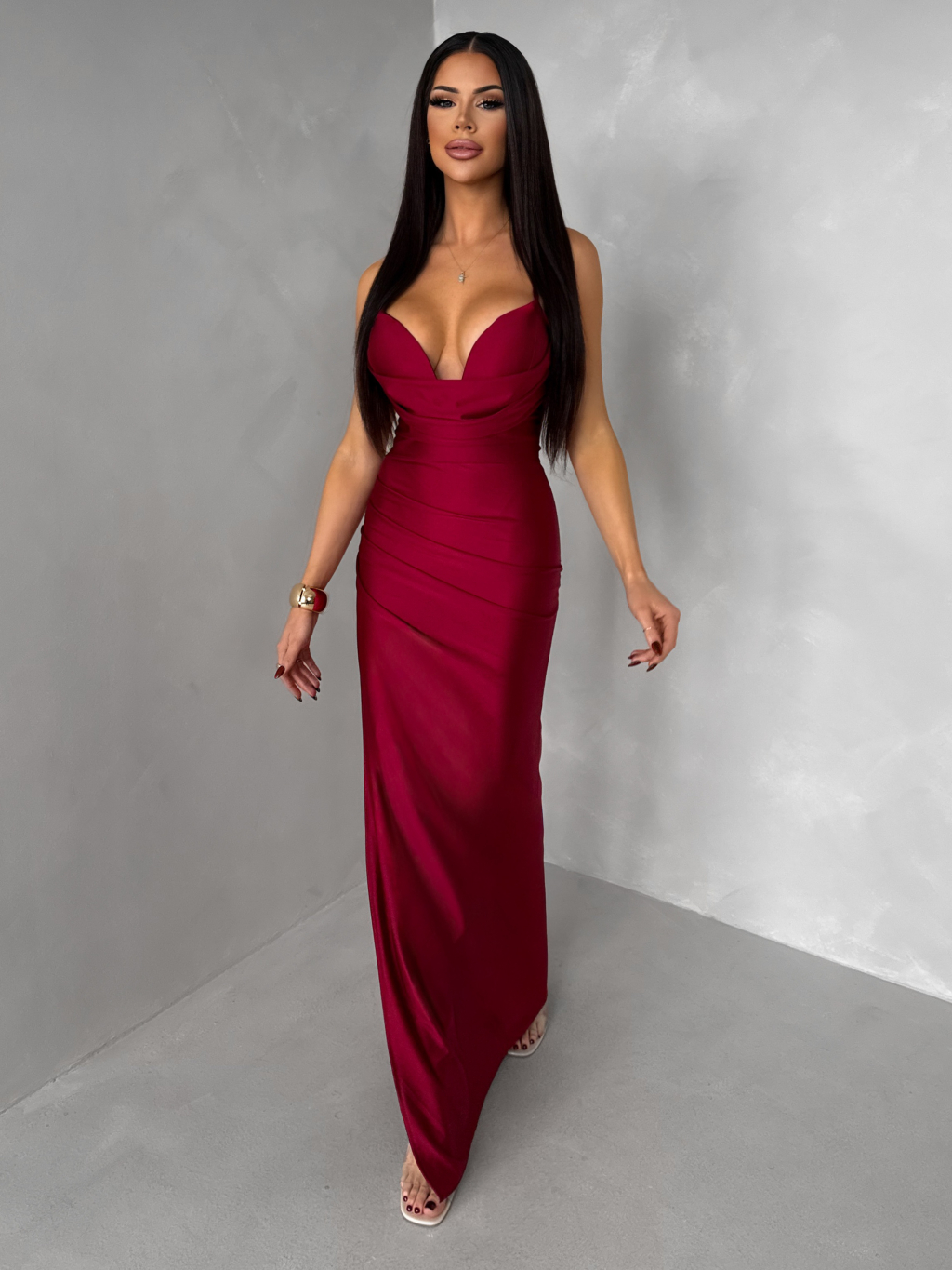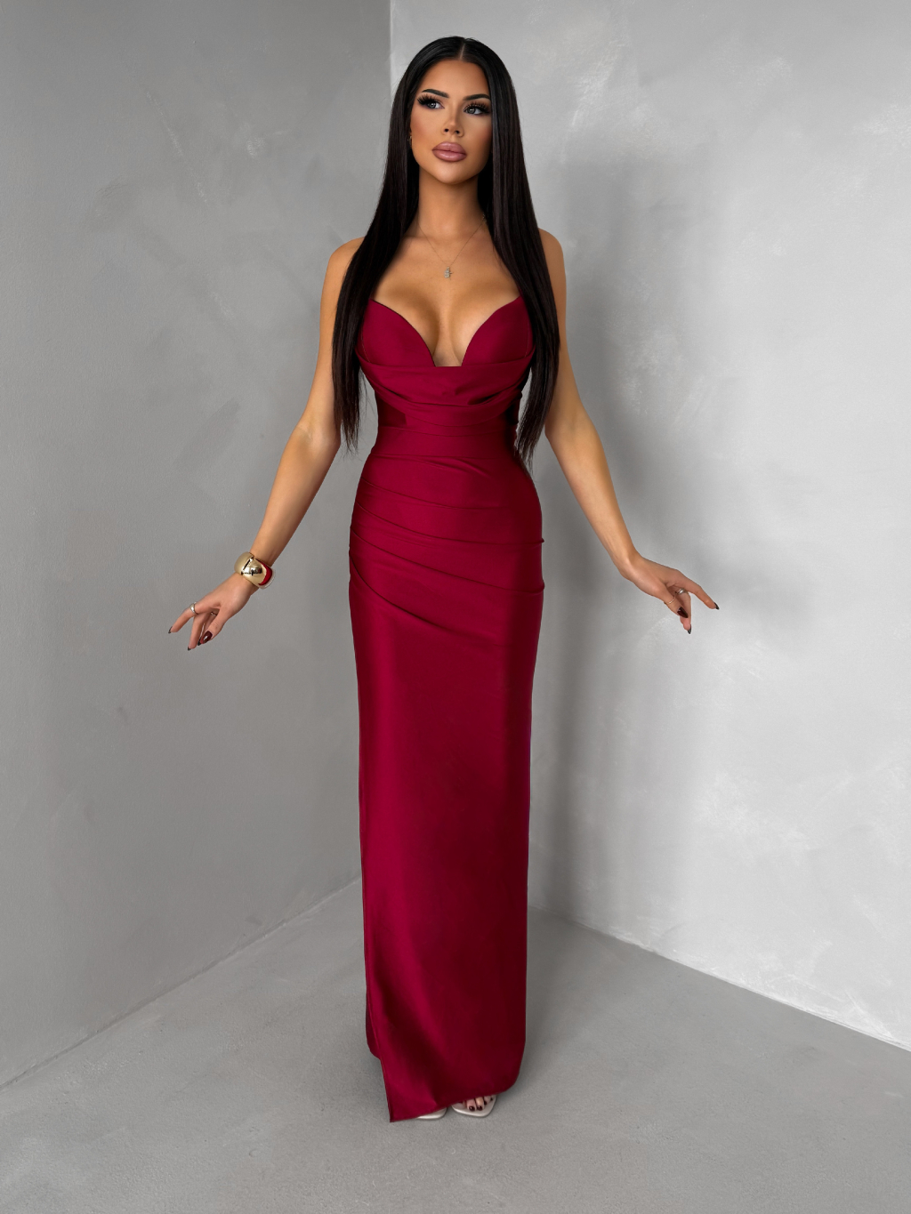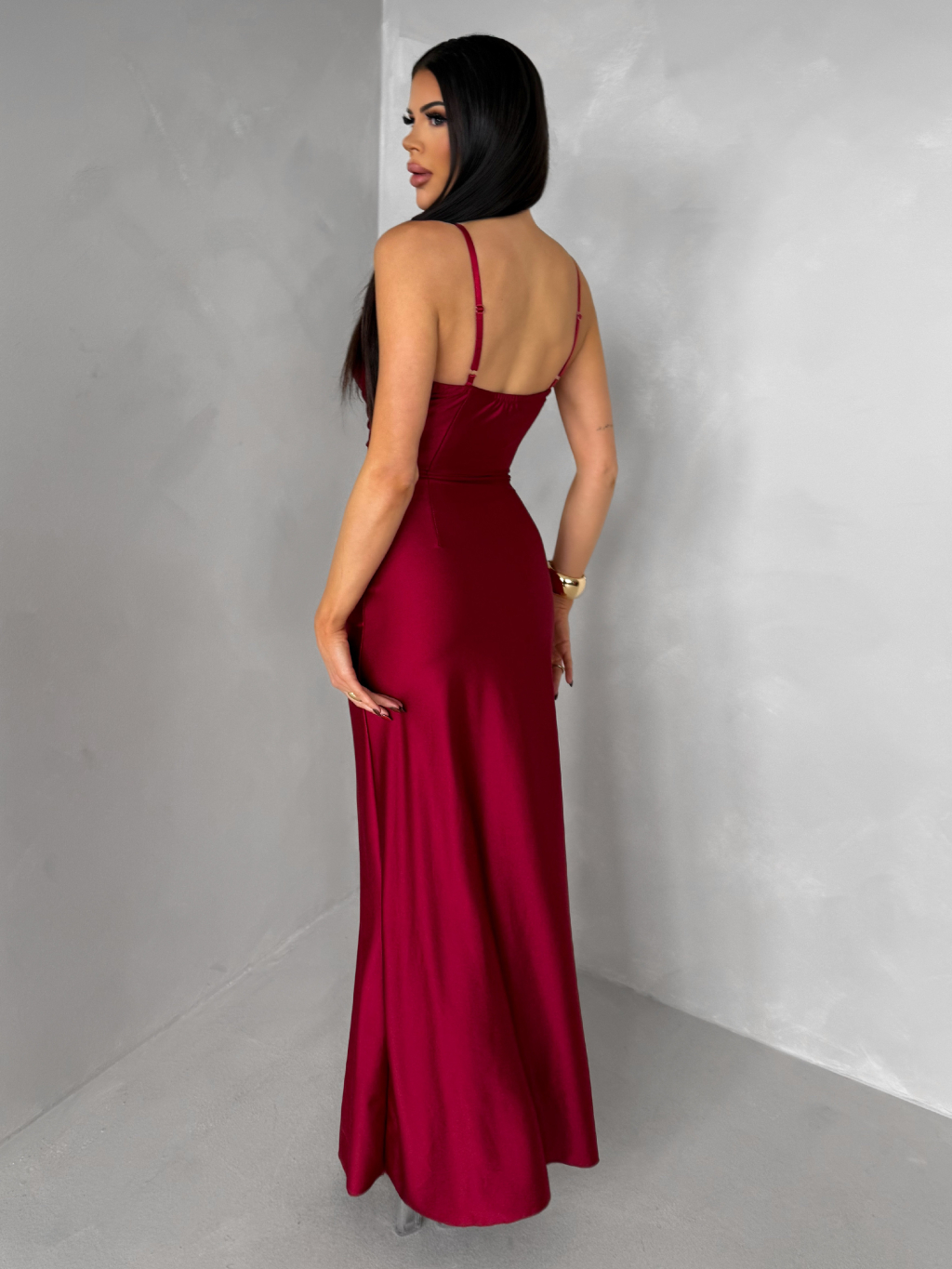 Bordó dlouhé saténové společenské šaty ORIXY s výstřihem