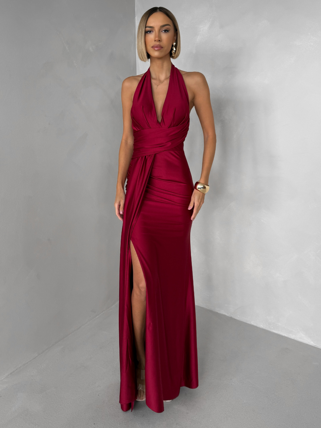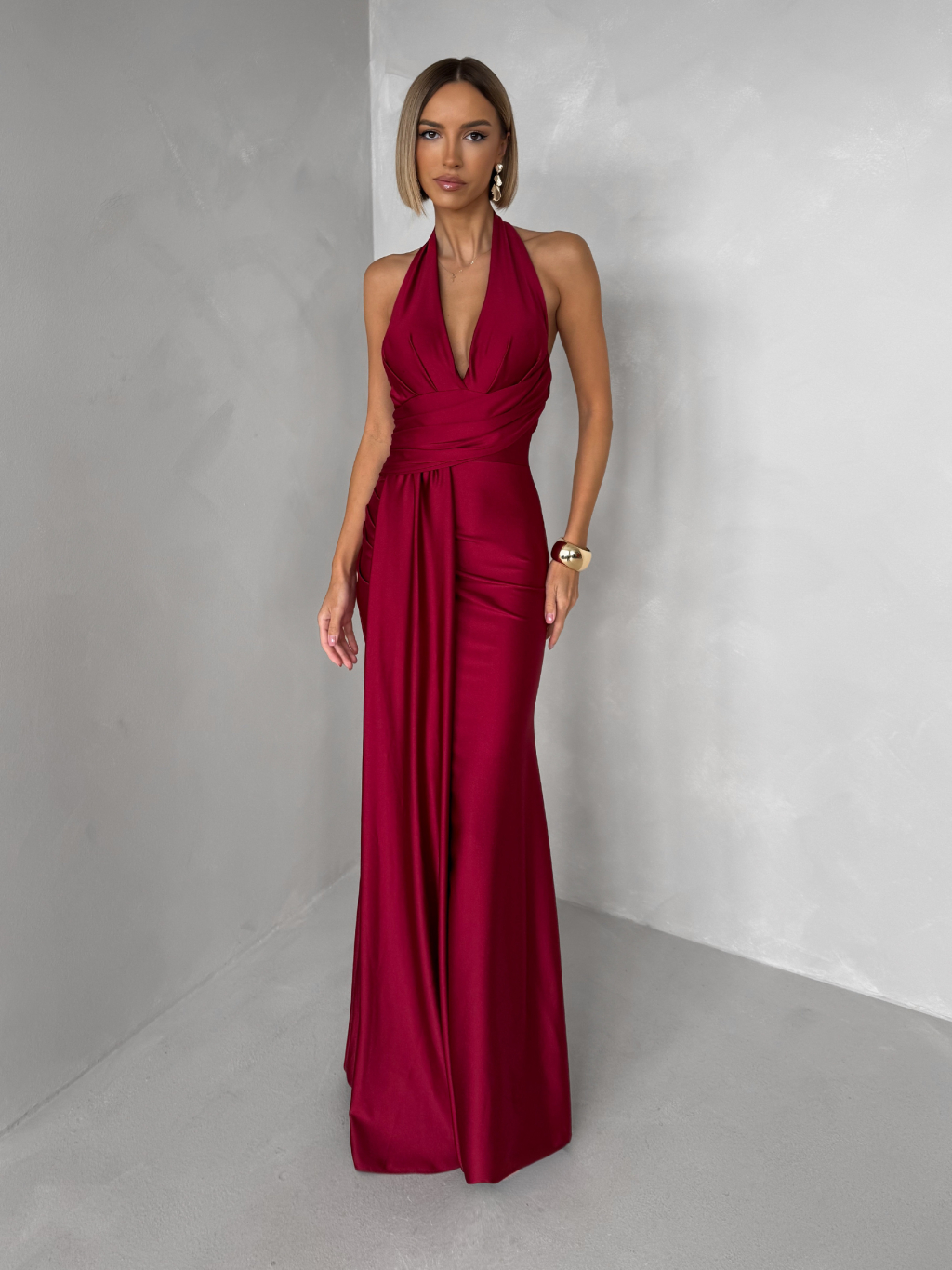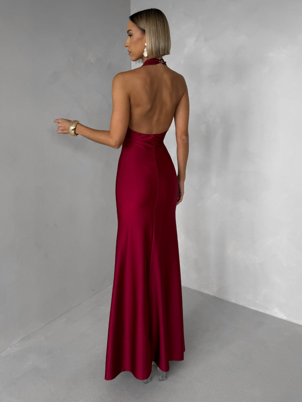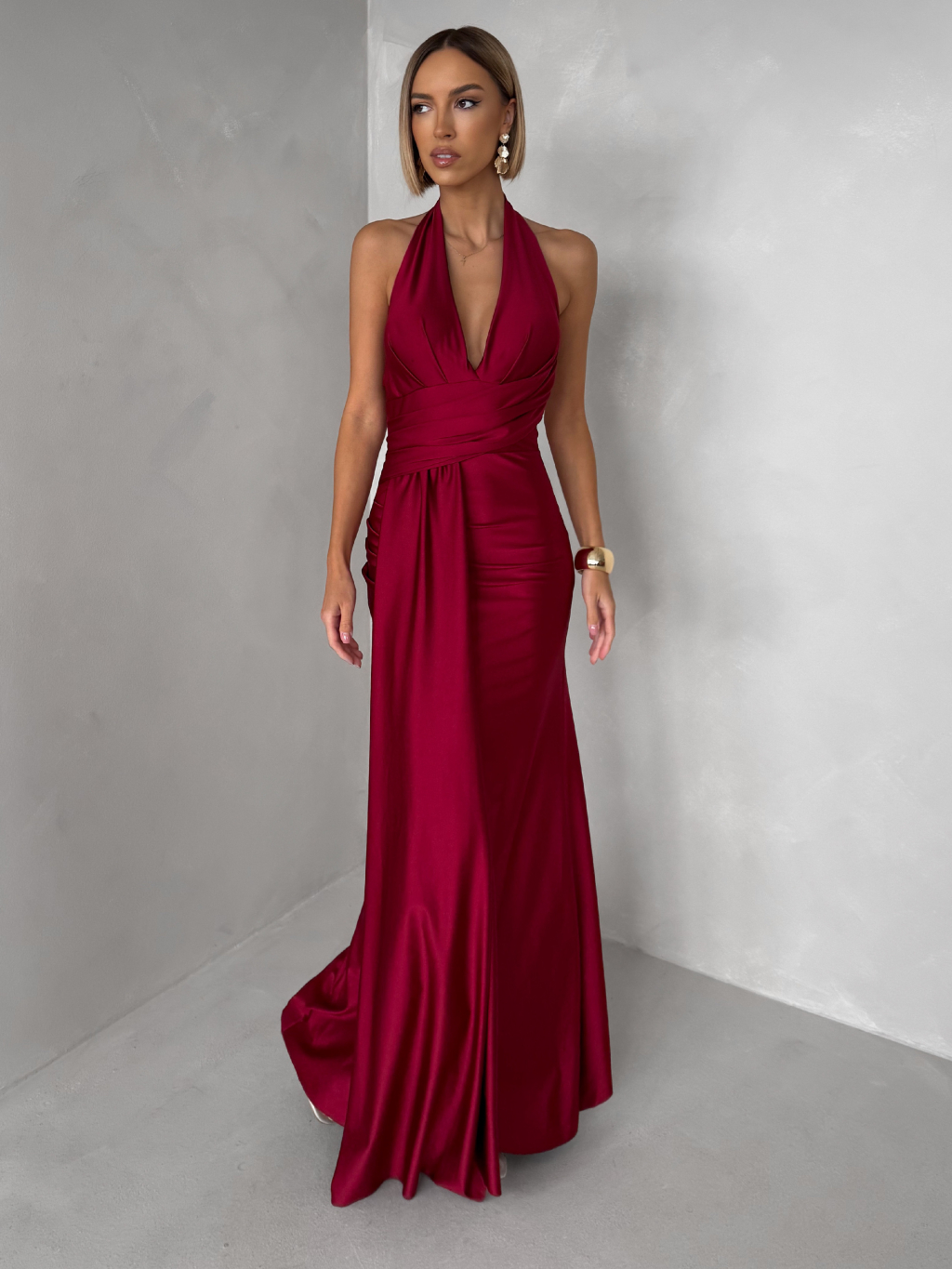Bordó saténové dlouhé společenské šaty CELESTIA s vlečkou