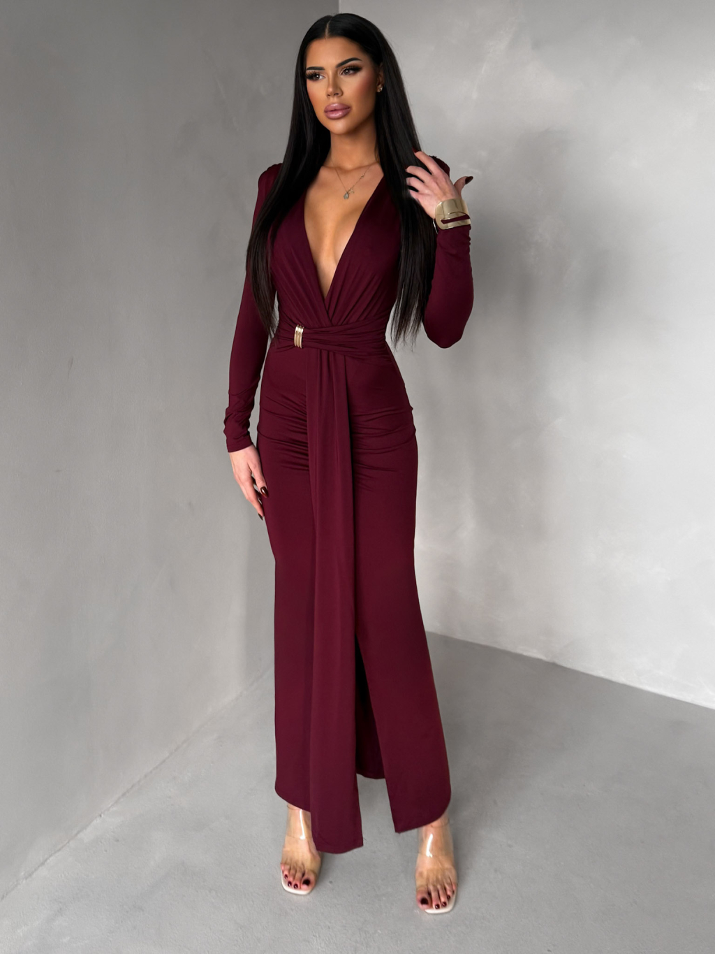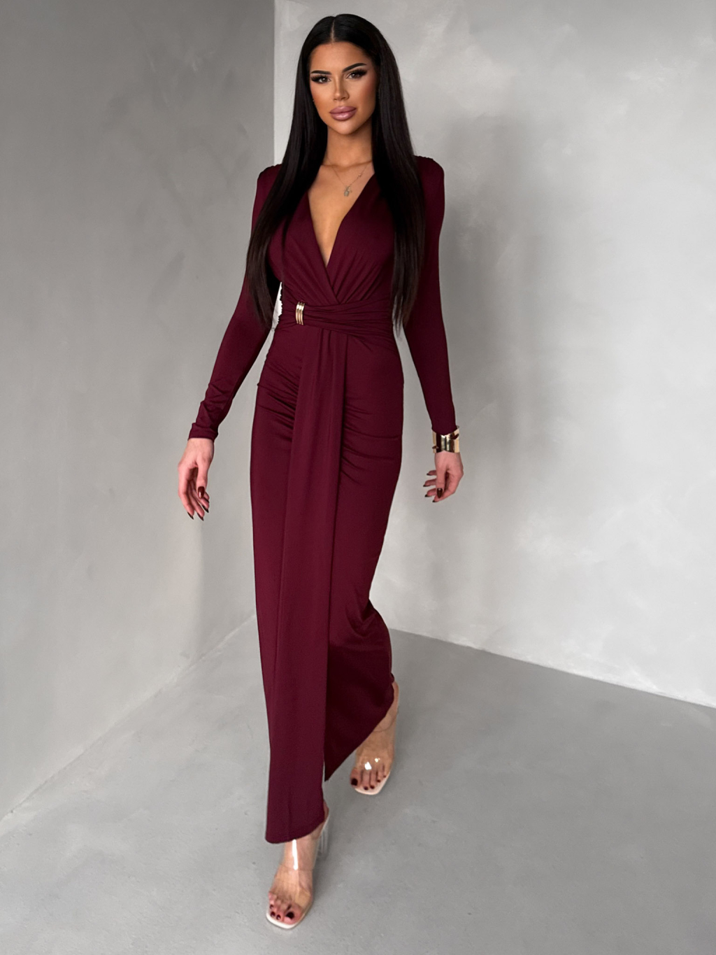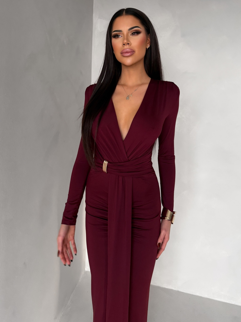 Bordó společenské dlouhé šaty FAYLORI s hlubokým výstřihem