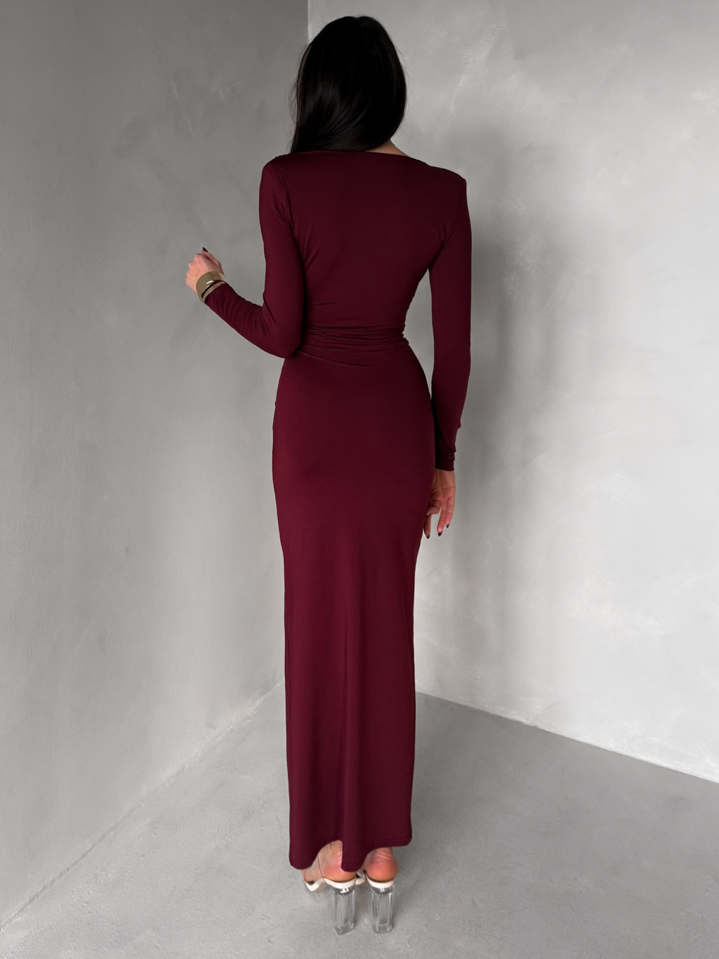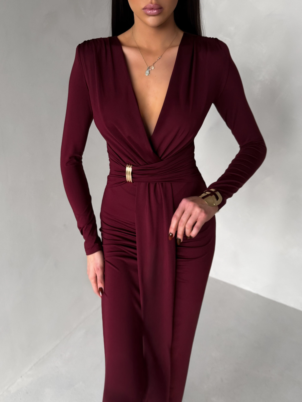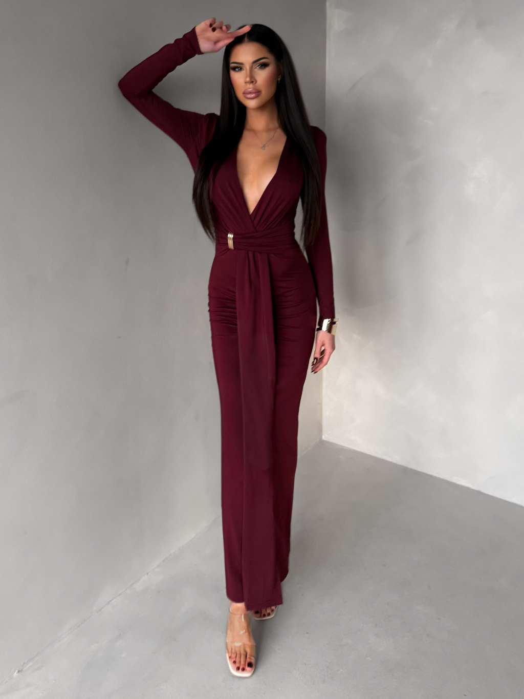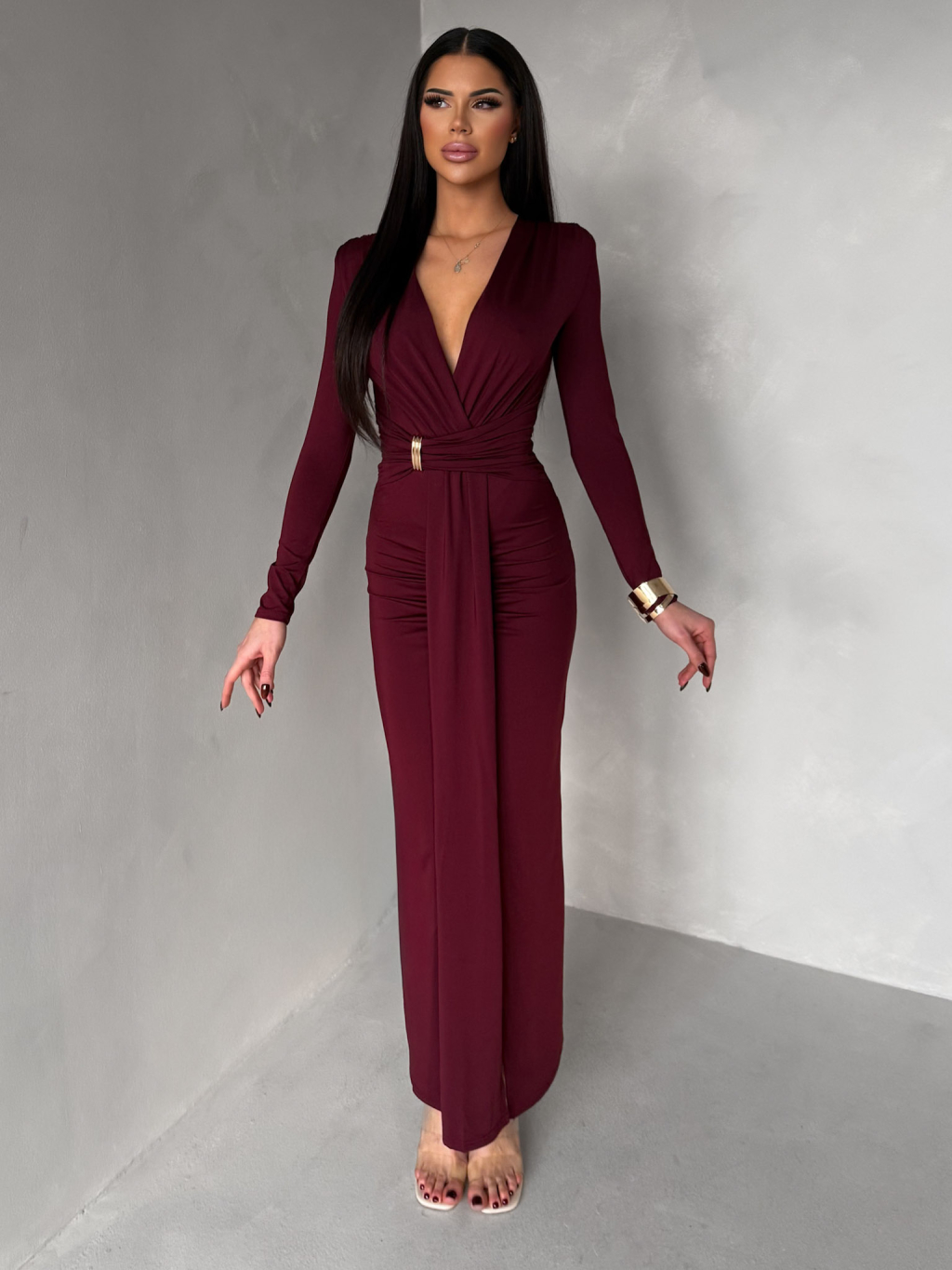 Bordó společenské dlouhé šaty FAYLORI s hlubokým výstřihem
