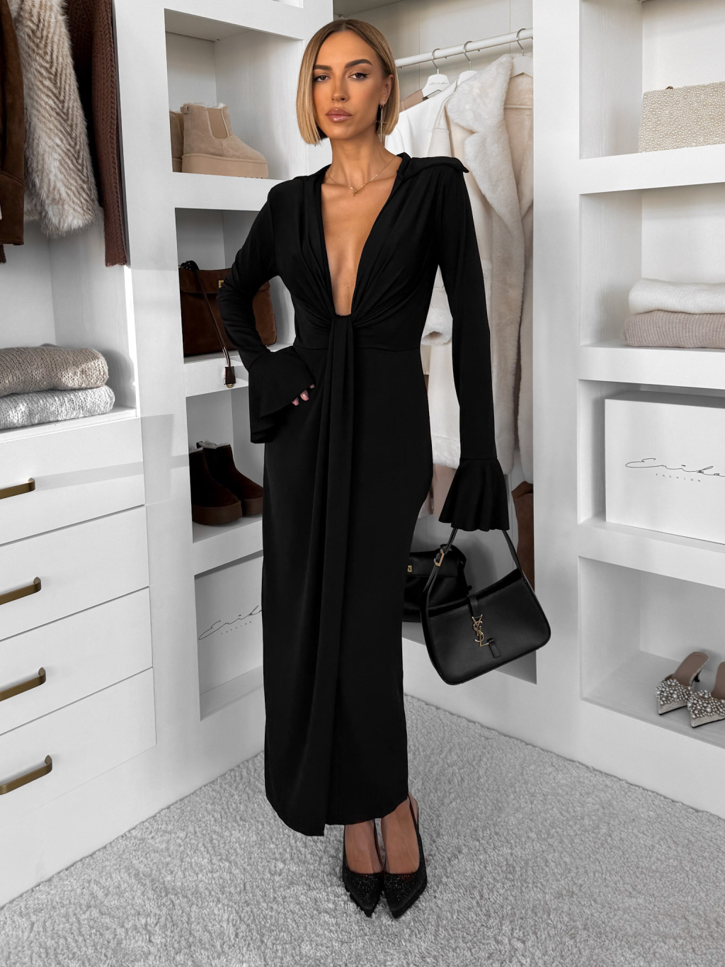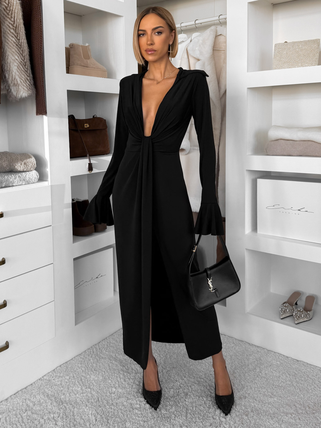 Černé dlouhé šaty OSTIVEN s hlubovým výstřihem