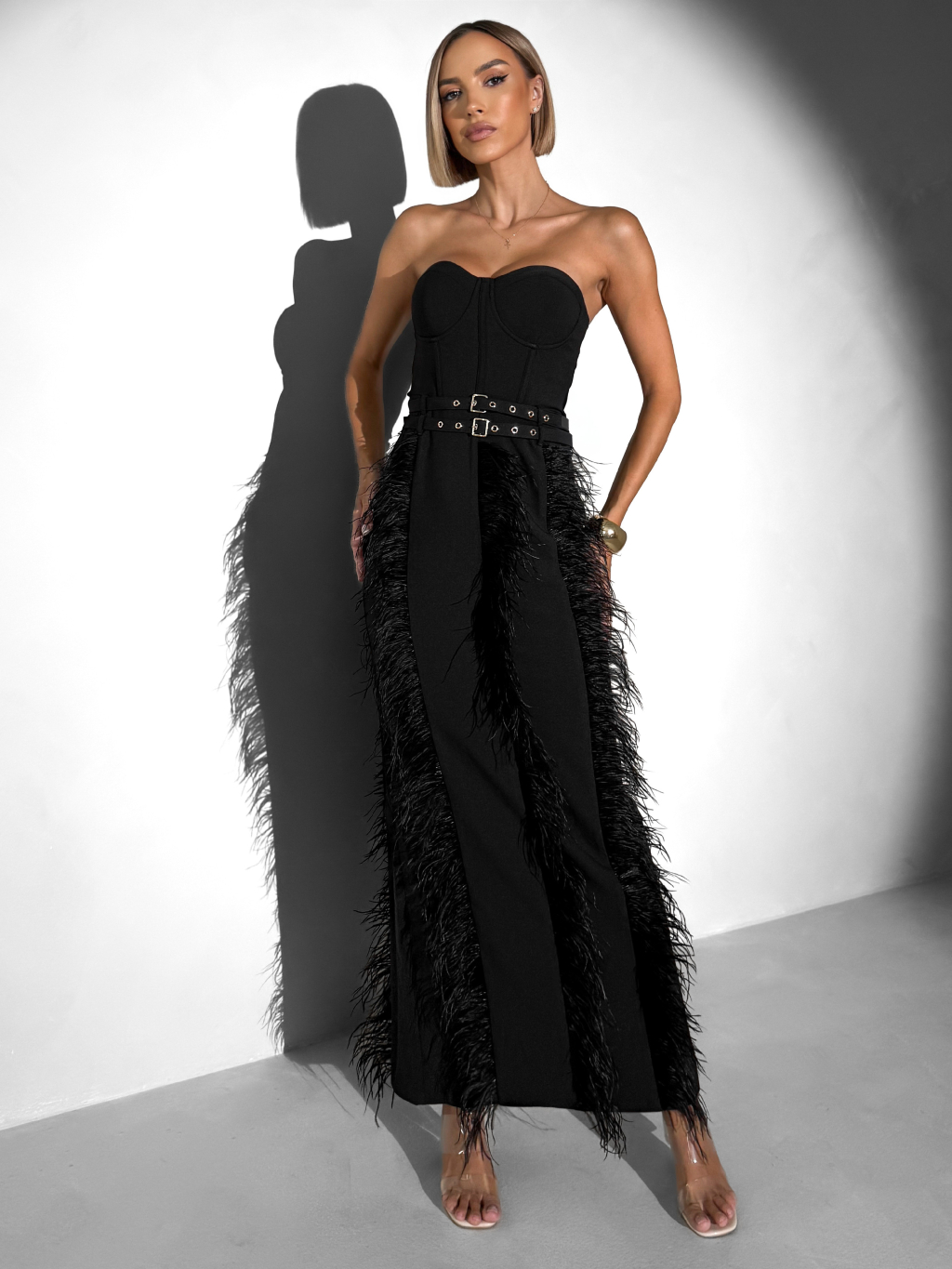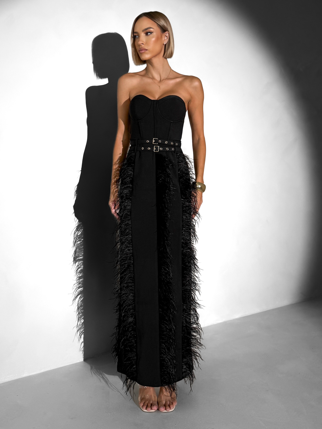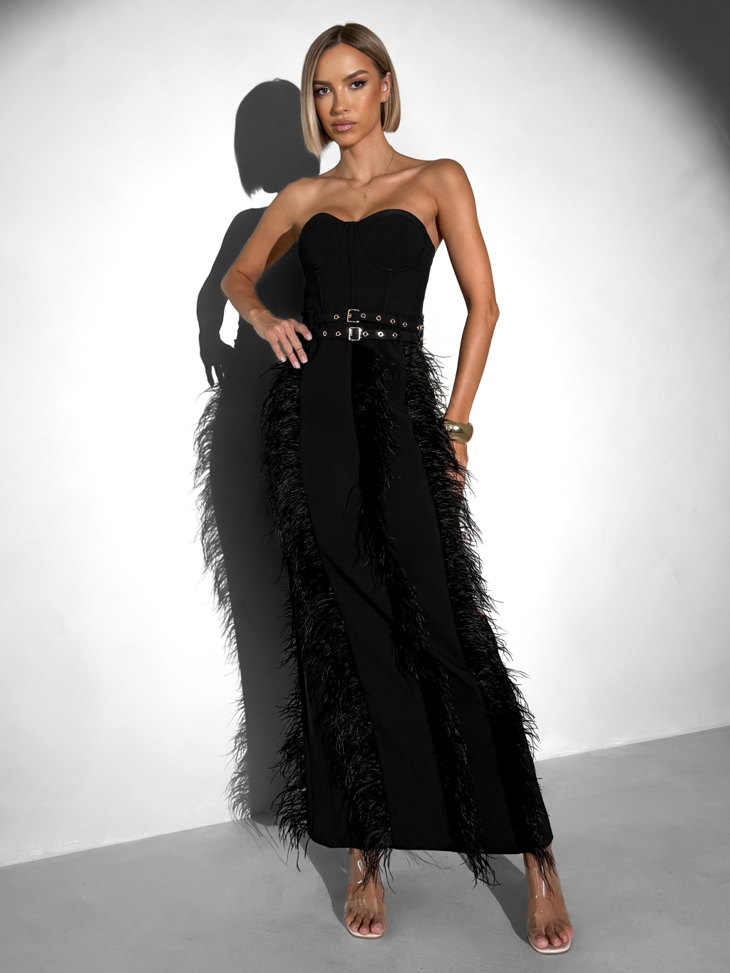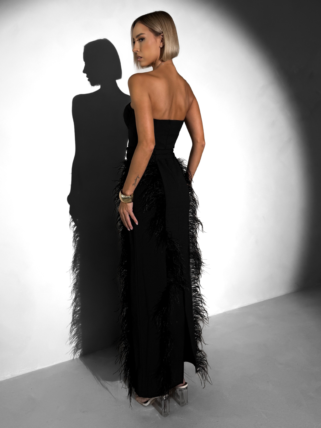 Černé elegantní vypasované šaty TERINIA s peříčky