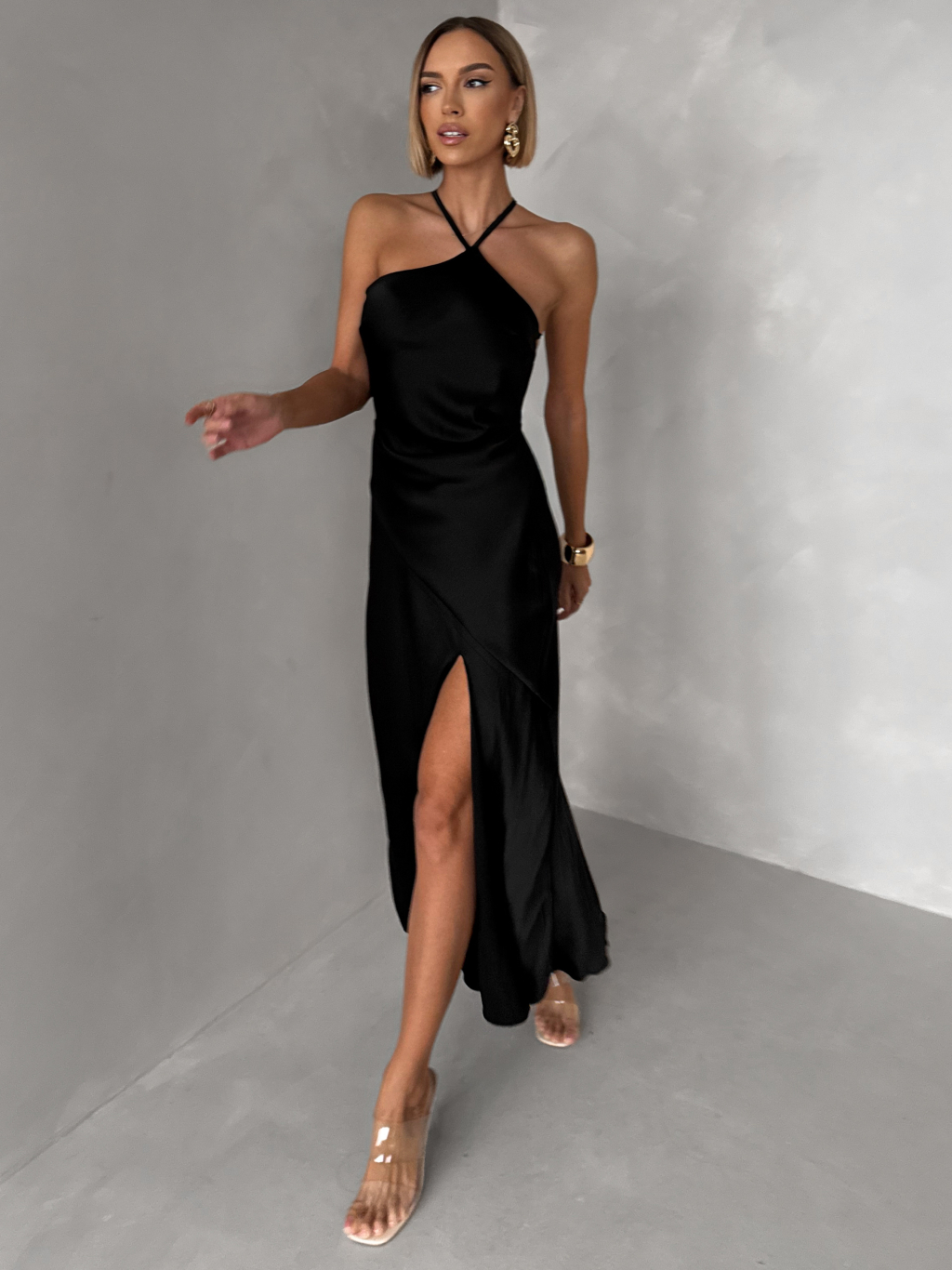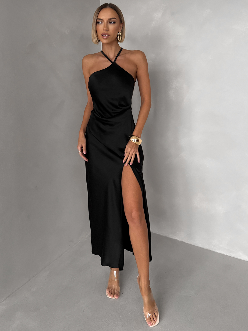 Černé saténové společenské šaty ELIRON s rozparkem