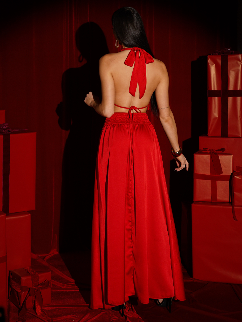 Červené saténové dlouhé šaty FANDARI s výstřihem