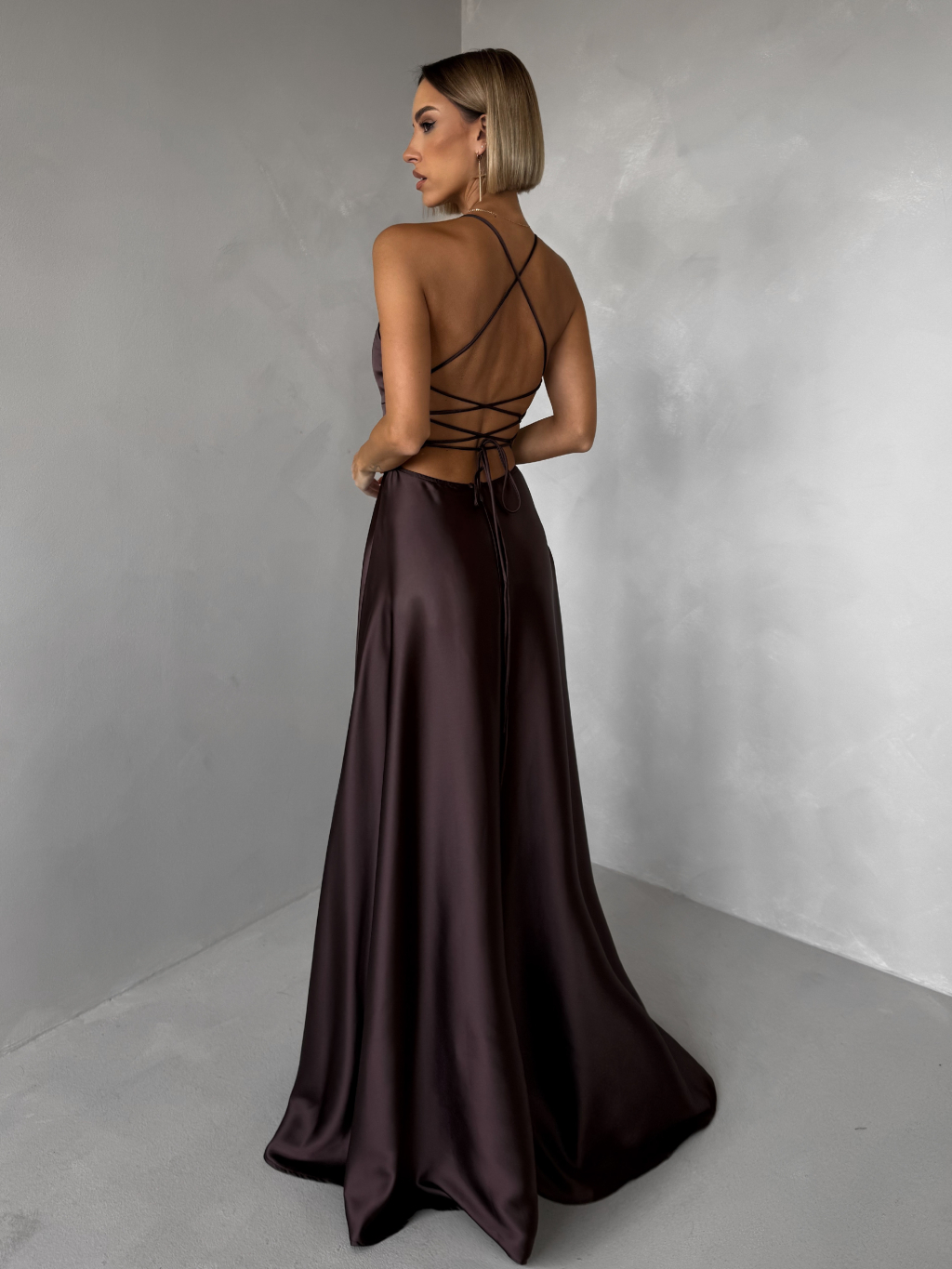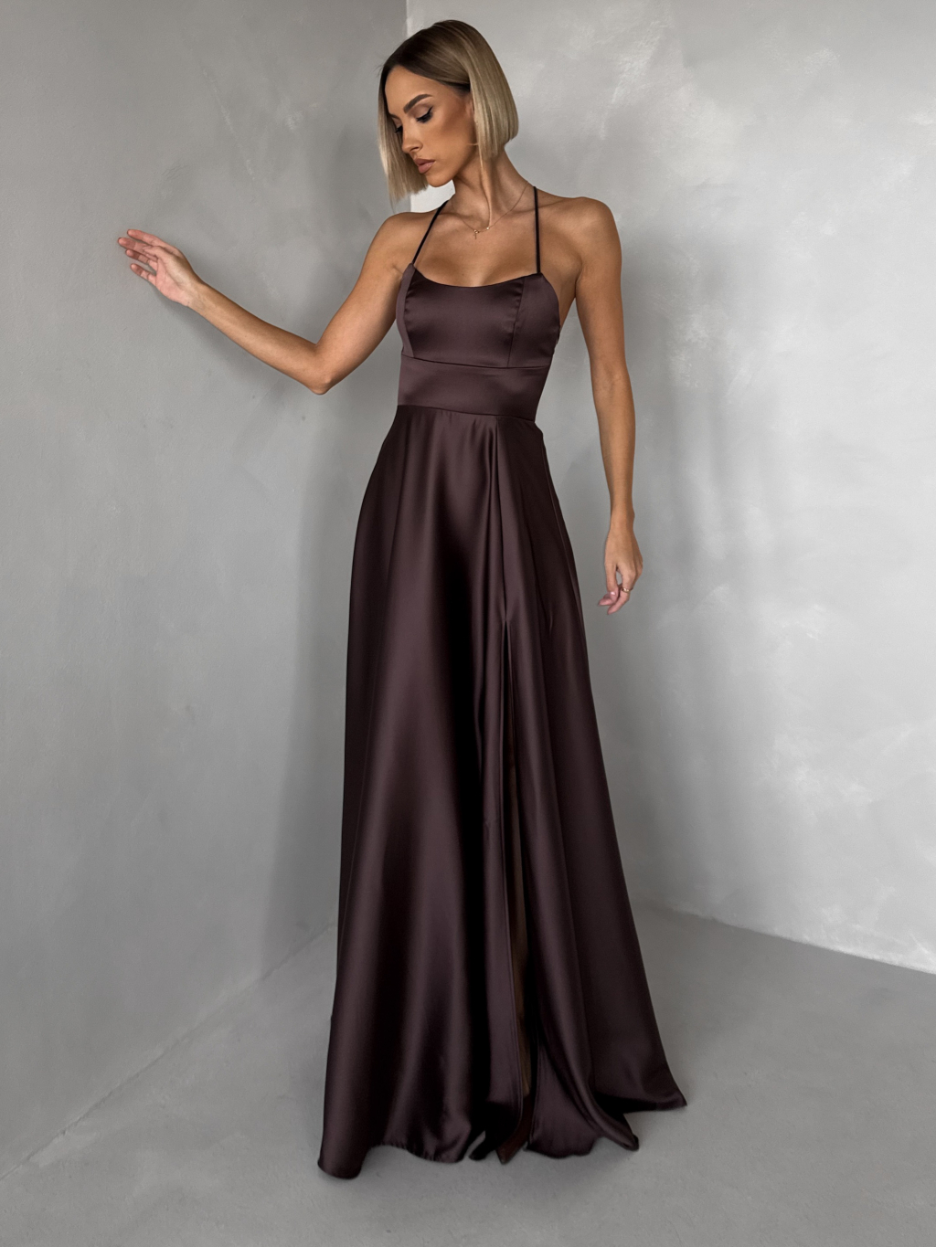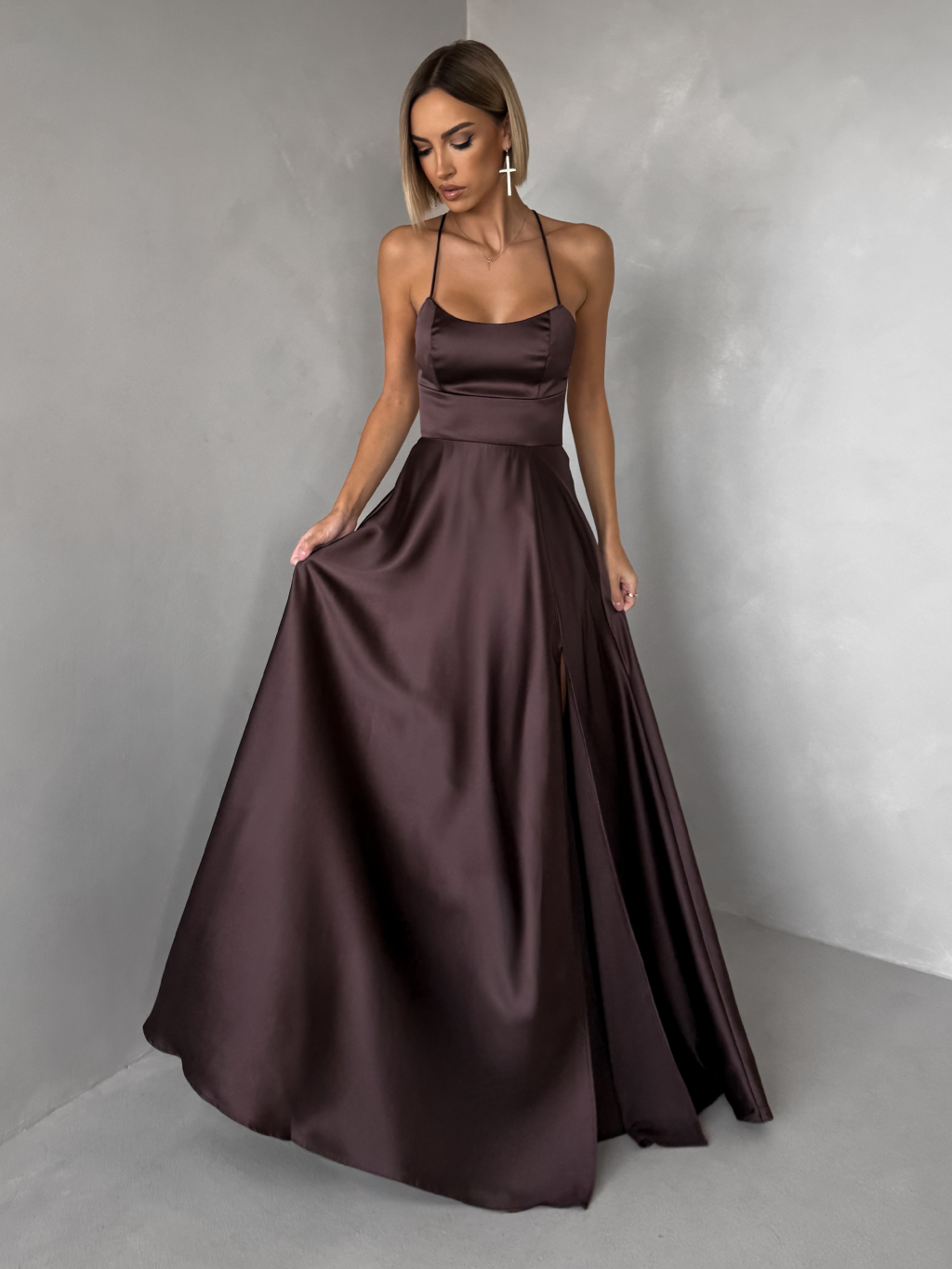 Hnědé dlouhé plesové společenské šaty CELLINES se šněrováním a rozparkem