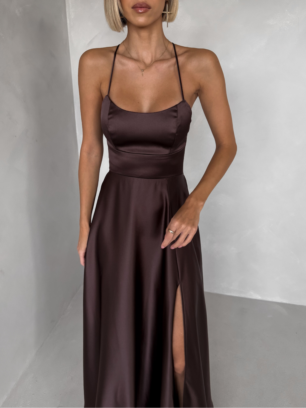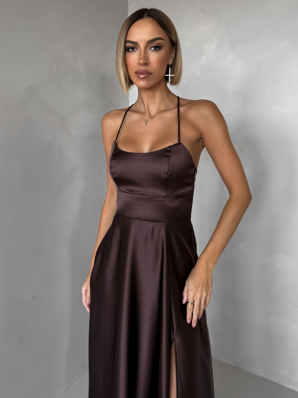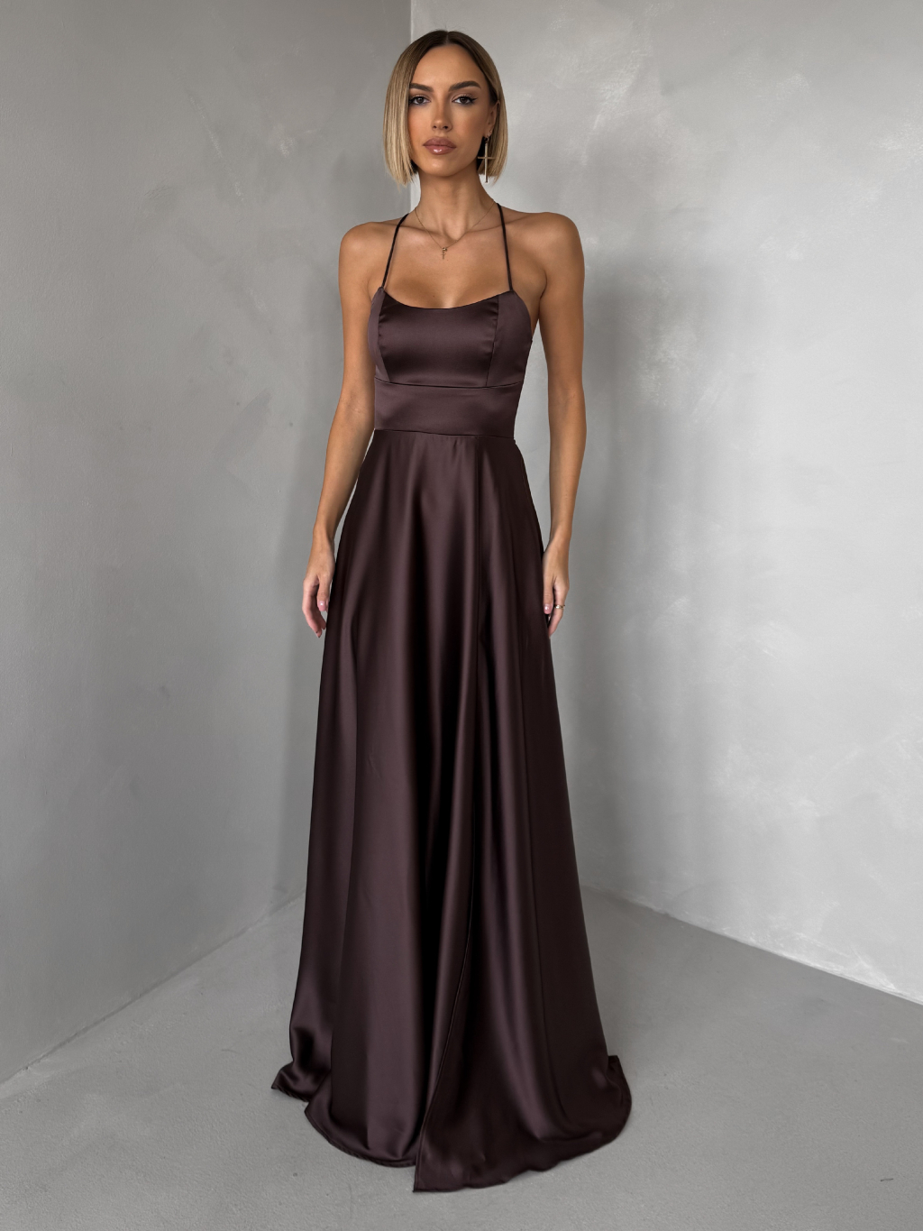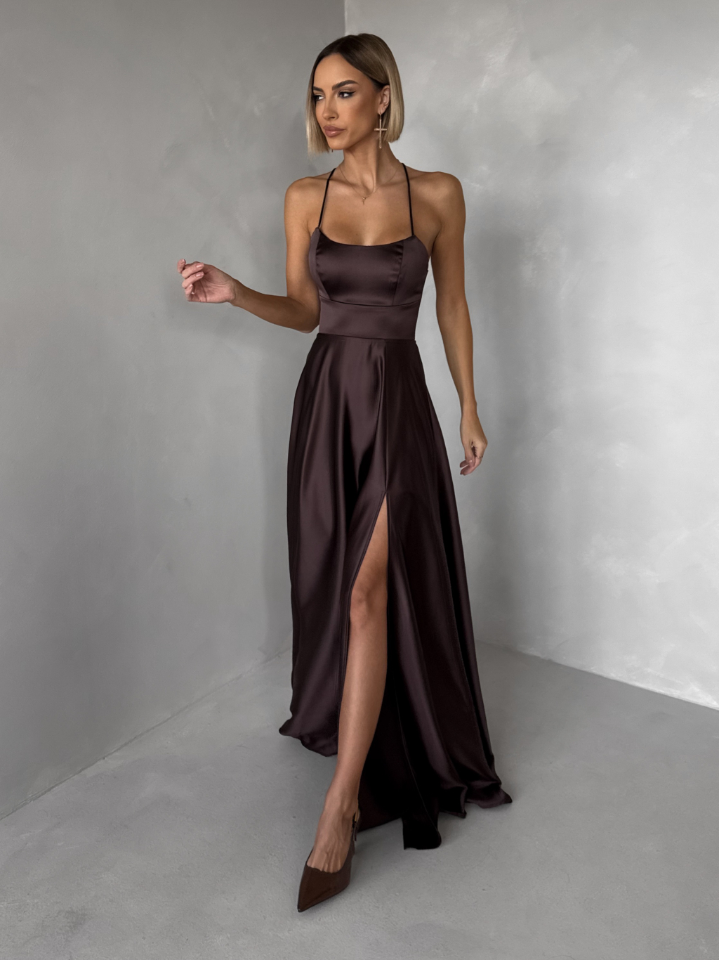Hnědé dlouhé plesové společenské šaty CELLINES se šněrováním a rozparkem