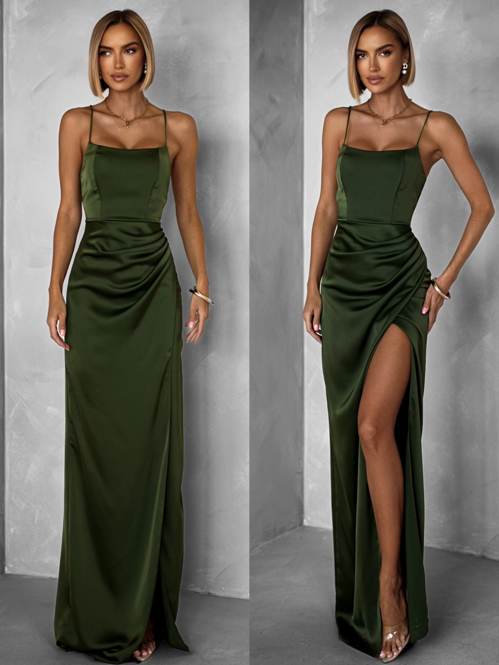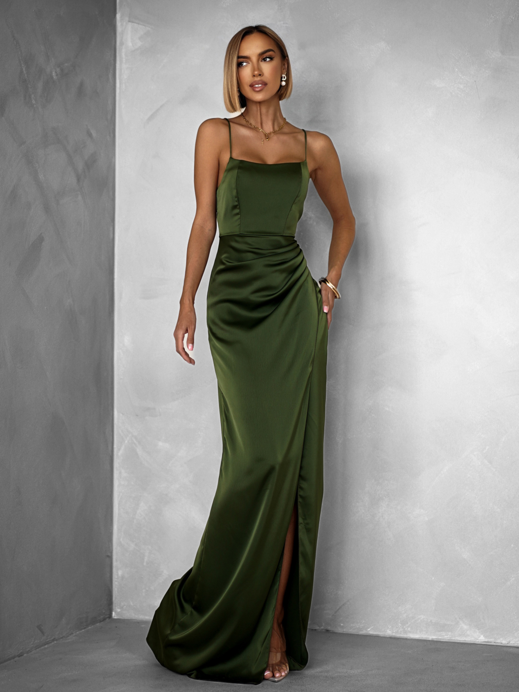 Khaki dlouhé saténové šaty CONNOR s rozparkem