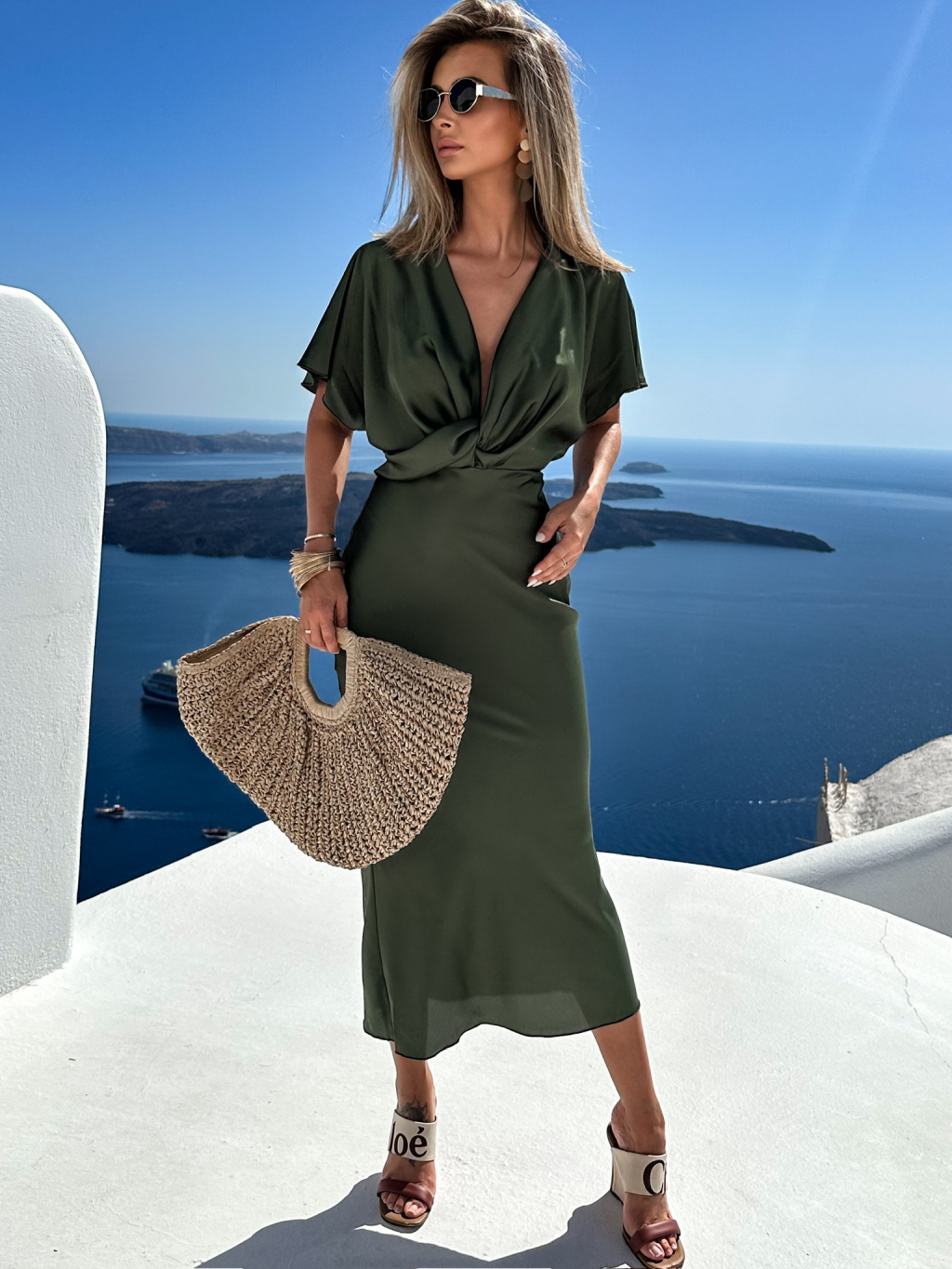 Khaki saténové šaty MIRIAM s krátkým rukávem