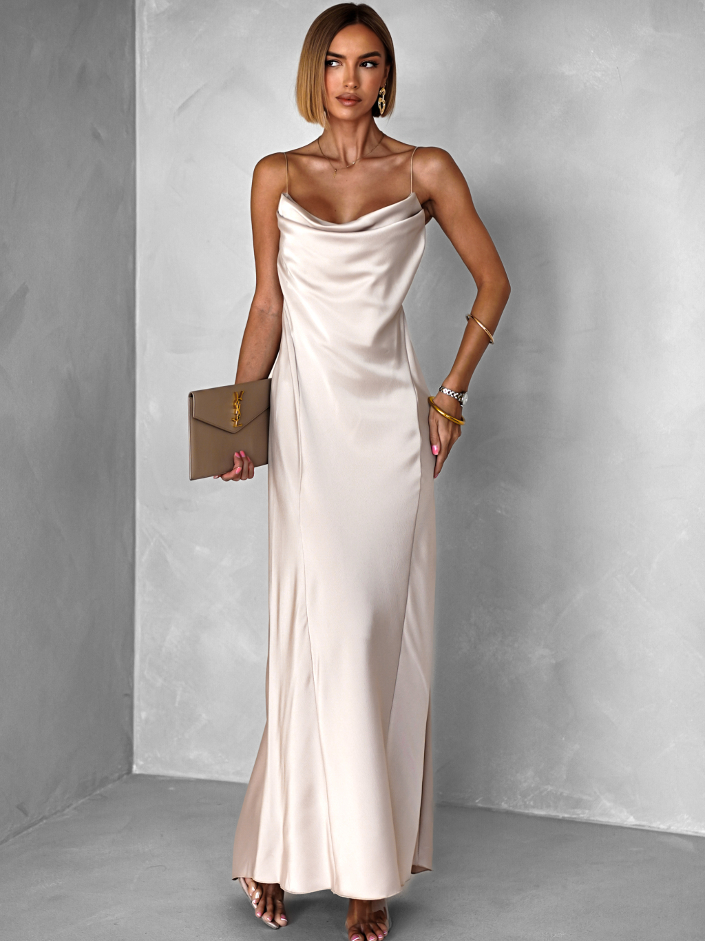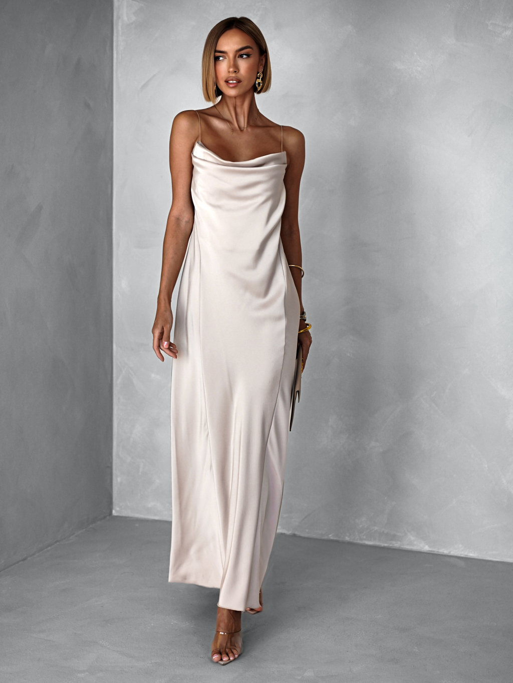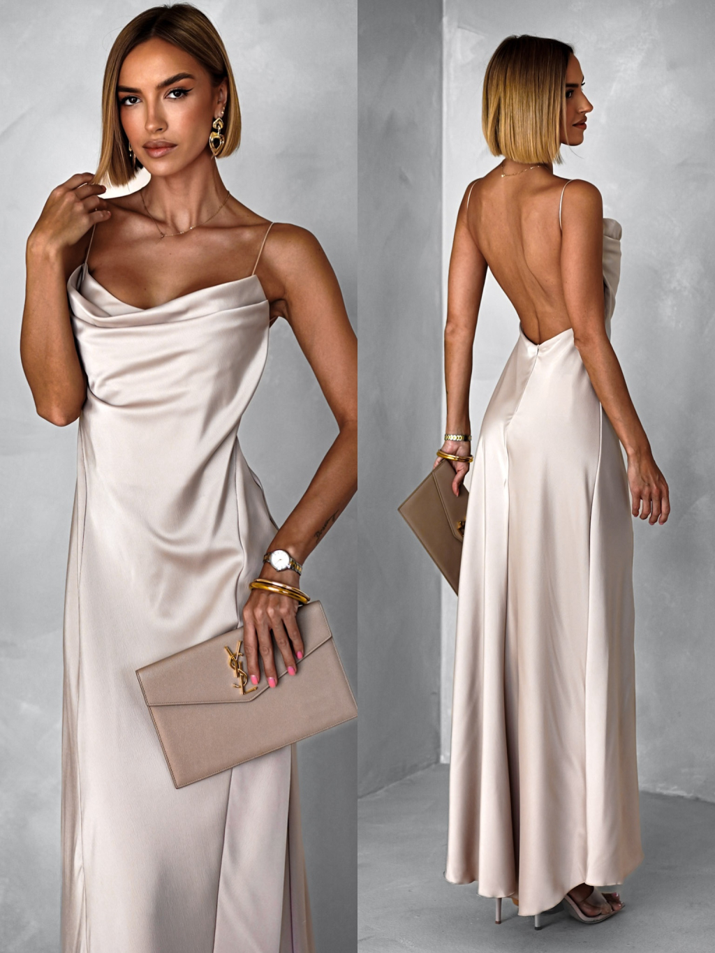 Krémové dlouhé saténové šaty UNUTA na ramínka