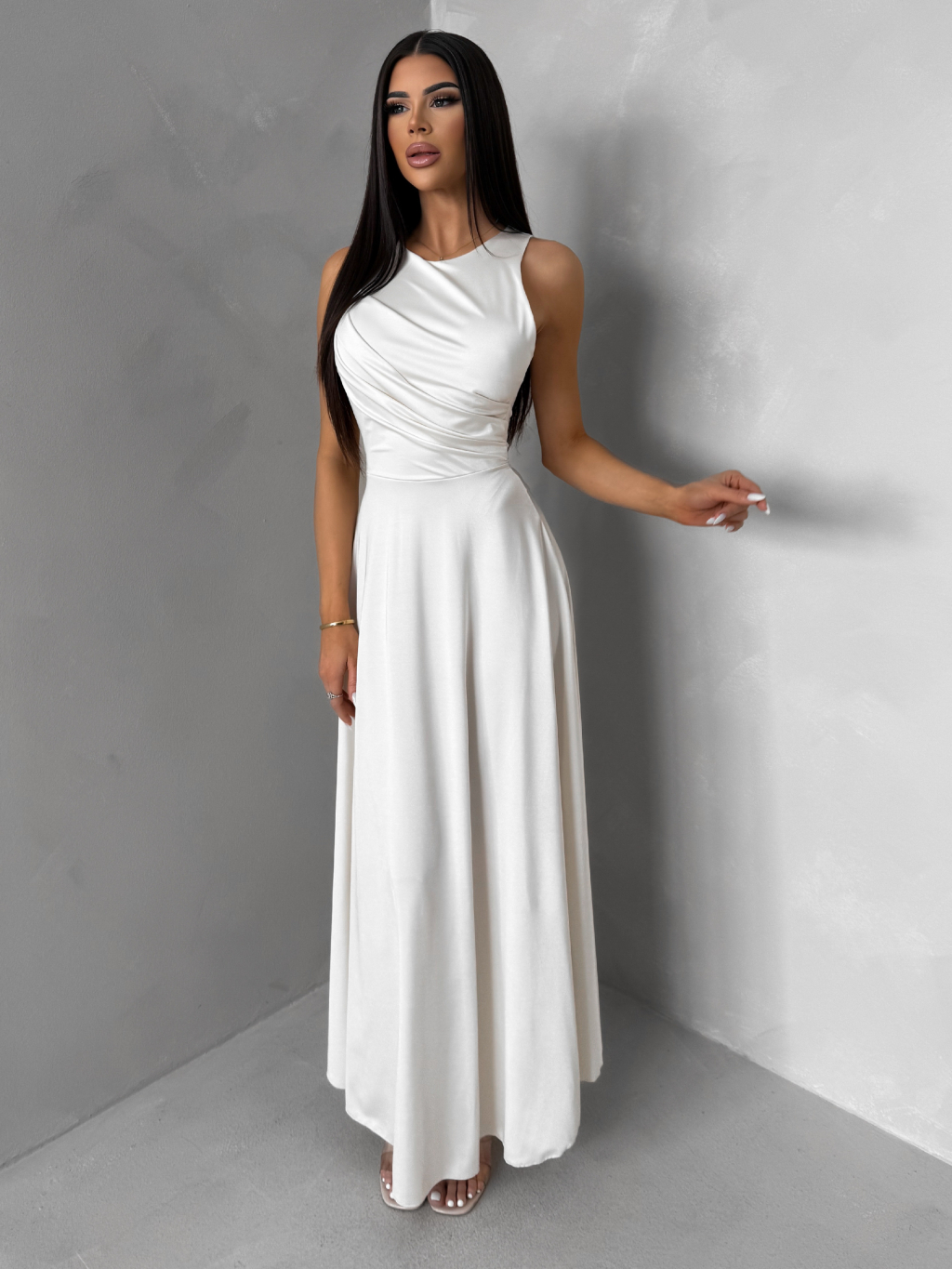 Krémové společenské jednoduché dlouhé šaty TEMIRA